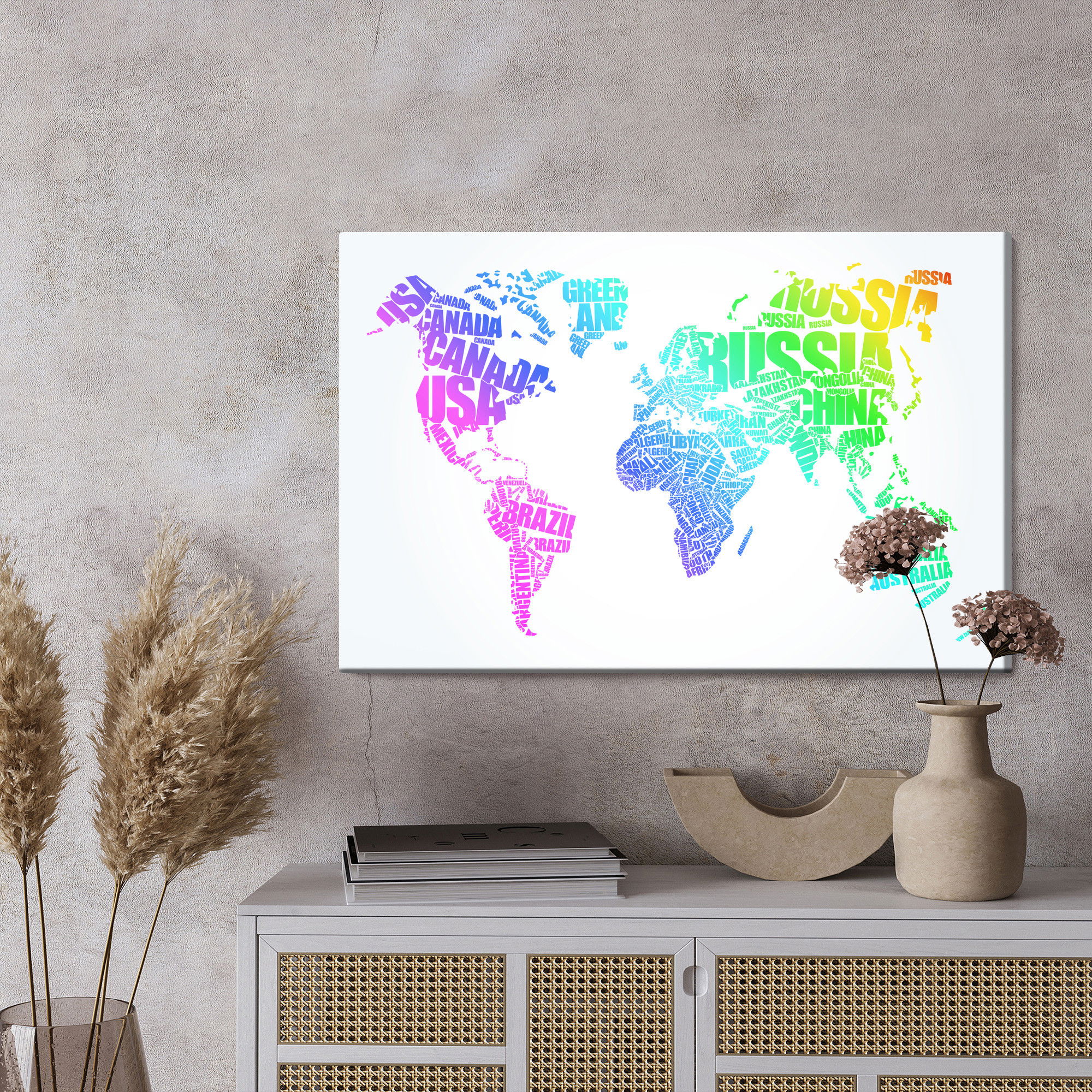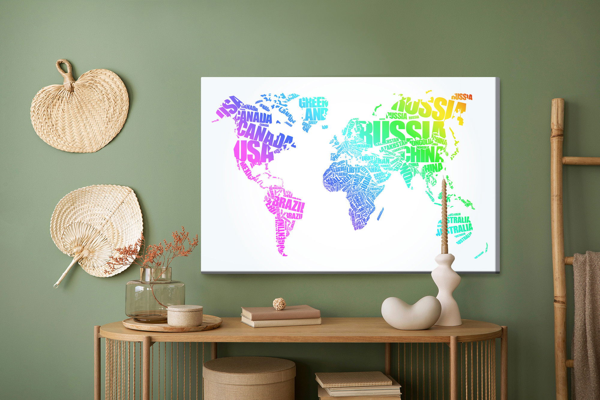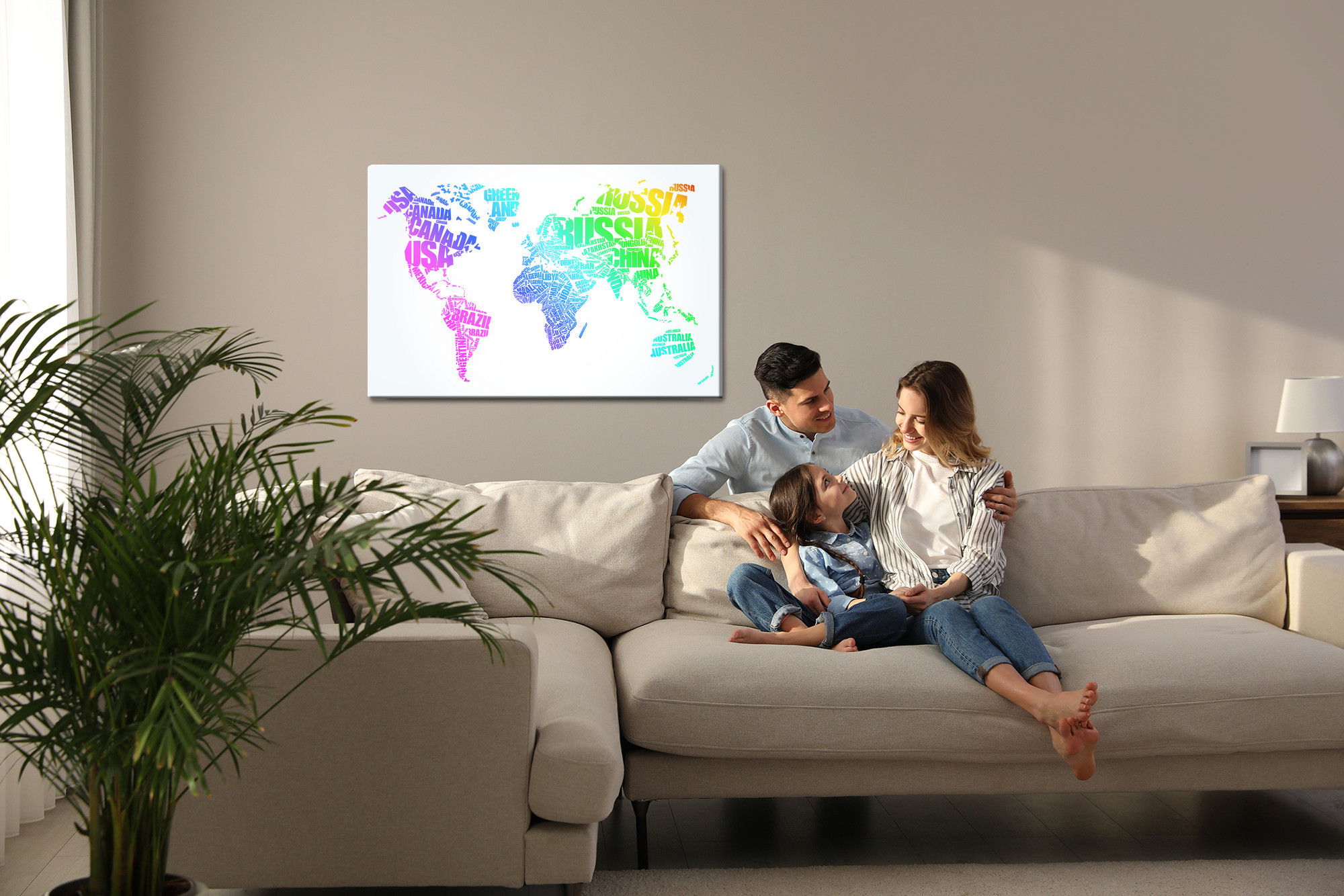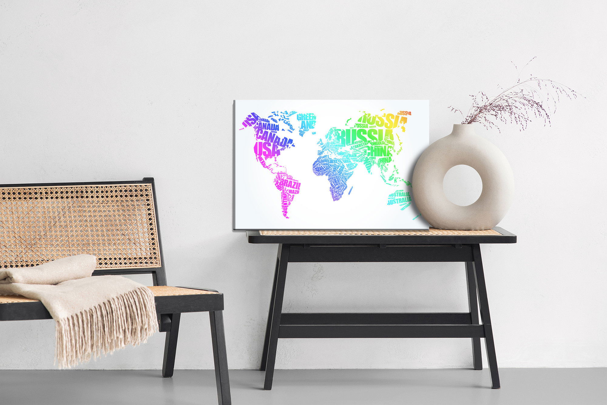 Kuvio World map with colored toistetaan erittäin tarkasti ja yksityiskohtaisesti HP Latex -tekniikan ansiosta. Painatus tehdään vesipohjaisilla, hajuttomilla ja GREENGUARD Gold -sertifioiduilla musteilla, jotka tarjoavat jopa 300 DPI:n tarkkuuden. Värit ovat UV-kestäviä ja säilyttävät voimakkuutensa myös valoisissa tiloissa, mikä tekee taulusta sopivan sekä koti- että julkisiin tiloihin.
