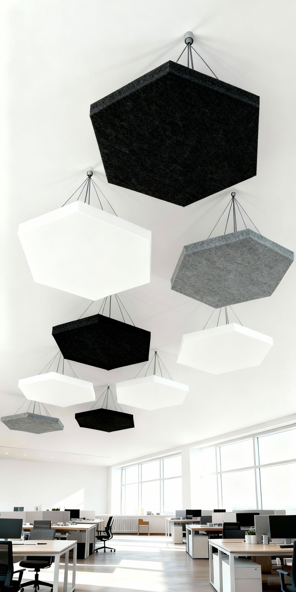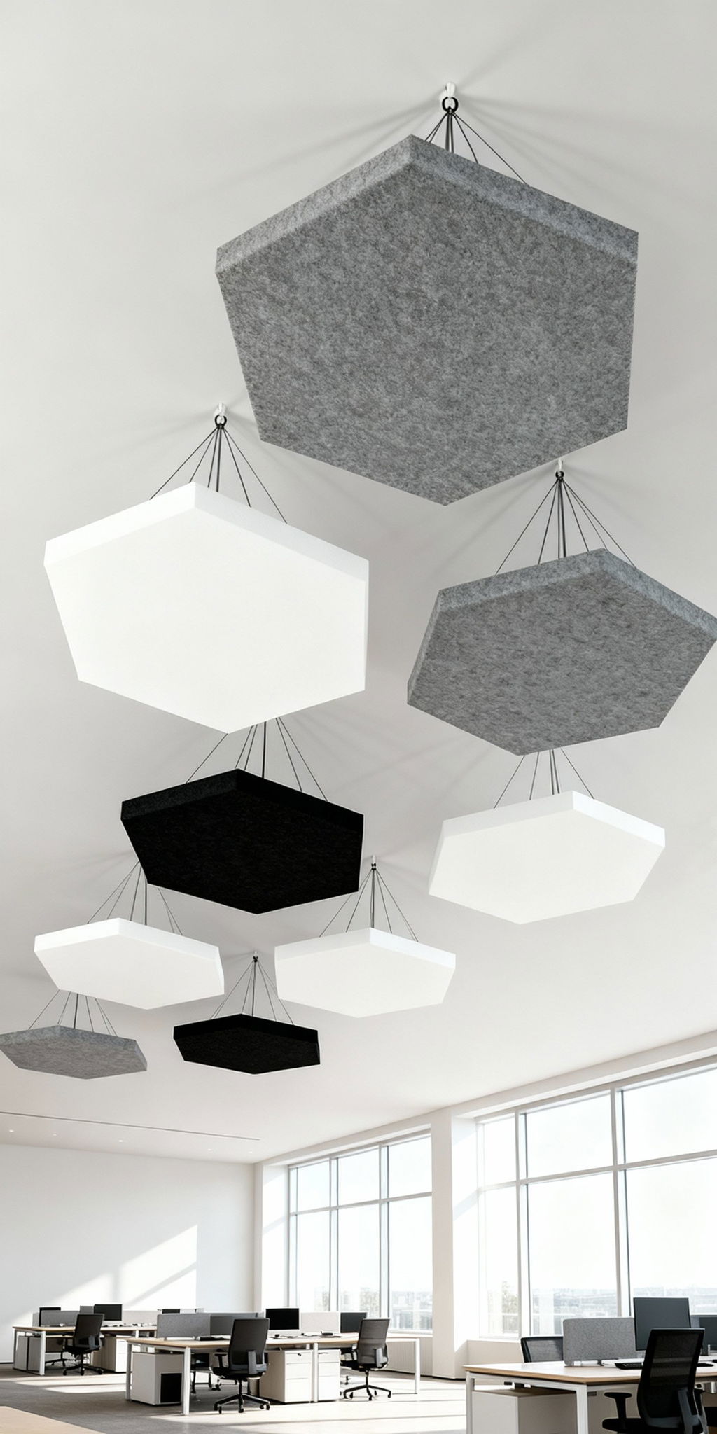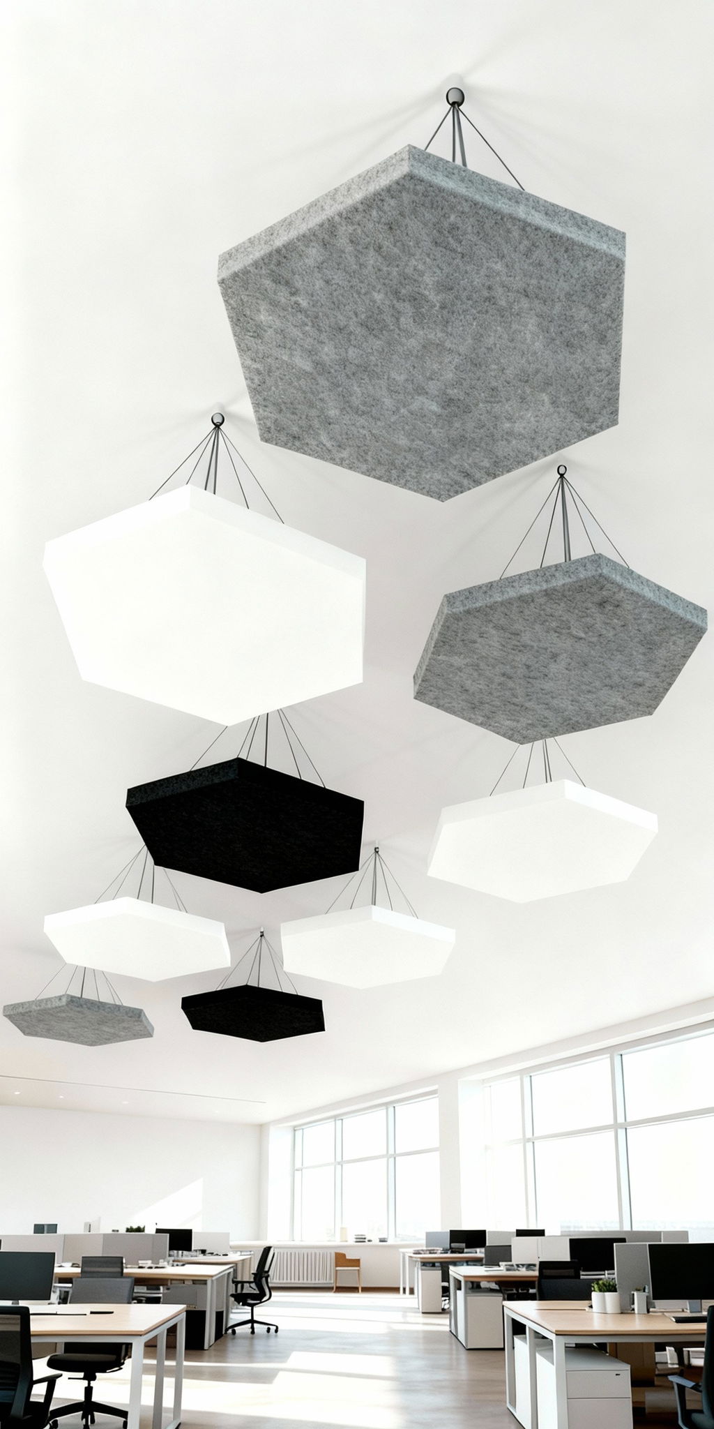 PES Hexagon Ceiling är särskilt effektiv mot ljudreflektioner som uppstår i takytor. Genom att hänga fritt med vajer bryts ljudvågorna redan innan de reflekteras tillbaka i rummet. Resultatet blir en tydlig minskning av efterklang och eko – särskilt i öppna kontorslandskap, klassrum, konferensrum och andra miljöer där en god ljudmiljö är avgörande. Den hexagonformade absorbenten bidrar inte bara till bättre akustik, utan även till ett modernt och dynamiskt uttryck i rummet.