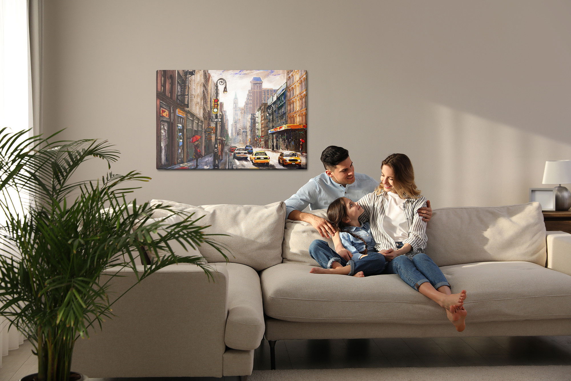 Varje tavla monteras på en massiv fururam. Format upp till 70×50 cm har en ram på 15 mm, medan format från 90×60 cm och uppåt har en ram på 20 mm. Den exakta dukspänningen gör att tavlan håller sin form över tid. Motivet 3d view of New York street trycks runt hela ramen vilket ger ett stilrent galleriuttryck där tavlan är lika vacker från sidan som framifrån. Kombinationen av rak dukspänning, rena linjer och korrekt tryck ger en professionell finish.