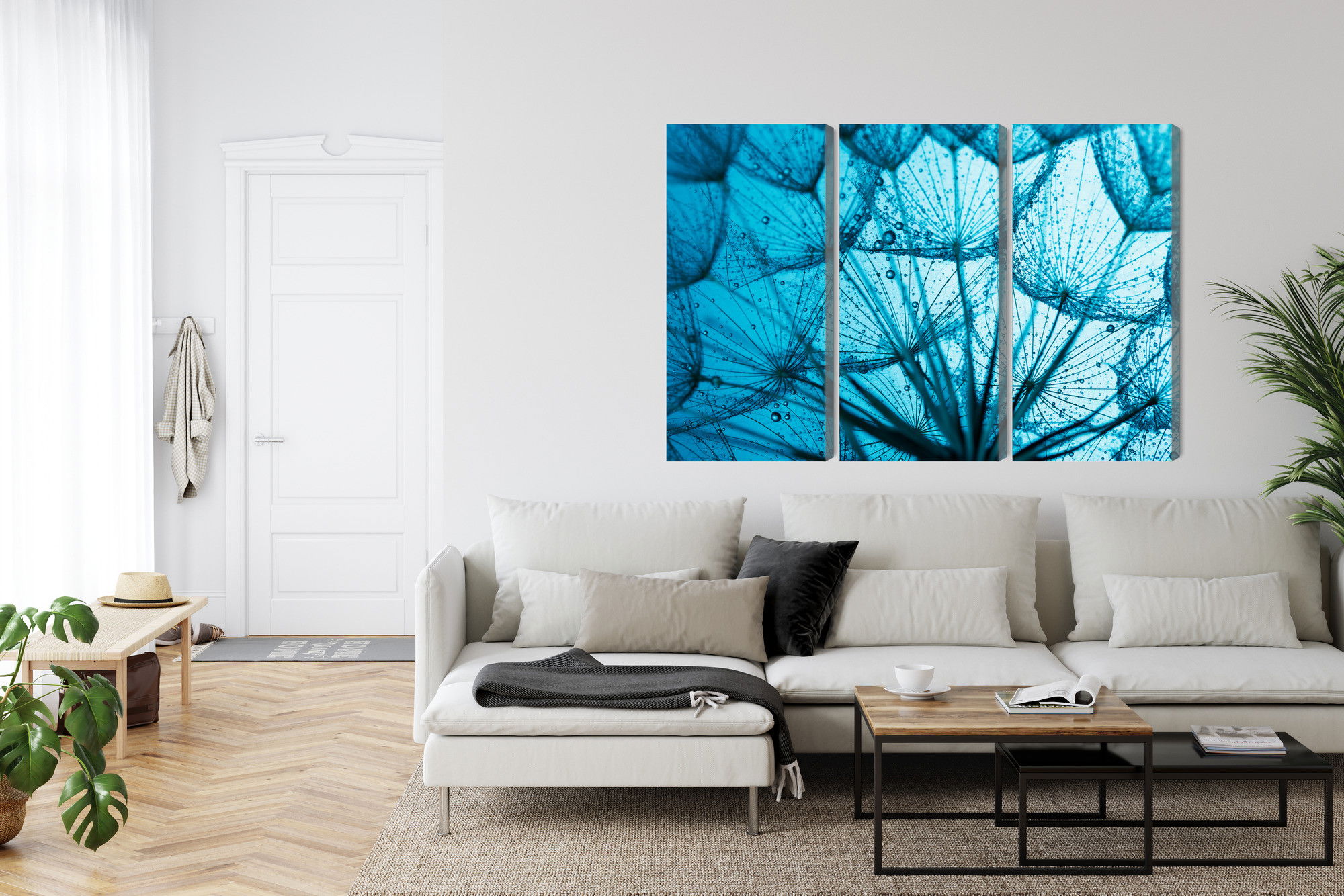 SilentDirects ljuddämpande tavla A close-up of a 3d dandelion kombinerar ett högupplöst motiv med avancerad akustikteknik. Varje tavla monteras i Sverige och bygger på en stabil canvastavla med fururam, där insidan av ramen fylls med en ljudabsorberande kärna av återvunnen polyester. Konstruktionen gör tavlan till ett både estetiskt och funktionellt inslag i rummet.