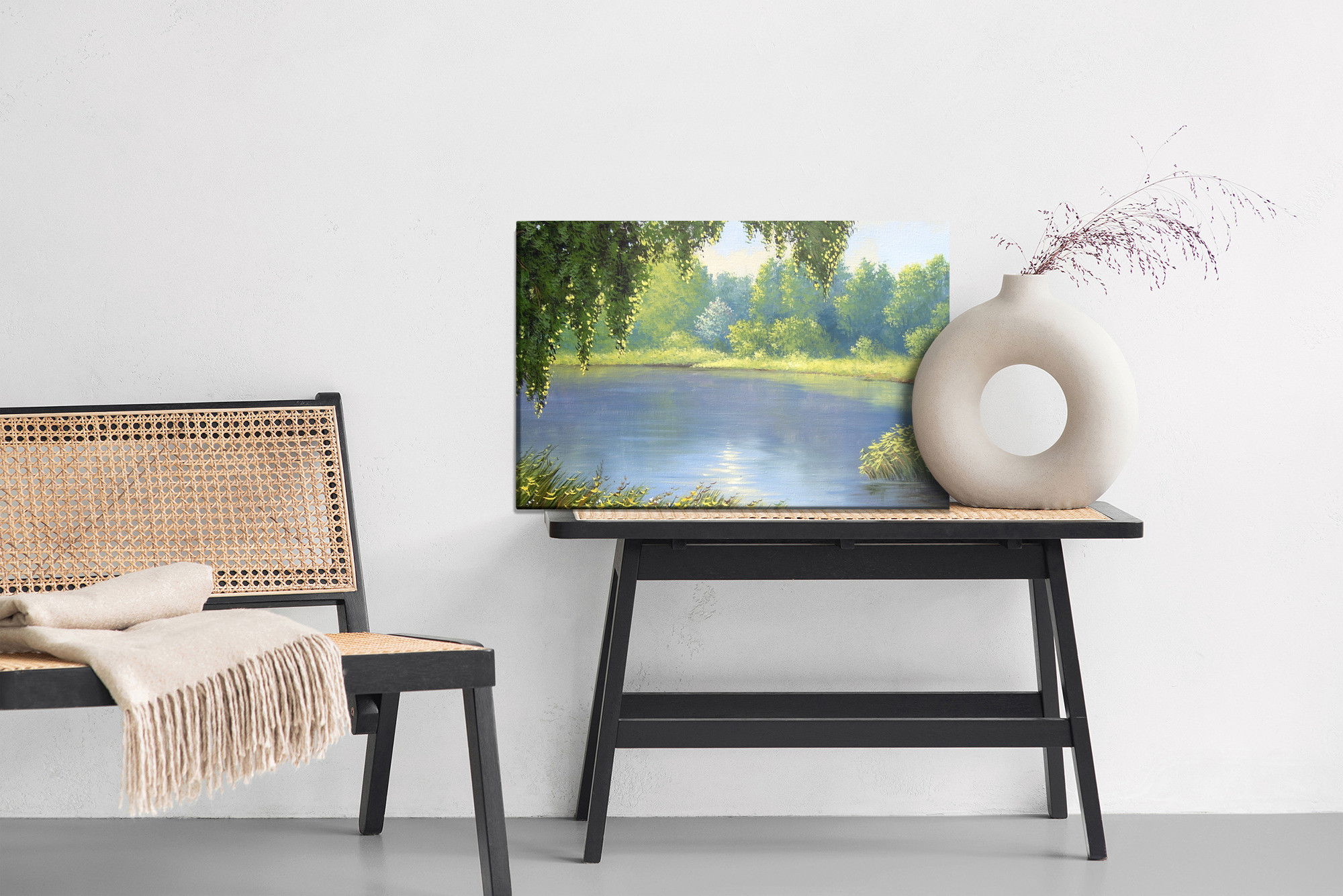 Varje tavla monteras på en massiv fururam. Format upp till 70×50 cm har en ram på 15 mm, medan format från 90×60 cm och uppåt har en ram på 20 mm. Den exakta dukspänningen gör att tavlan håller sin form över tid. Motivet A forest overlooking trycks runt hela ramen vilket ger ett stilrent galleriuttryck där tavlan är lika vacker från sidan som framifrån. Kombinationen av rak dukspänning, rena linjer och korrekt tryck ger en professionell finish.