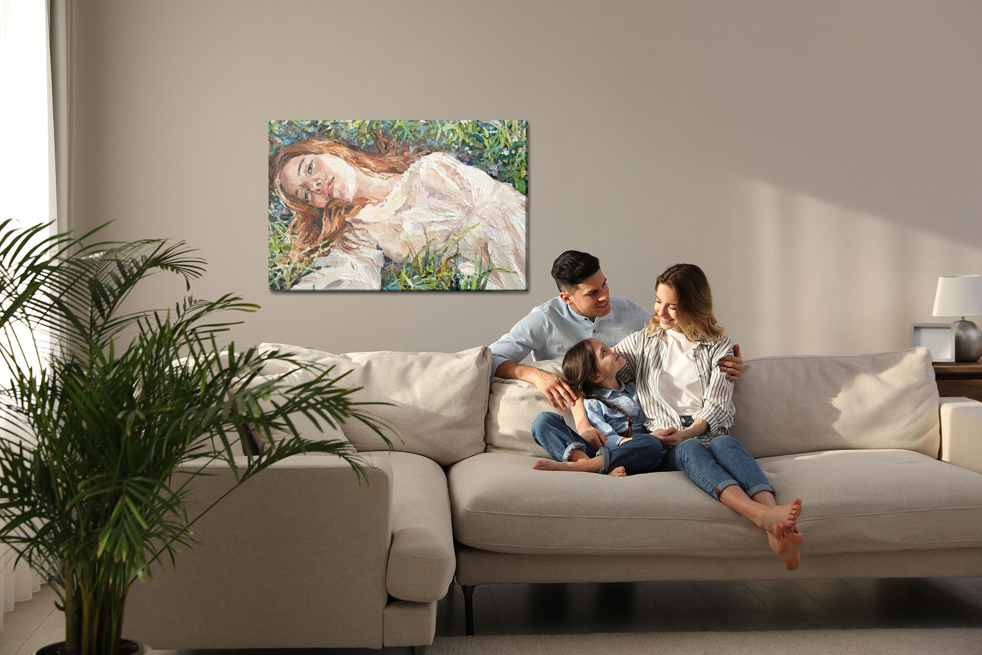 Motivet a red-haired beauty återges med hög färgprecision och detaljrikedom tack vare HP Latex-teknologi. Trycket sker med vattenbaserade, luktfria och GREENGUARD Gold-certifierade bläck som ger en upplösning på upp till 300 DPI. Färgerna är UV-beständiga och behåller sin styrka även i ljusa rum, vilket gör tavlan lämplig för både hem- och offentliga miljöer.