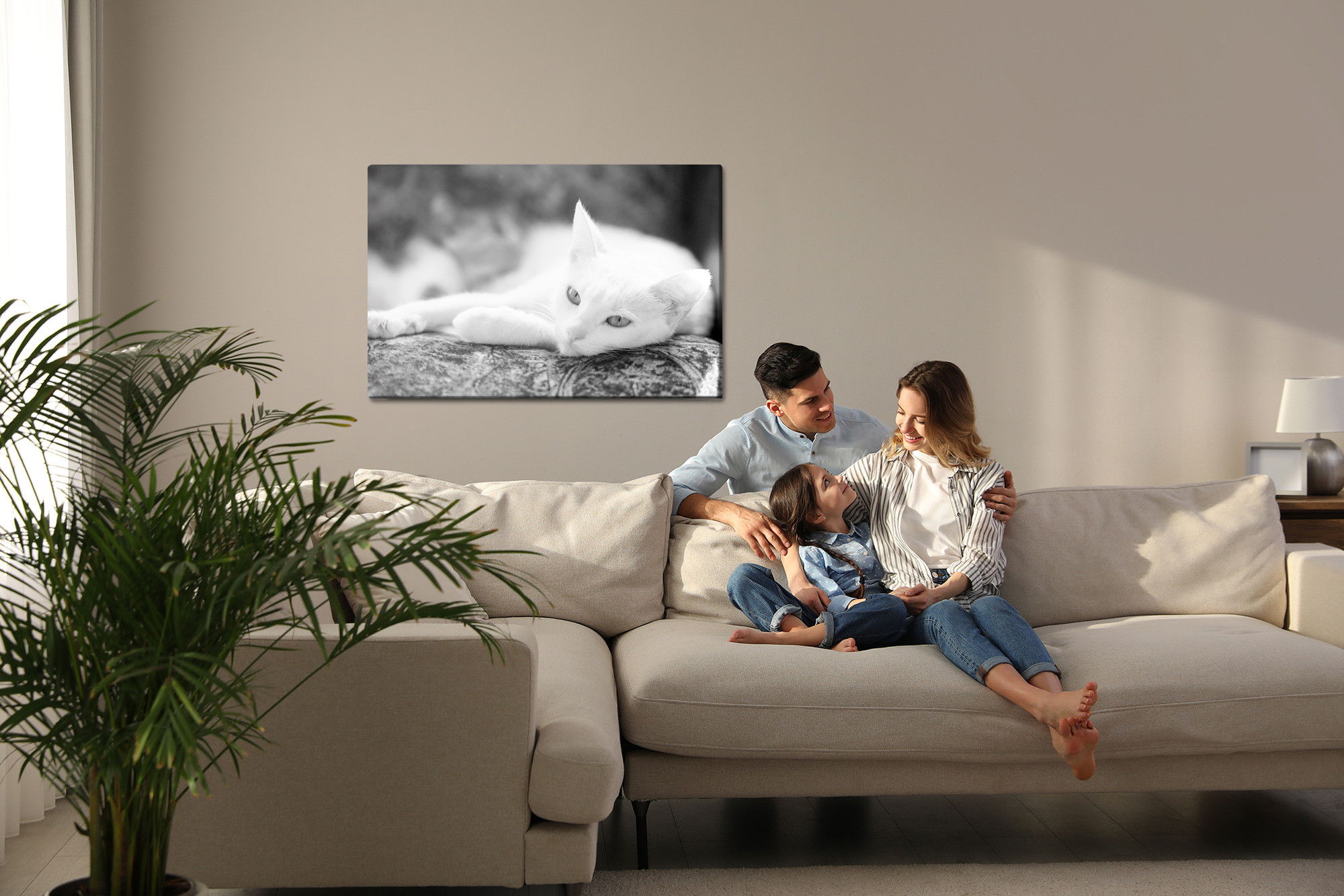 Motivet A resting white cat återges med hög färgprecision och detaljrikedom tack vare HP Latex-teknologi. Trycket sker med vattenbaserade, luktfria och GREENGUARD Gold-certifierade bläck som ger en upplösning på upp till 300 DPI. Färgerna är UV-beständiga och behåller sin styrka även i ljusa rum, vilket gör tavlan lämplig för både hem- och offentliga miljöer.