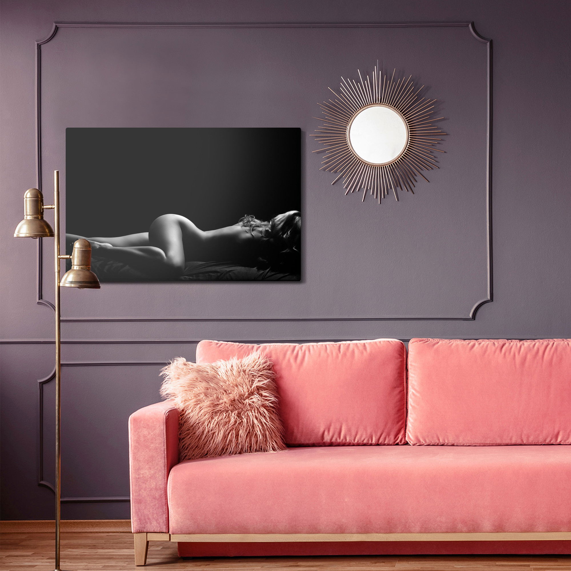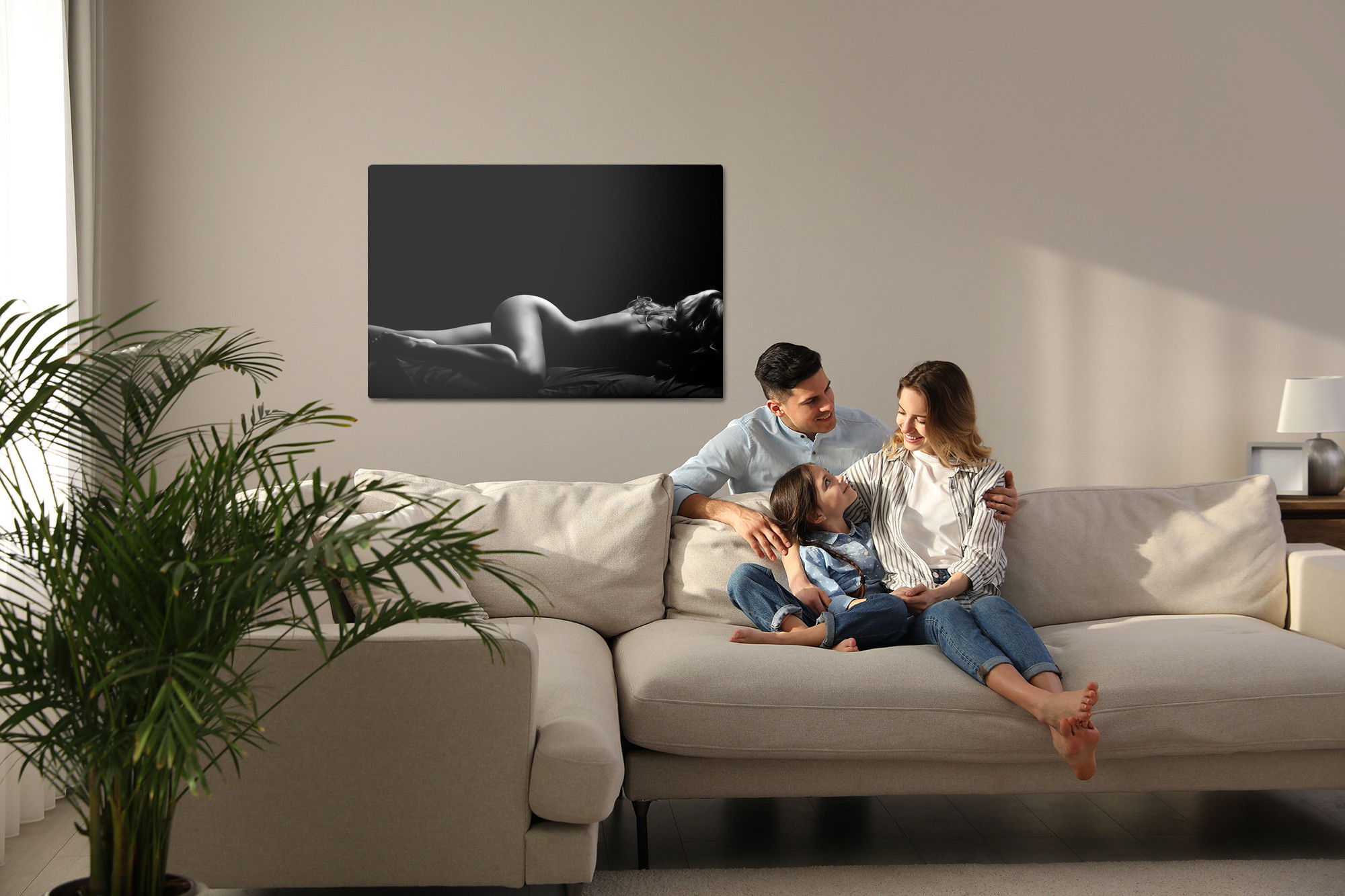 Varje tavla monteras på en massiv fururam. Format upp till 70×50 cm har en ram på 15 mm, medan format från 90×60 cm och uppåt har en ram på 20 mm. Den exakta dukspänningen gör att tavlan håller sin form över tid. Motivet A woman in an erotic pose trycks runt hela ramen vilket ger ett stilrent galleriuttryck där tavlan är lika vacker från sidan som framifrån. Kombinationen av rak dukspänning, rena linjer och korrekt tryck ger en professionell finish.