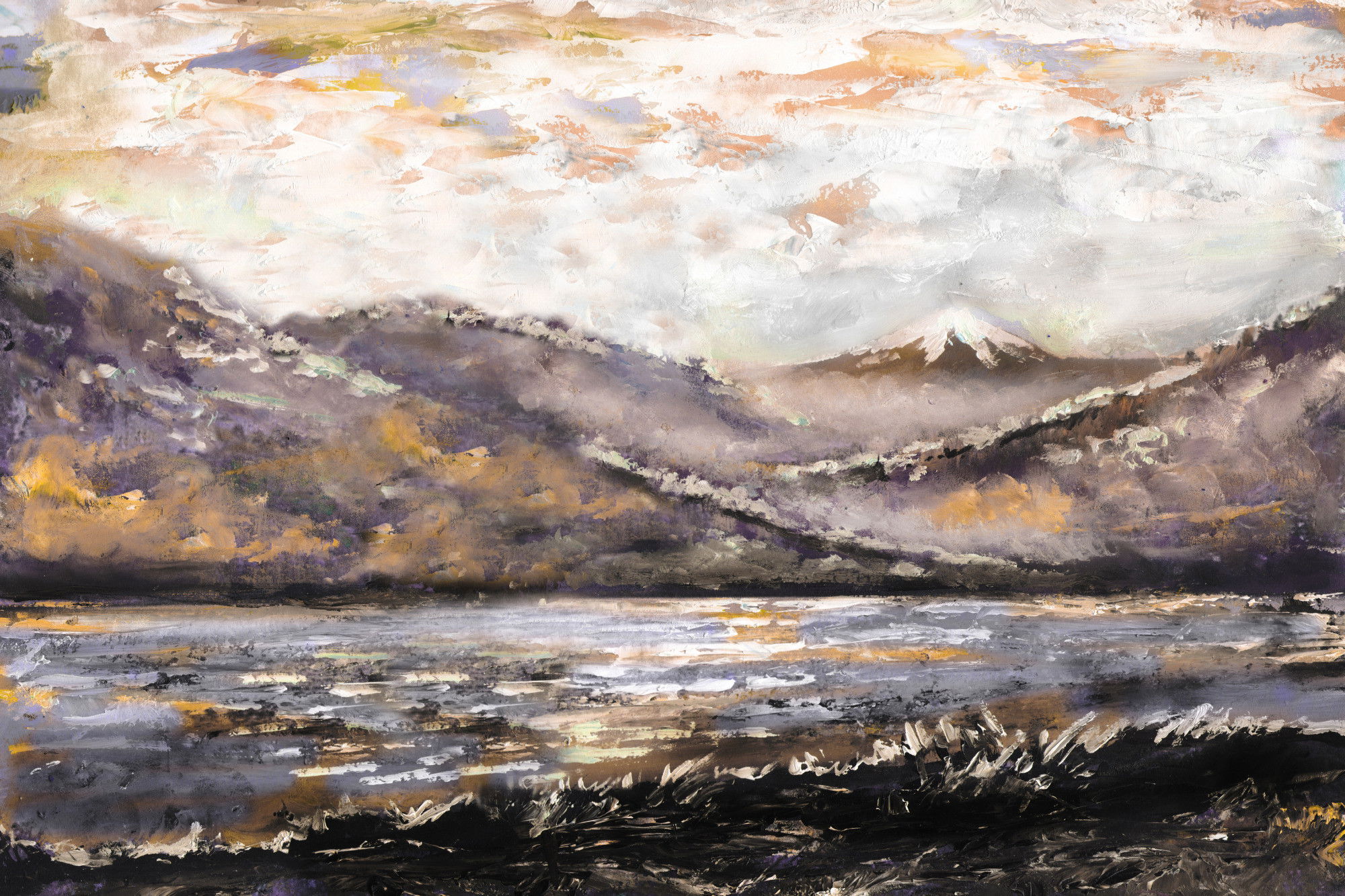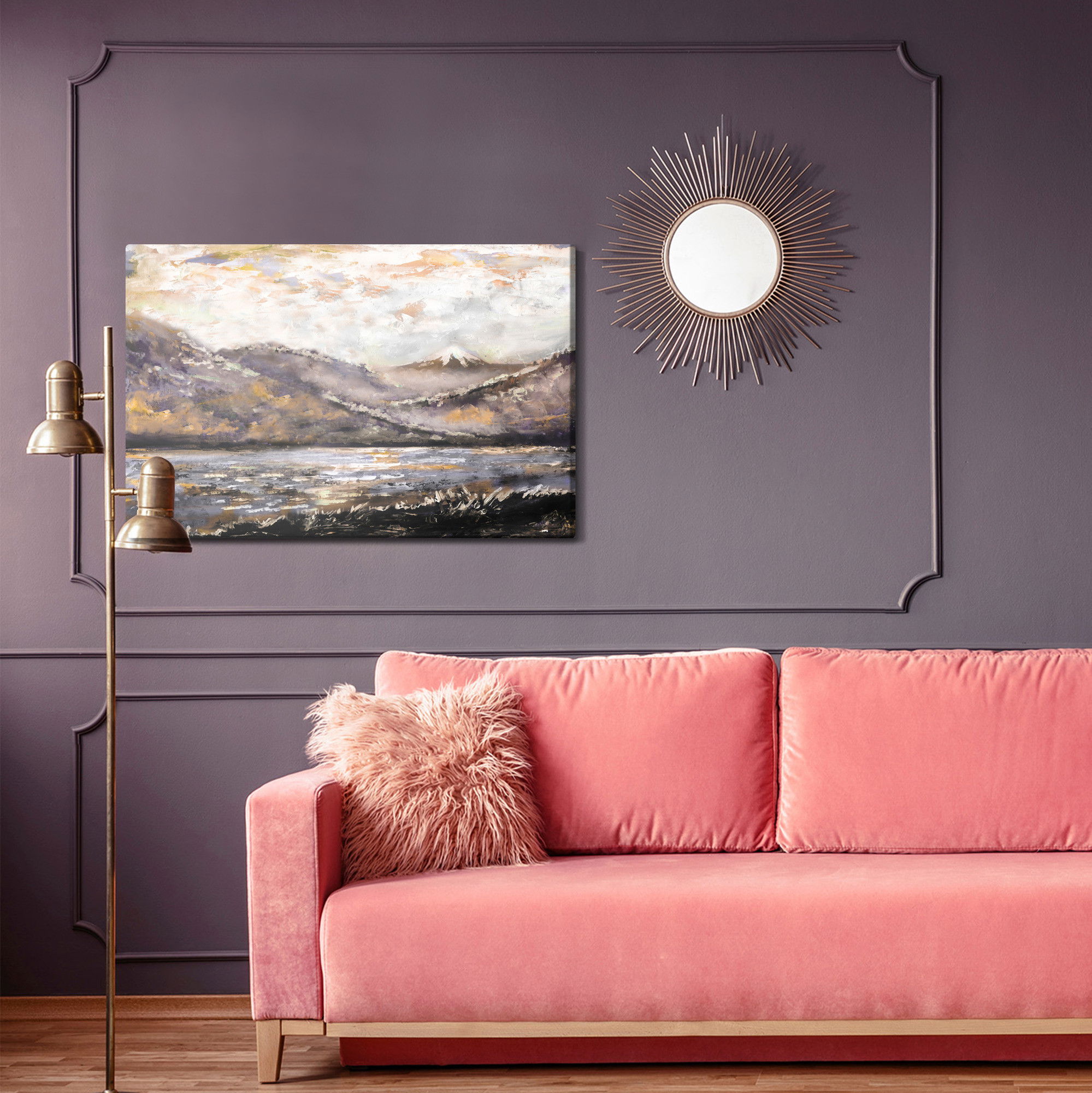 SilentDirects ljuddämpande tavla Abstract mountain landscape kombinerar ett högupplöst motiv med avancerad akustikteknik. Varje tavla monteras i Sverige och bygger på en stabil canvastavla med fururam, där insidan av ramen fylls med en ljudabsorberande kärna av återvunnen polyester. Konstruktionen gör tavlan till ett både estetiskt och funktionellt inslag i rummet.