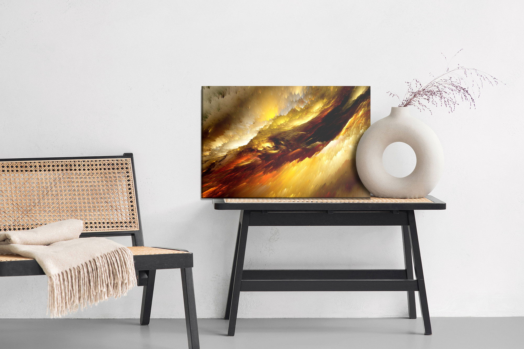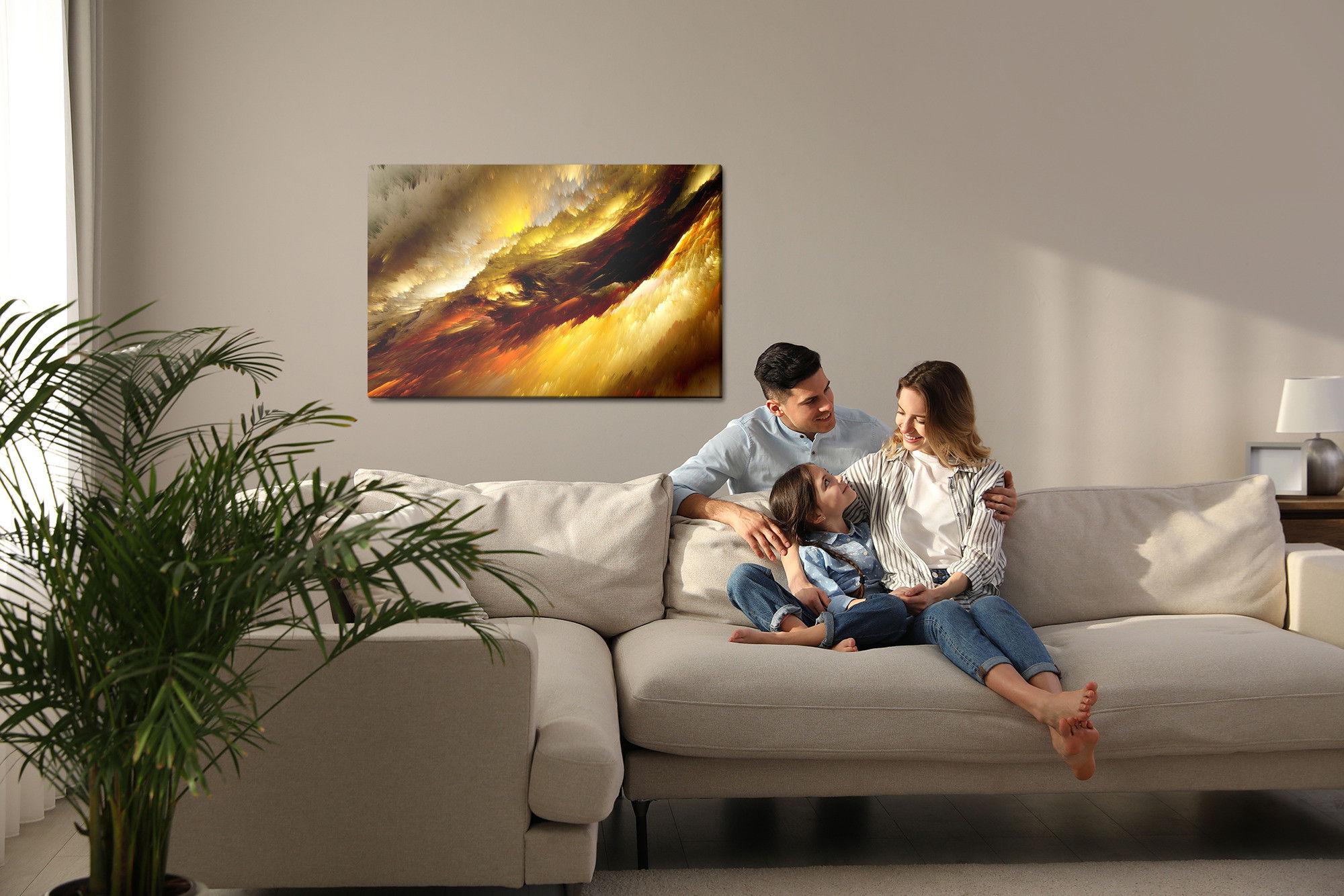 Varje tavla monteras på en massiv fururam. Format upp till 70×50 cm har en ram på 15 mm, medan format från 90×60 cm och uppåt har en ram på 20 mm. Den exakta dukspänningen gör att tavlan håller sin form över tid. Motivet Abstract stormy sky trycks runt hela ramen vilket ger ett stilrent galleriuttryck där tavlan är lika vacker från sidan som framifrån. Kombinationen av rak dukspänning, rena linjer och korrekt tryck ger en professionell finish.