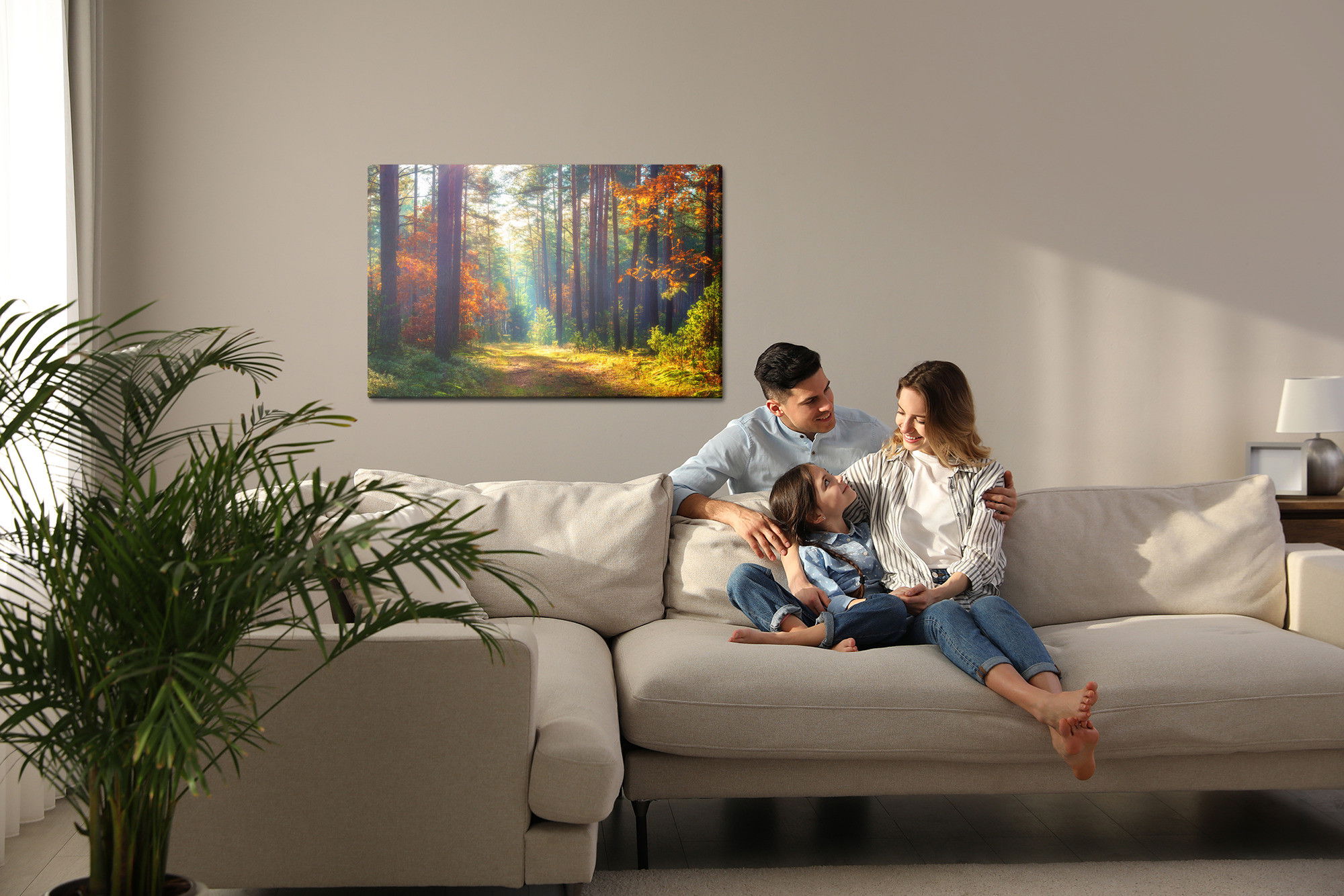 Varje tavla monteras på en massiv fururam. Format upp till 70×50 cm har en ram på 15 mm, medan format från 90×60 cm och uppåt har en ram på 20 mm. Den exakta dukspänningen gör att tavlan håller sin form över tid. Motivet Autumn forest in the morning trycks runt hela ramen vilket ger ett stilrent galleriuttryck där tavlan är lika vacker från sidan som framifrån. Kombinationen av rak dukspänning, rena linjer och korrekt tryck ger en professionell finish.