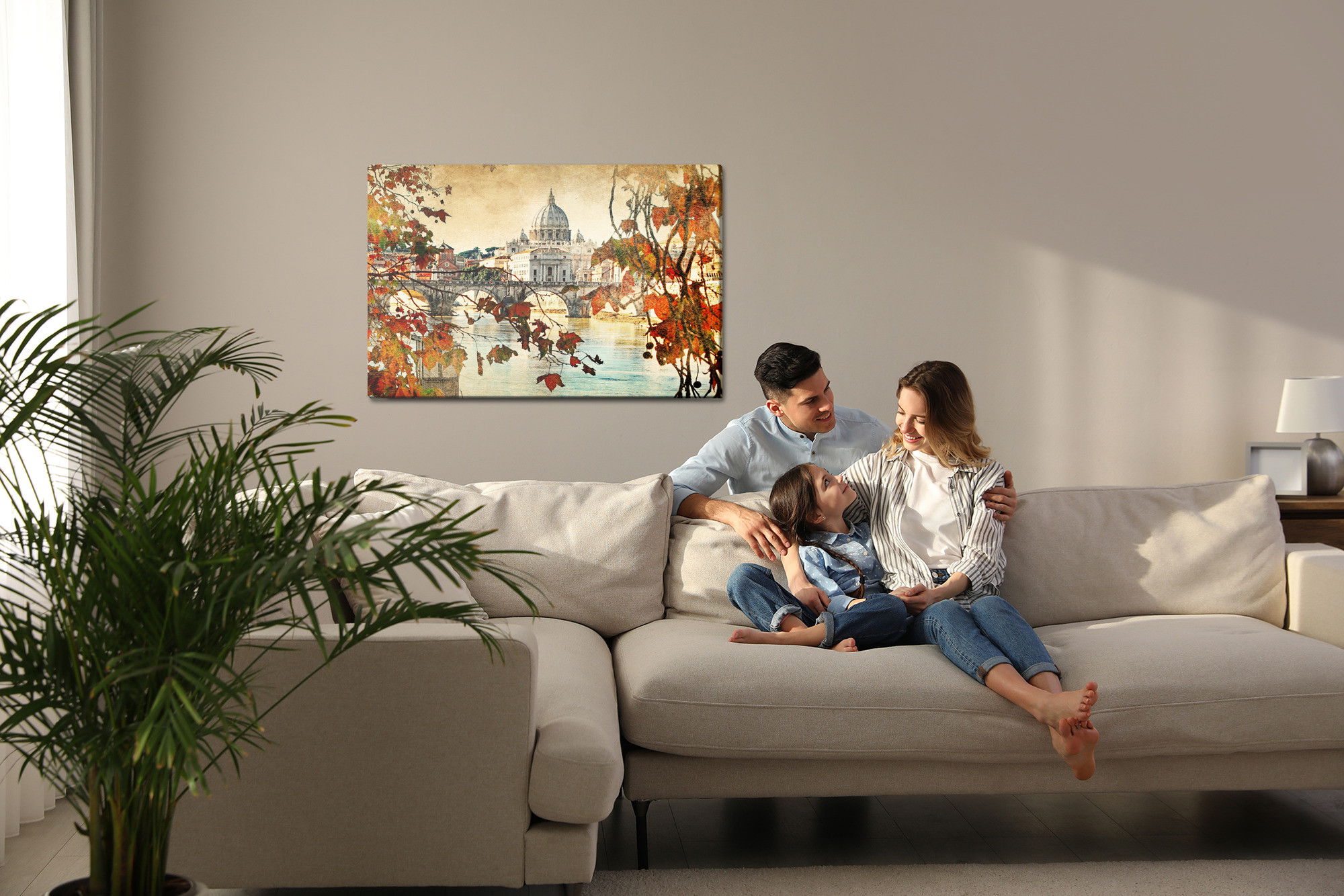 Varje tavla monteras på en massiv fururam. Format upp till 70×50 cm har en ram på 15 mm, medan format från 90×60 cm och uppåt har en ram på 20 mm. Den exakta dukspänningen gör att tavlan håller sin form över tid. Motivet Autumn in Rome trycks runt hela ramen vilket ger ett stilrent galleriuttryck där tavlan är lika vacker från sidan som framifrån. Kombinationen av rak dukspänning, rena linjer och korrekt tryck ger en professionell finish.