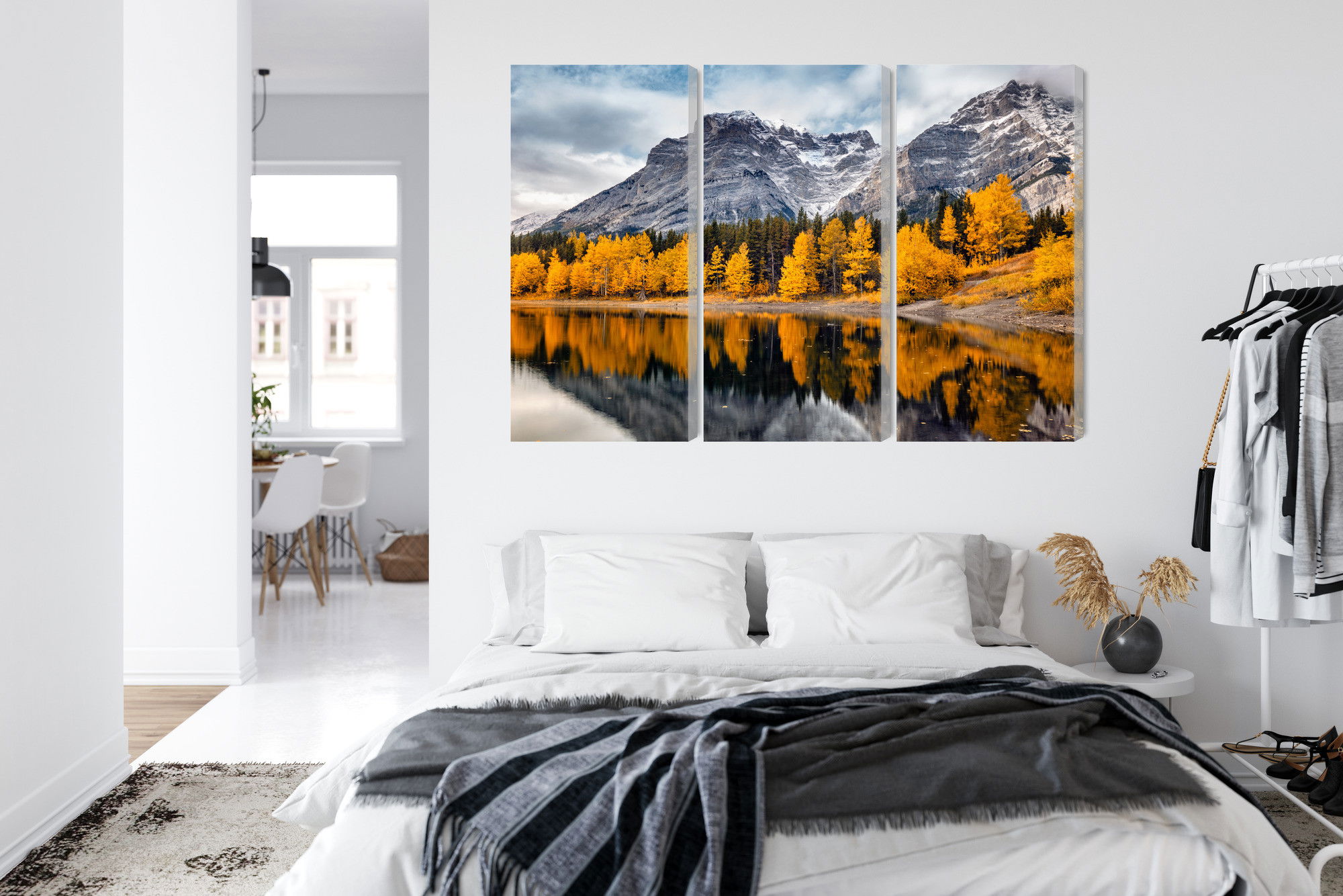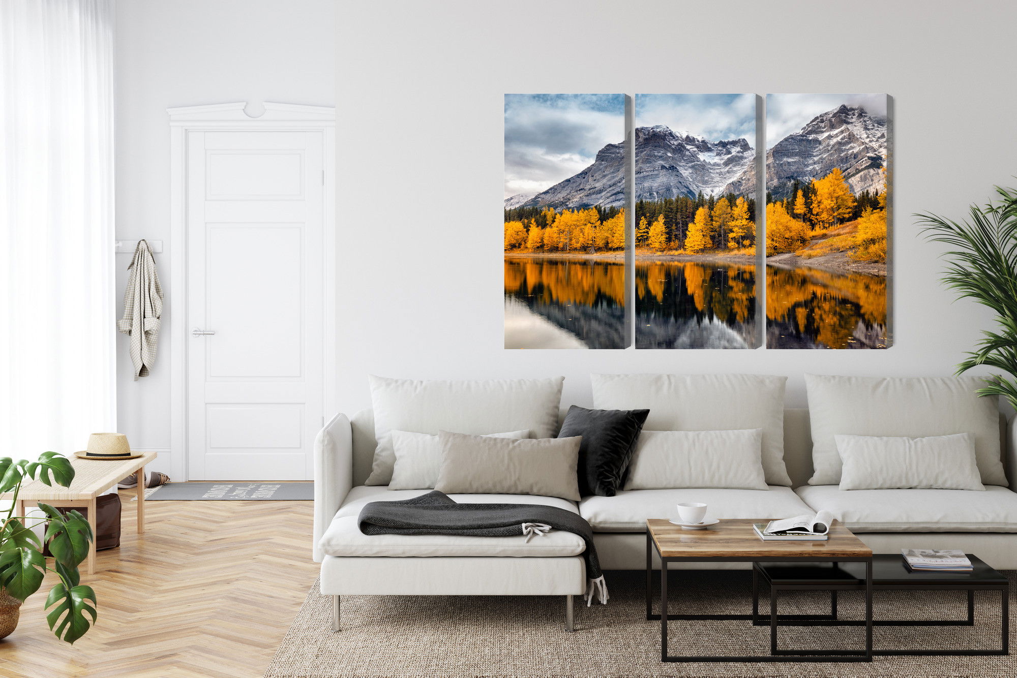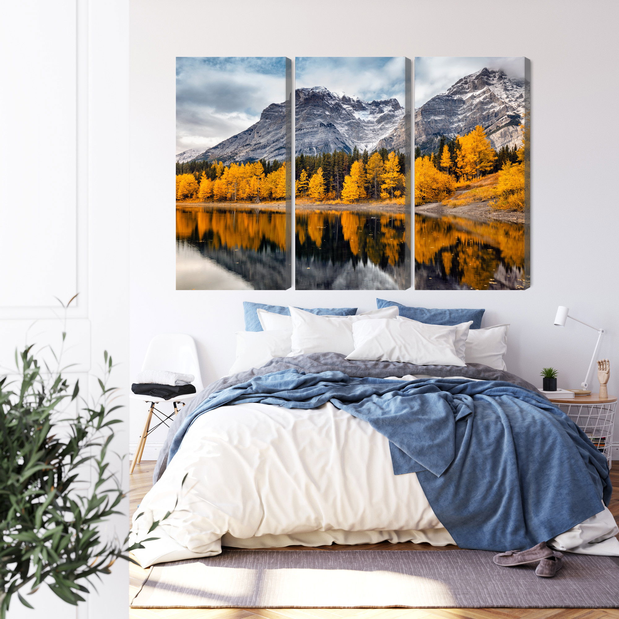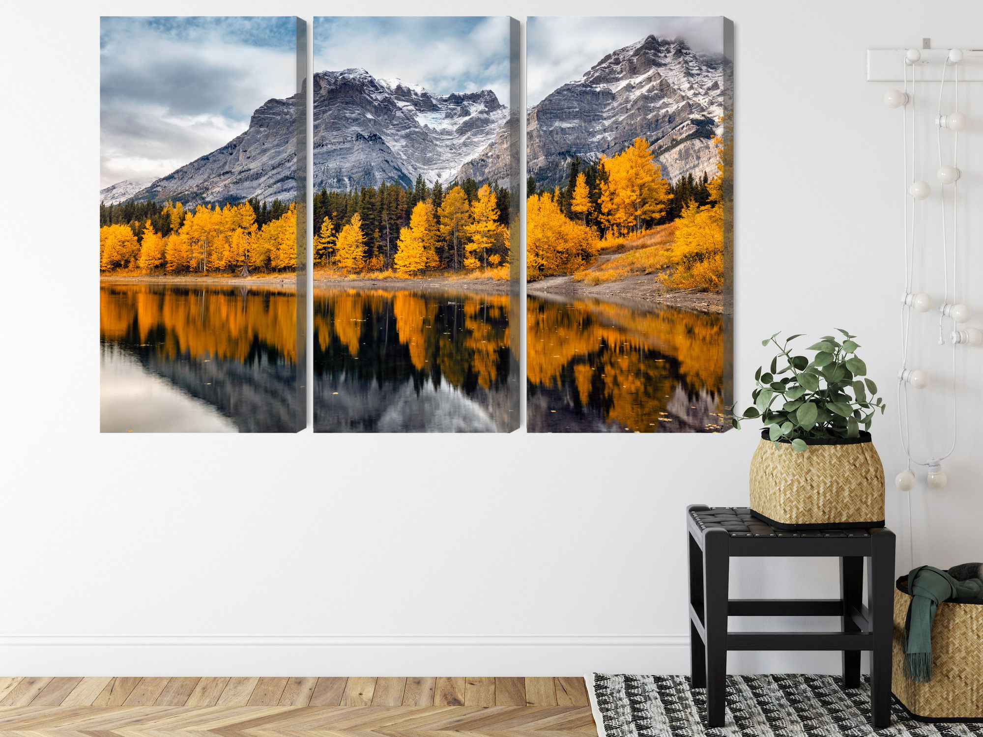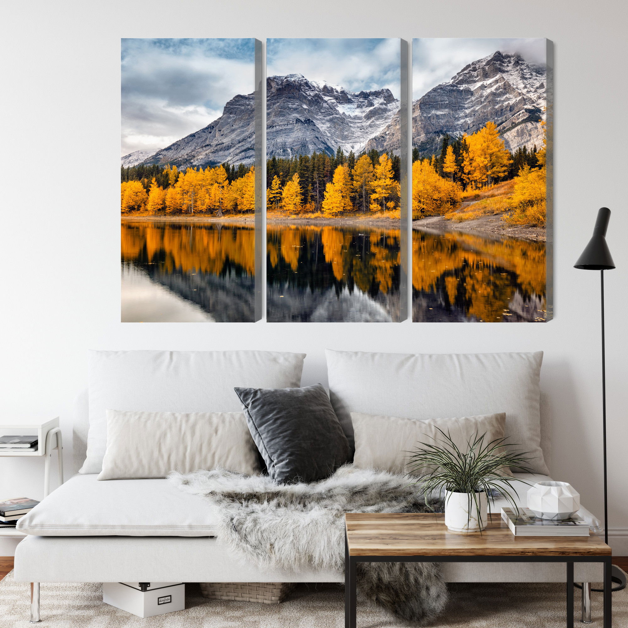 Varje tavla monteras på en massiv fururam. Format upp till 70×50 cm har en ram på 15 mm, medan format från 90×60 cm och uppåt har en ram på 20 mm. Den exakta dukspänningen gör att tavlan håller sin form över tid. Motivet Banff national park in Canada trycks runt hela ramen vilket ger ett stilrent galleriuttryck där tavlan är lika vacker från sidan som framifrån. Kombinationen av rak dukspänning, rena linjer och korrekt tryck ger en professionell finish.