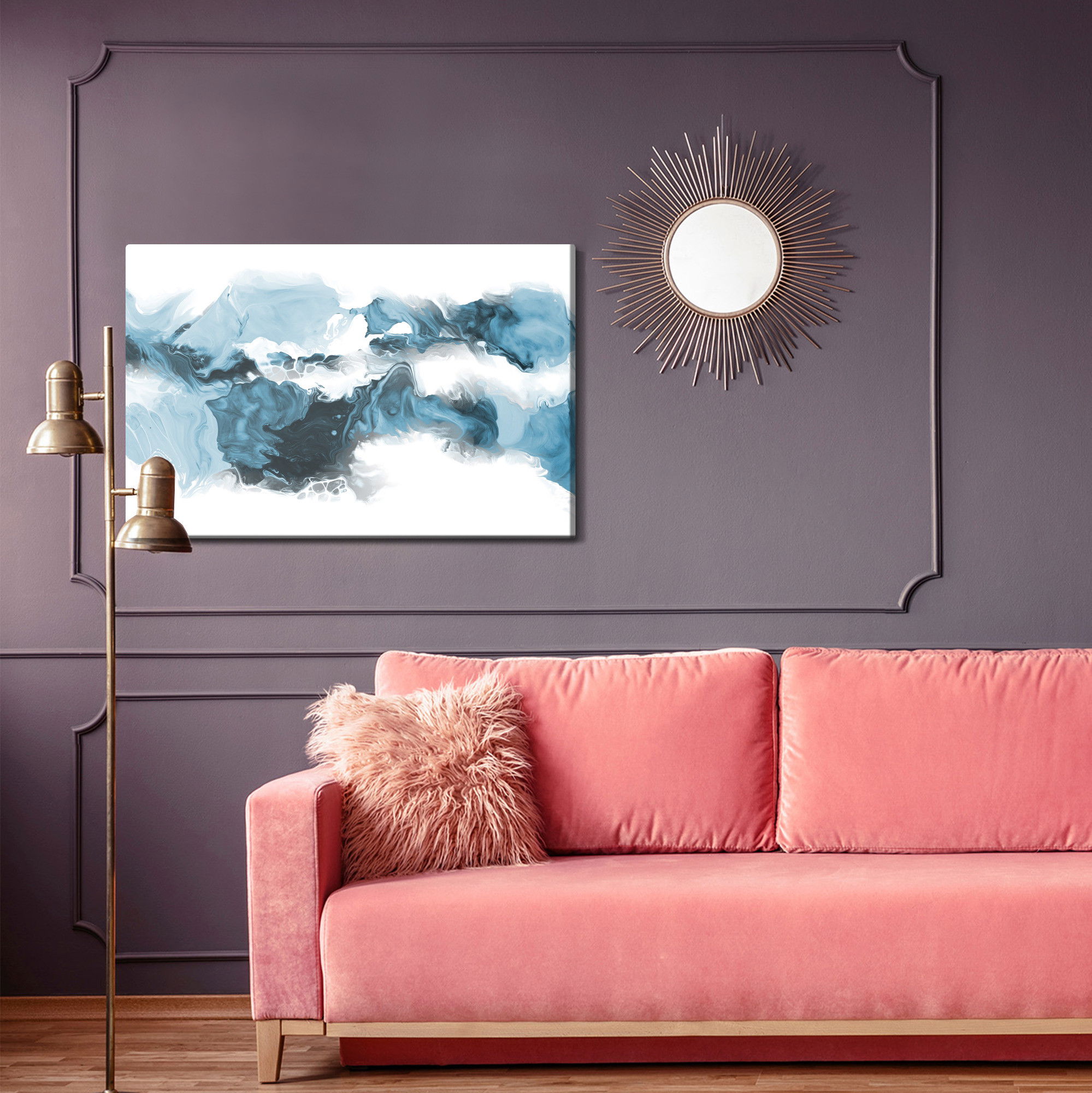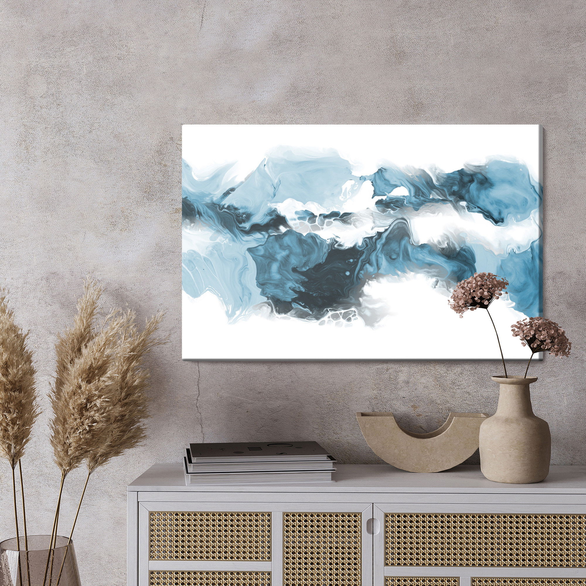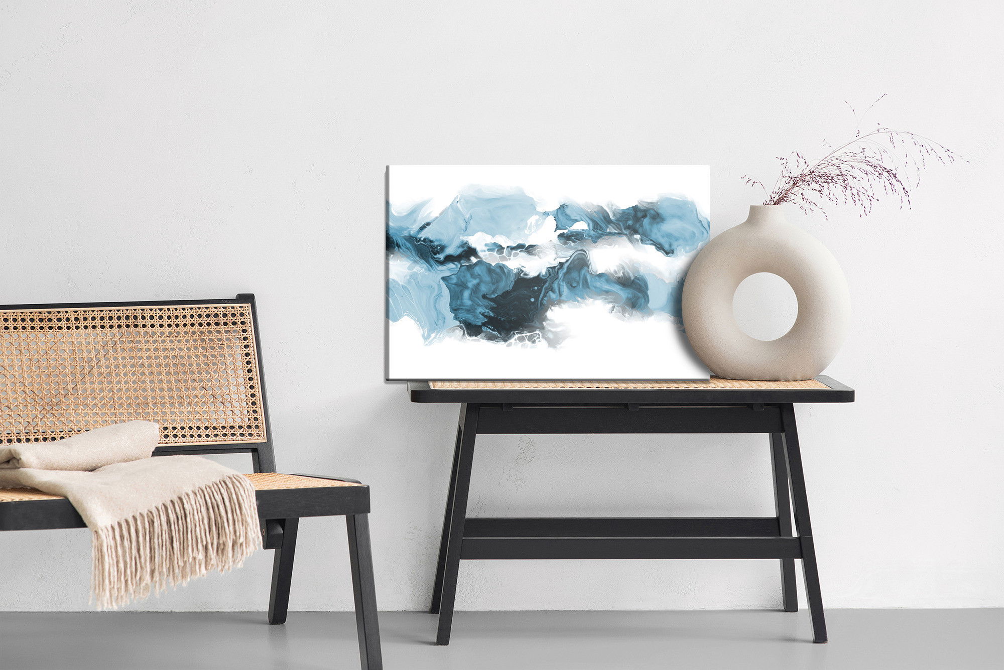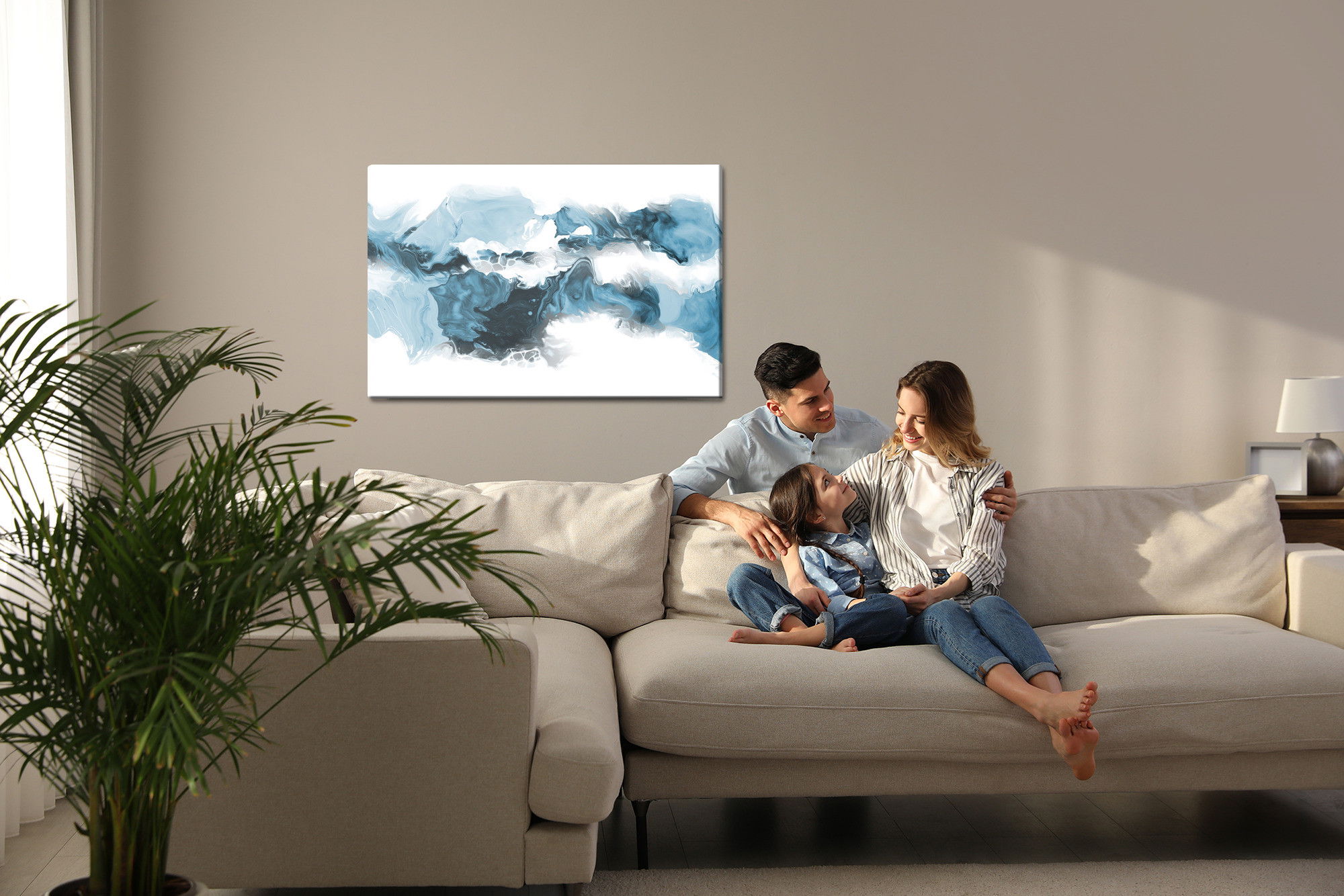 Varje tavla monteras på en massiv fururam. Format upp till 70×50 cm har en ram på 15 mm, medan format från 90×60 cm och uppåt har en ram på 20 mm. Den exakta dukspänningen gör att tavlan håller sin form över tid. Motivet Blue abstract wave trycks runt hela ramen vilket ger ett stilrent galleriuttryck där tavlan är lika vacker från sidan som framifrån. Kombinationen av rak dukspänning, rena linjer och korrekt tryck ger en professionell finish.