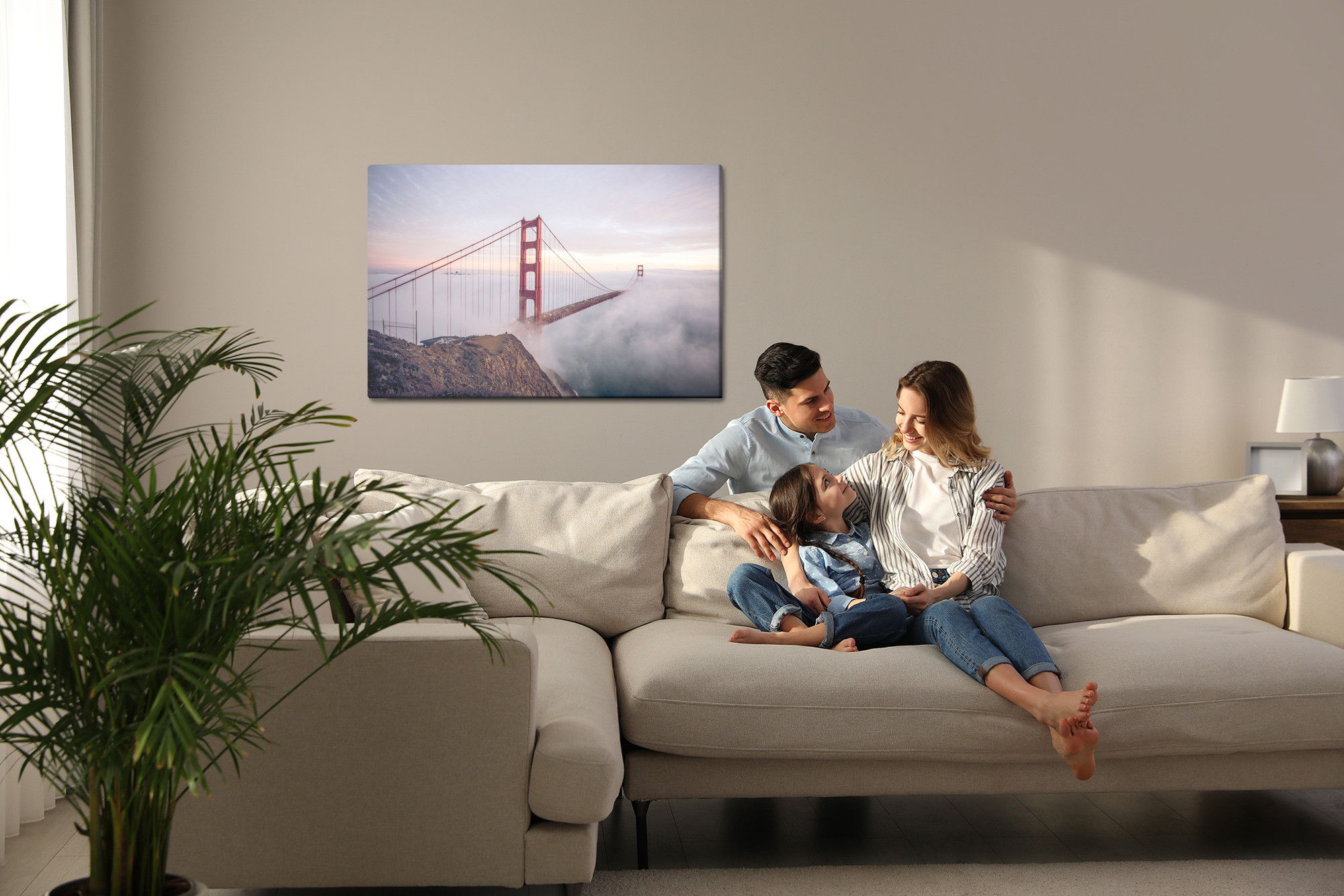 Varje tavla monteras på en massiv fururam. Format upp till 70×50 cm har en ram på 15 mm, medan format från 90×60 cm och uppåt har en ram på 20 mm. Den exakta dukspänningen gör att tavlan håller sin form över tid. Motivet Bridge Golden Gate trycks runt hela ramen vilket ger ett stilrent galleriuttryck där tavlan är lika vacker från sidan som framifrån. Kombinationen av rak dukspänning, rena linjer och korrekt tryck ger en professionell finish.