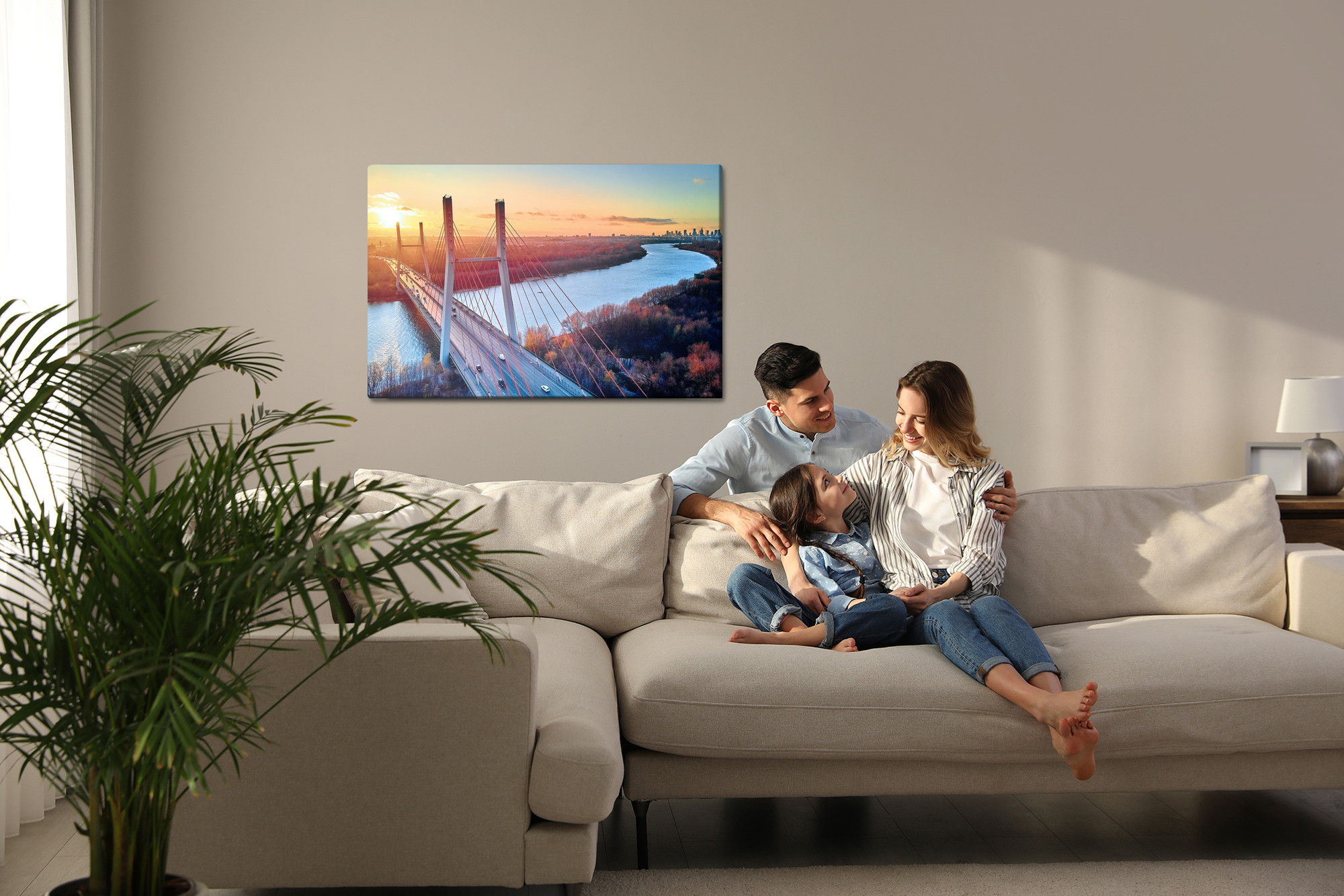 Varje tavla monteras på en massiv fururam. Format upp till 70×50 cm har en ram på 15 mm, medan format från 90×60 cm och uppåt har en ram på 20 mm. Den exakta dukspänningen gör att tavlan håller sin form över tid. Motivet Bridge in Warsaw at sunset trycks runt hela ramen vilket ger ett stilrent galleriuttryck där tavlan är lika vacker från sidan som framifrån. Kombinationen av rak dukspänning, rena linjer och korrekt tryck ger en professionell finish.