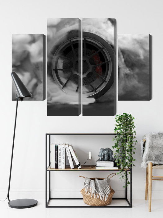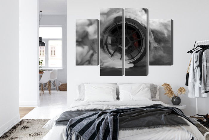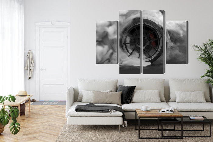 Varje tavla monteras på en massiv fururam. Format upp till 70×50 cm har en ram på 15 mm, medan format från 90×60 cm och uppåt har en ram på 20 mm. Den exakta dukspänningen gör att tavlan håller sin form över tid. Motivet Car wheel in a cloud of 3d trycks runt hela ramen vilket ger ett stilrent galleriuttryck där tavlan är lika vacker från sidan som framifrån. Kombinationen av rak dukspänning, rena linjer och korrekt tryck ger en professionell finish.