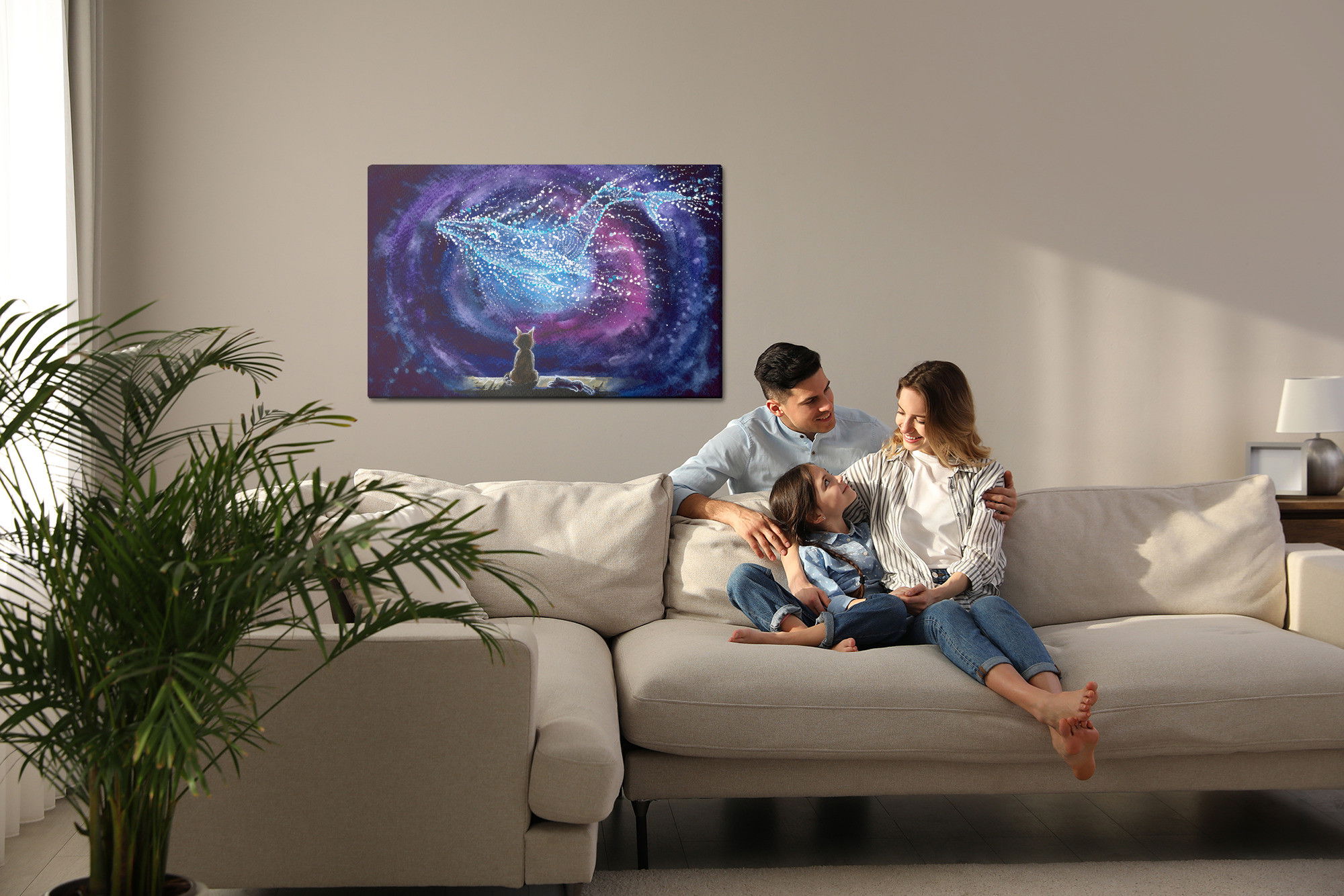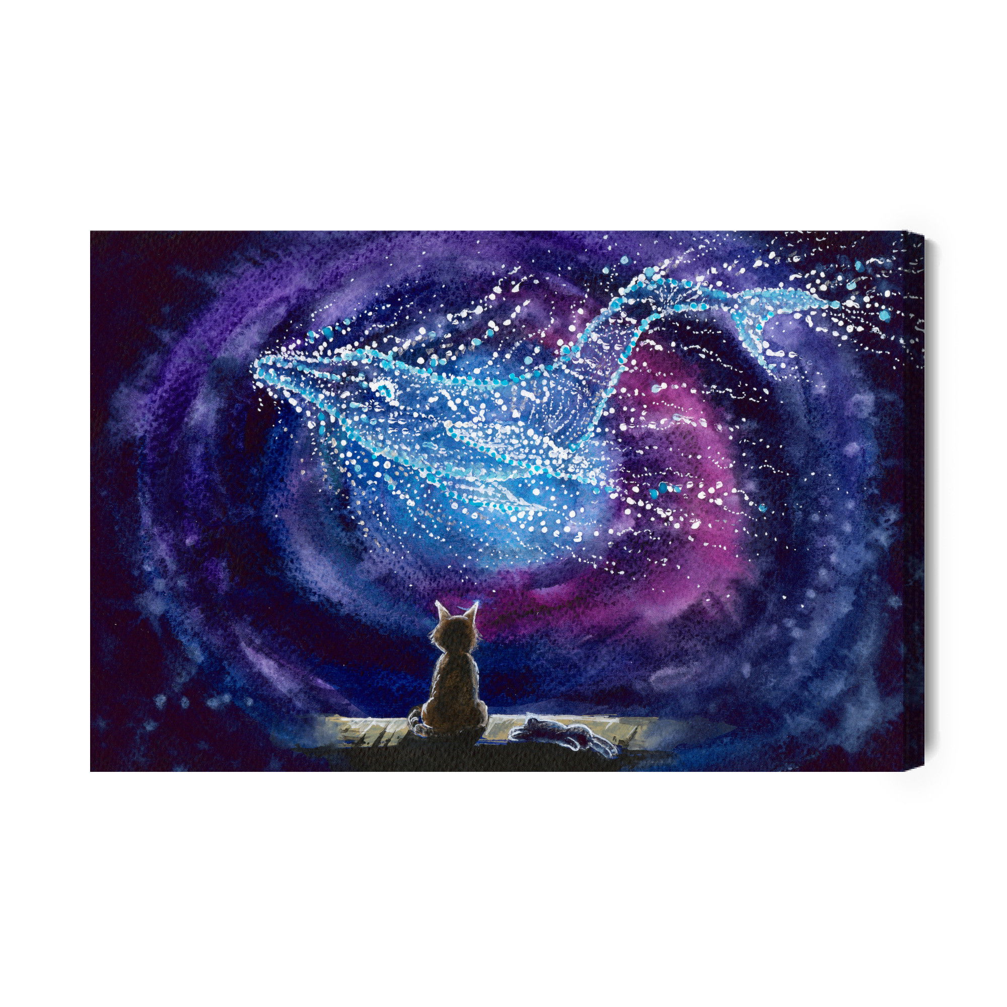 Varje tavla monteras på en massiv fururam. Format upp till 70×50 cm har en ram på 15 mm, medan format från 90×60 cm och uppåt har en ram på 20 mm. Den exakta dukspänningen gör att tavlan håller sin form över tid. Motivet Cat on the background trycks runt hela ramen vilket ger ett stilrent galleriuttryck där tavlan är lika vacker från sidan som framifrån. Kombinationen av rak dukspänning, rena linjer och korrekt tryck ger en professionell finish.