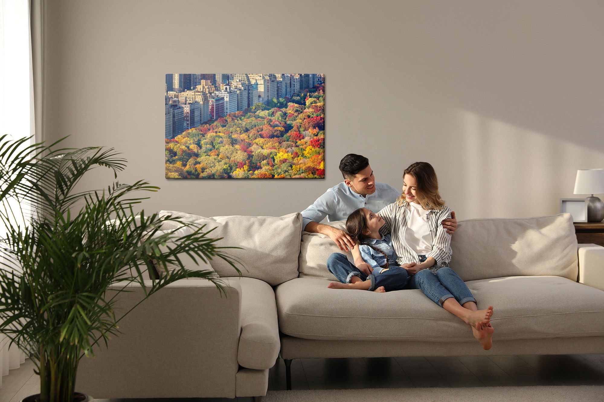 Varje tavla monteras på en massiv fururam. Format upp till 70×50 cm har en ram på 15 mm, medan format från 90×60 cm och uppåt har en ram på 20 mm. Den exakta dukspänningen gör att tavlan håller sin form över tid. Motivet Central park aerial view trycks runt hela ramen vilket ger ett stilrent galleriuttryck där tavlan är lika vacker från sidan som framifrån. Kombinationen av rak dukspänning, rena linjer och korrekt tryck ger en professionell finish.