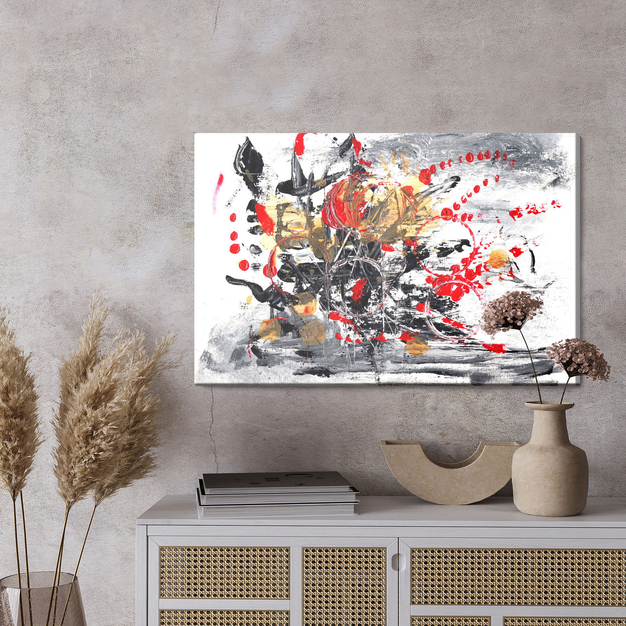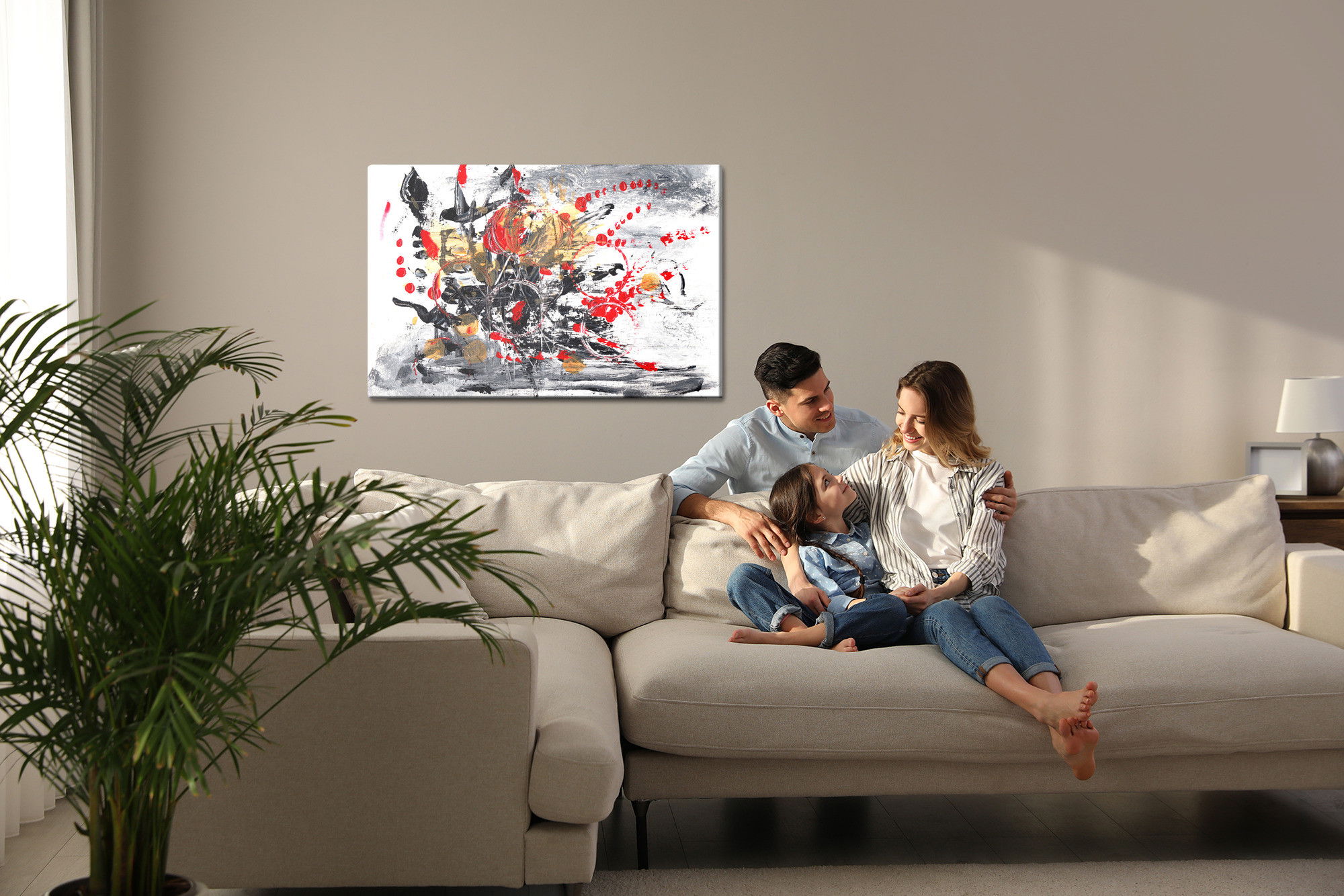 Varje tavla monteras på en massiv fururam. Format upp till 70×50 cm har en ram på 15 mm, medan format från 90×60 cm och uppåt har en ram på 20 mm. Den exakta dukspänningen gör att tavlan håller sin form över tid. Motivet Chaotic abstraction trycks runt hela ramen vilket ger ett stilrent galleriuttryck där tavlan är lika vacker från sidan som framifrån. Kombinationen av rak dukspänning, rena linjer och korrekt tryck ger en professionell finish.