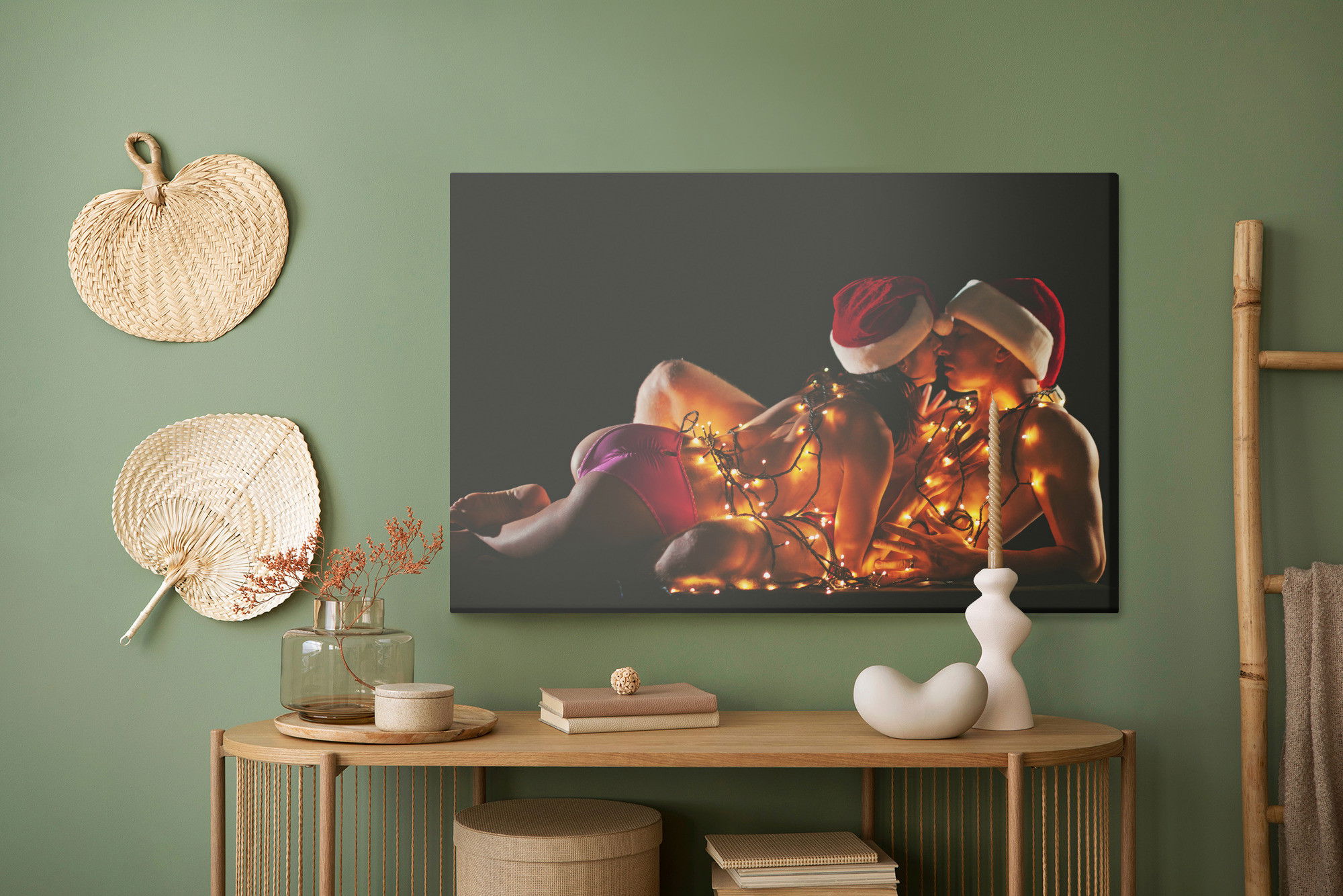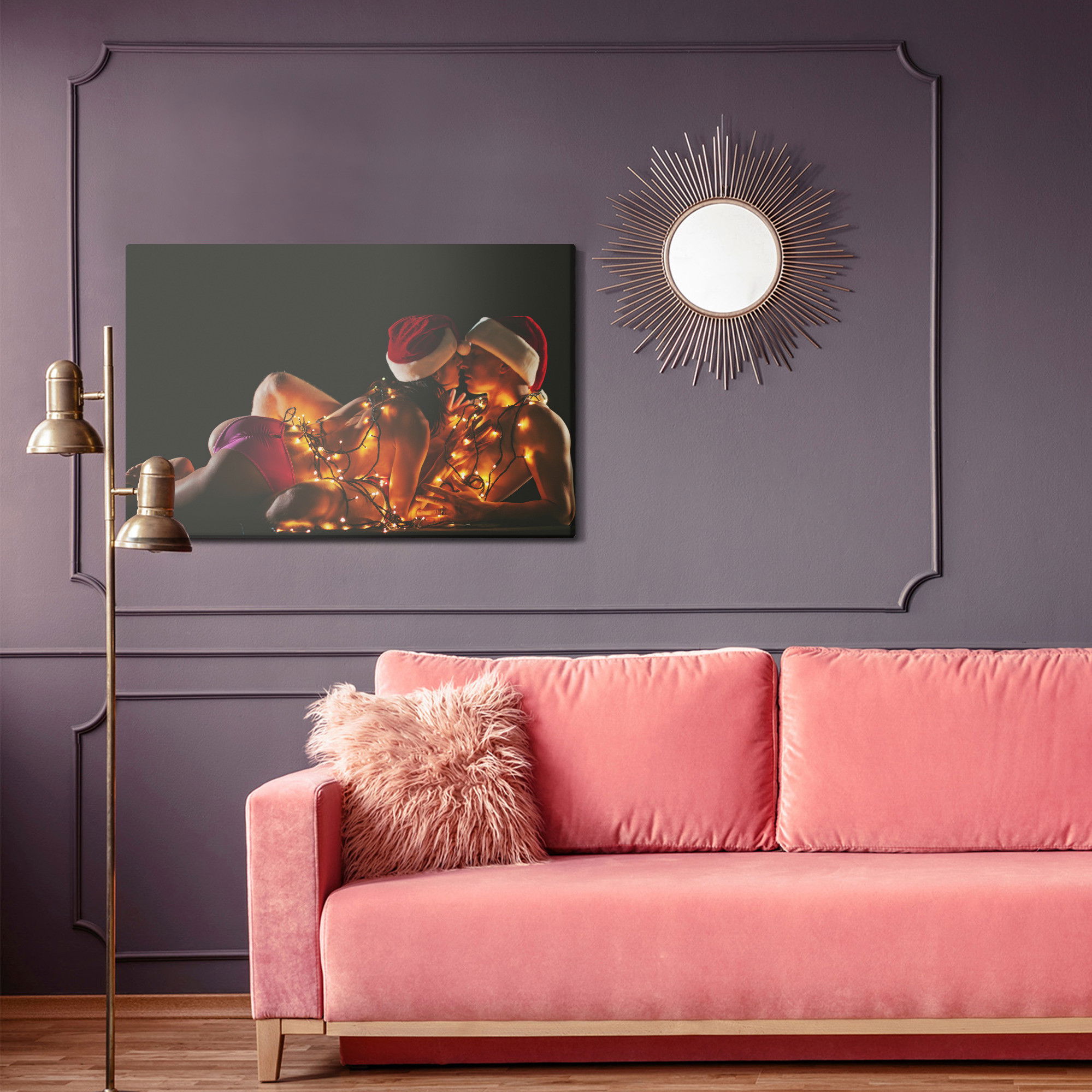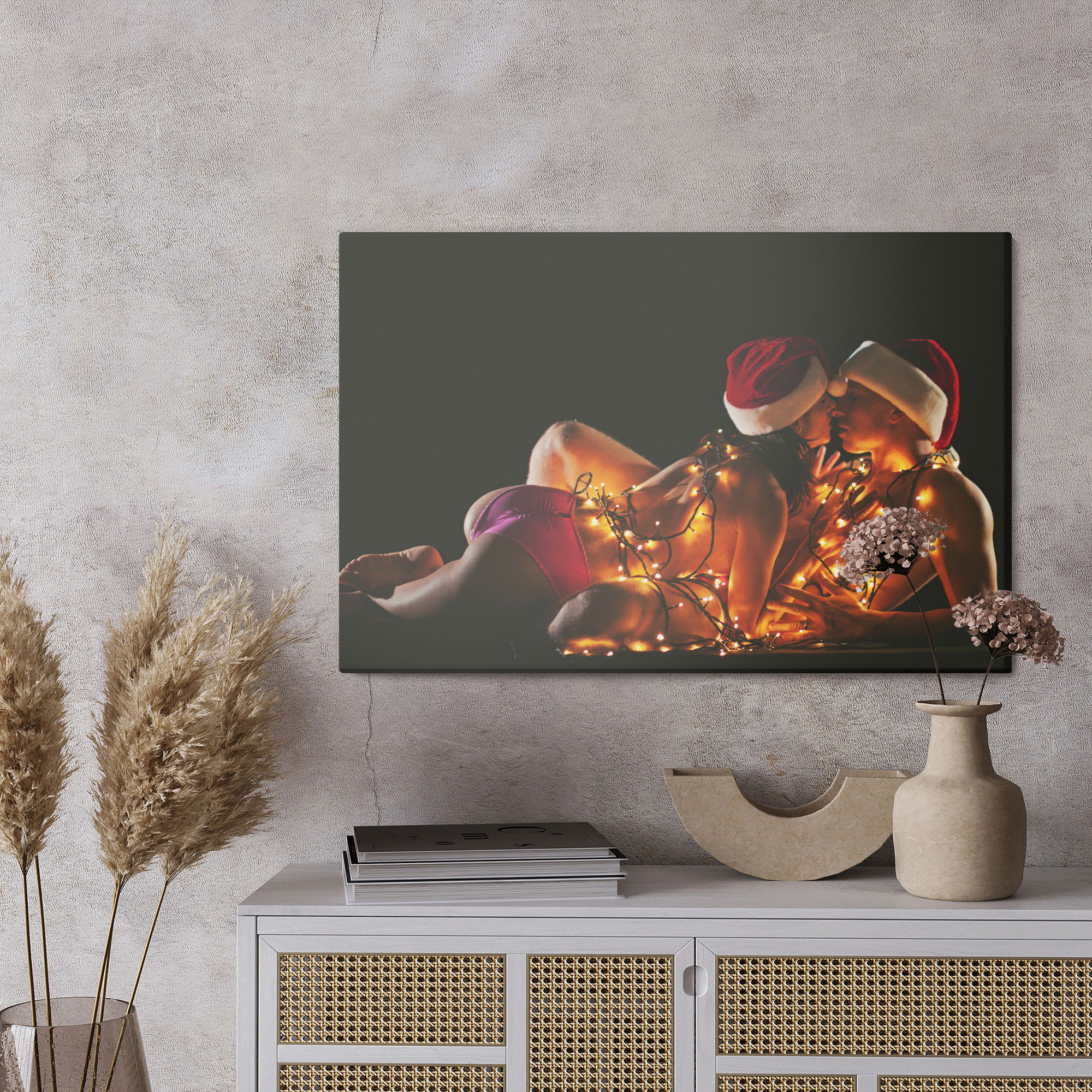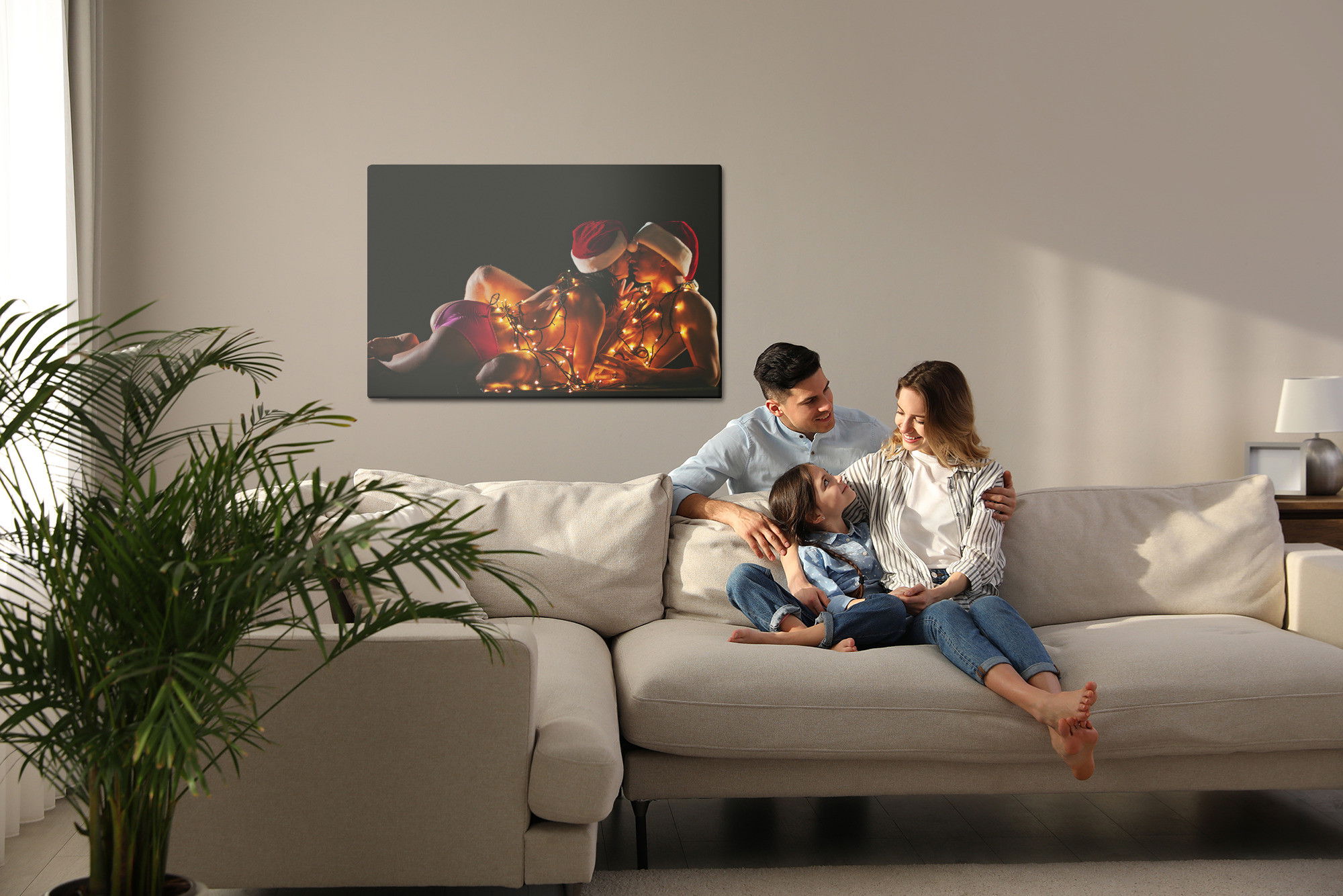 Motivet Christmas couple återges med hög färgprecision och detaljrikedom tack vare HP Latex-teknologi. Trycket sker med vattenbaserade, luktfria och GREENGUARD Gold-certifierade bläck som ger en upplösning på upp till 300 DPI. Färgerna är UV-beständiga och behåller sin styrka även i ljusa rum, vilket gör tavlan lämplig för både hem- och offentliga miljöer.