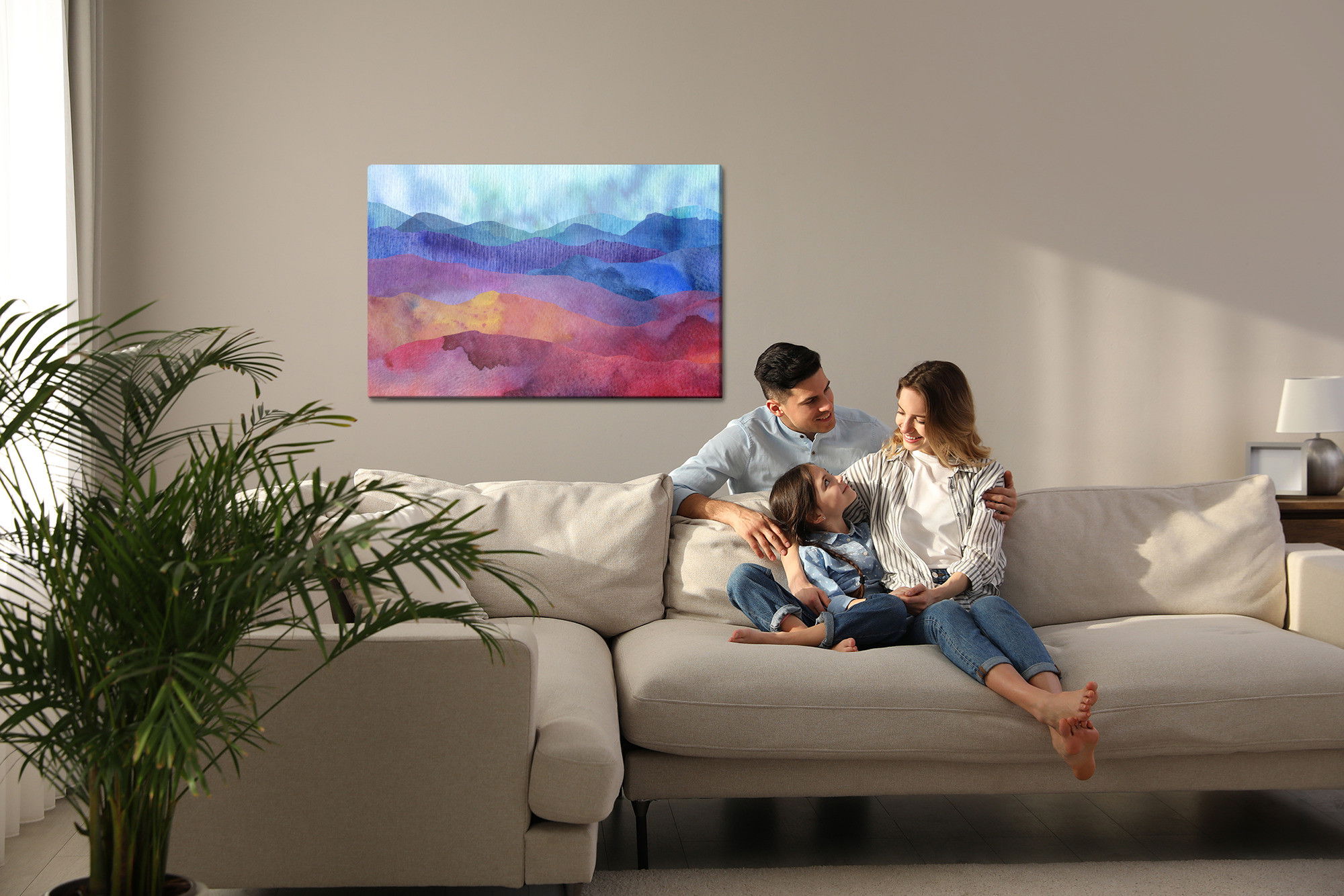 Varje tavla monteras på en massiv fururam. Format upp till 70×50 cm har en ram på 15 mm, medan format från 90×60 cm och uppåt har en ram på 20 mm. Den exakta dukspänningen gör att tavlan håller sin form över tid. Motivet Colorful abstract mountain trycks runt hela ramen vilket ger ett stilrent galleriuttryck där tavlan är lika vacker från sidan som framifrån. Kombinationen av rak dukspänning, rena linjer och korrekt tryck ger en professionell finish.