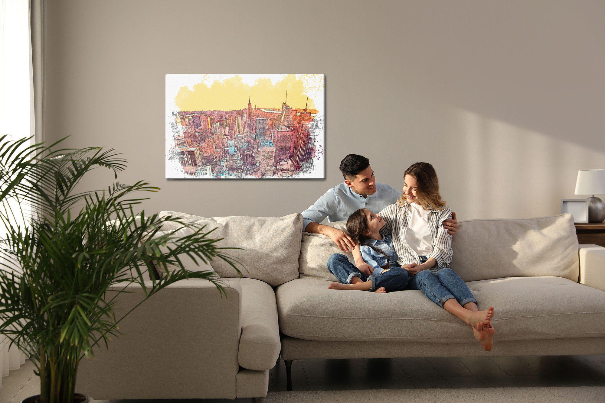 Varje tavla monteras på en massiv fururam. Format upp till 70×50 cm har en ram på 15 mm, medan format från 90×60 cm och uppåt har en ram på 20 mm. Den exakta dukspänningen gör att tavlan håller sin form över tid. Motivet Colorful New York trycks runt hela ramen vilket ger ett stilrent galleriuttryck där tavlan är lika vacker från sidan som framifrån. Kombinationen av rak dukspänning, rena linjer och korrekt tryck ger en professionell finish.