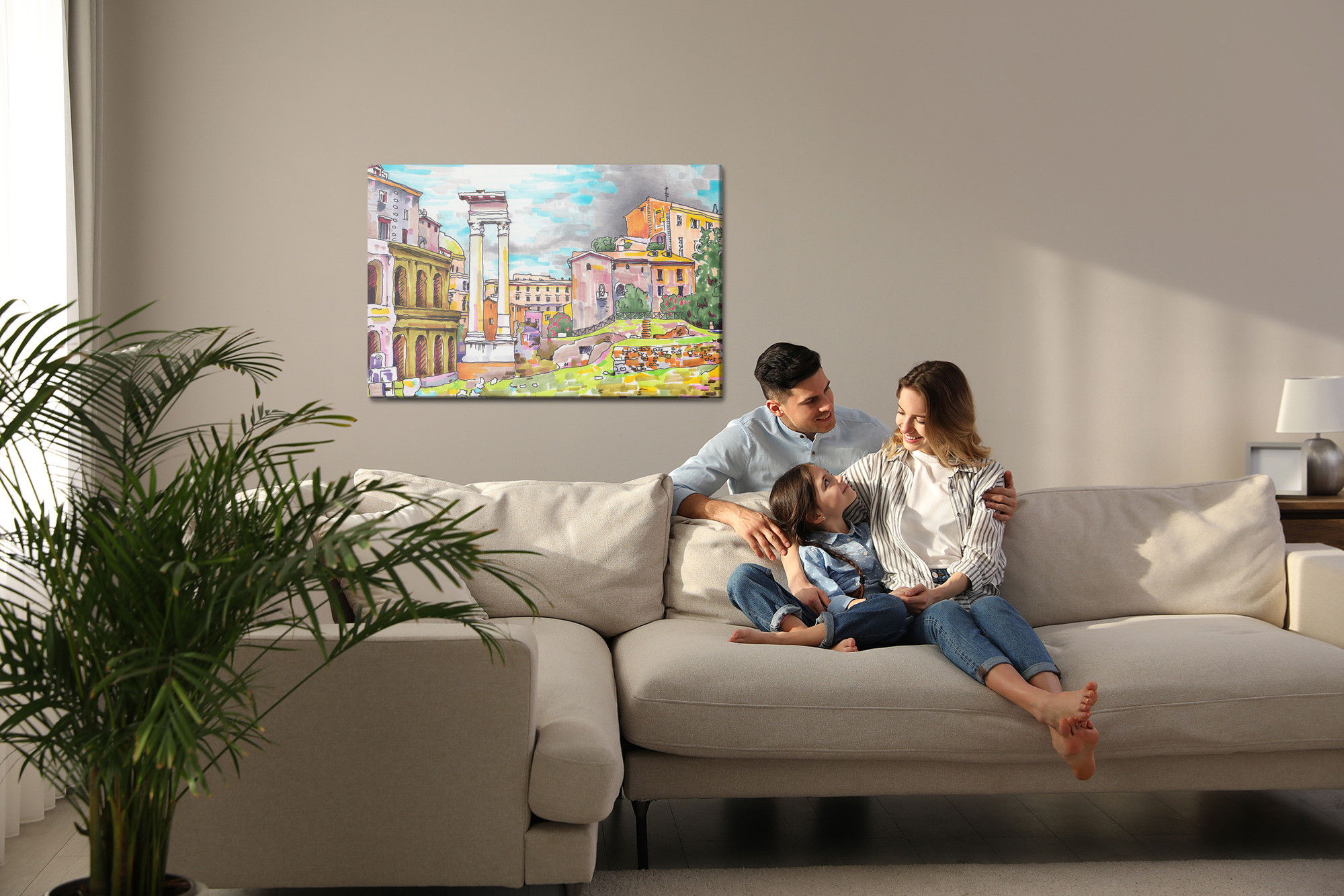 Varje tavla monteras på en massiv fururam. Format upp till 70×50 cm har en ram på 15 mm, medan format från 90×60 cm och uppåt har en ram på 20 mm. Den exakta dukspänningen gör att tavlan håller sin form över tid. Motivet Colors of Rome trycks runt hela ramen vilket ger ett stilrent galleriuttryck där tavlan är lika vacker från sidan som framifrån. Kombinationen av rak dukspänning, rena linjer och korrekt tryck ger en professionell finish.