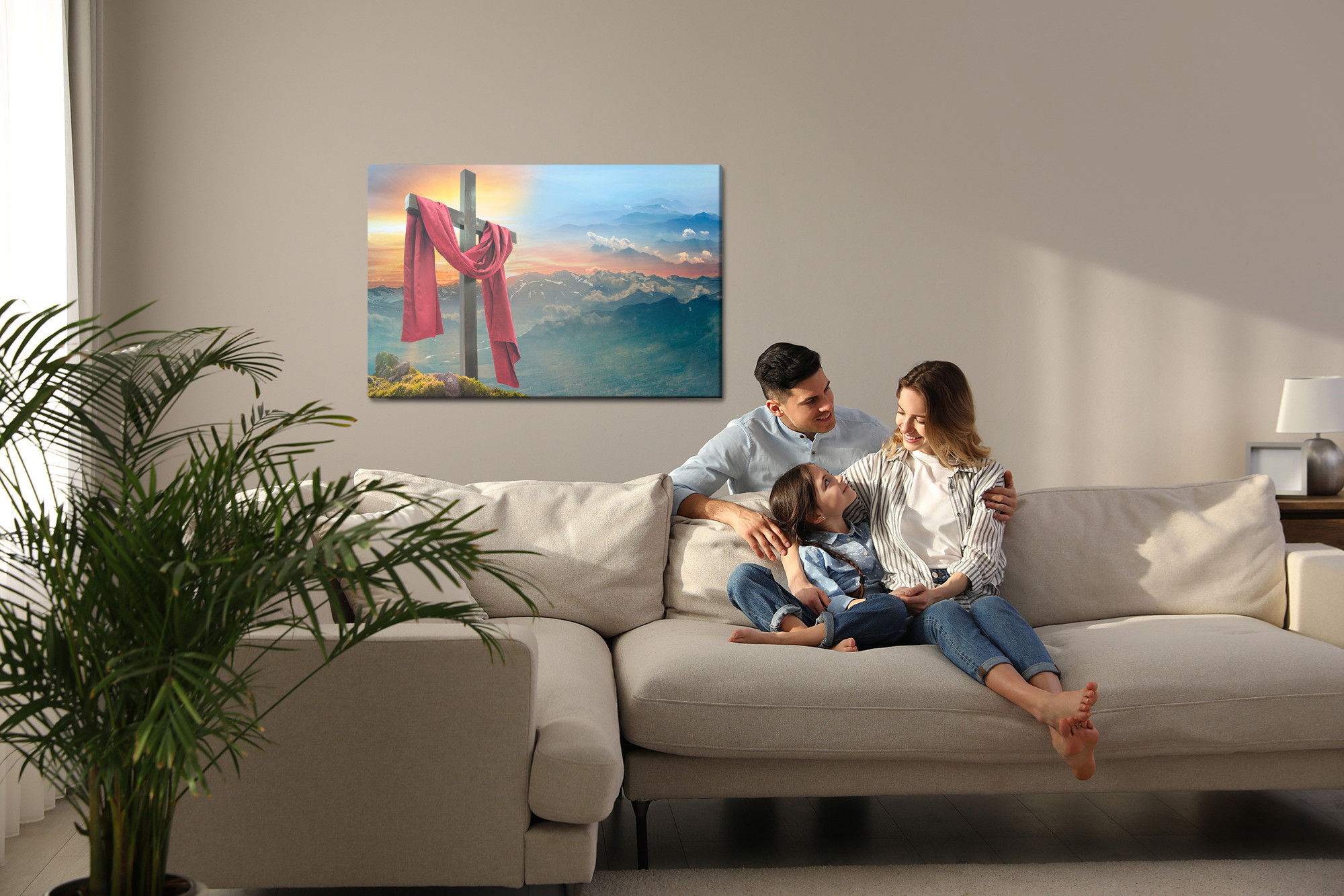 Varje tavla monteras på en massiv fururam. Format upp till 70×50 cm har en ram på 15 mm, medan format från 90×60 cm och uppåt har en ram på 20 mm. Den exakta dukspänningen gör att tavlan håller sin form över tid. Motivet Cross on the background trycks runt hela ramen vilket ger ett stilrent galleriuttryck där tavlan är lika vacker från sidan som framifrån. Kombinationen av rak dukspänning, rena linjer och korrekt tryck ger en professionell finish.