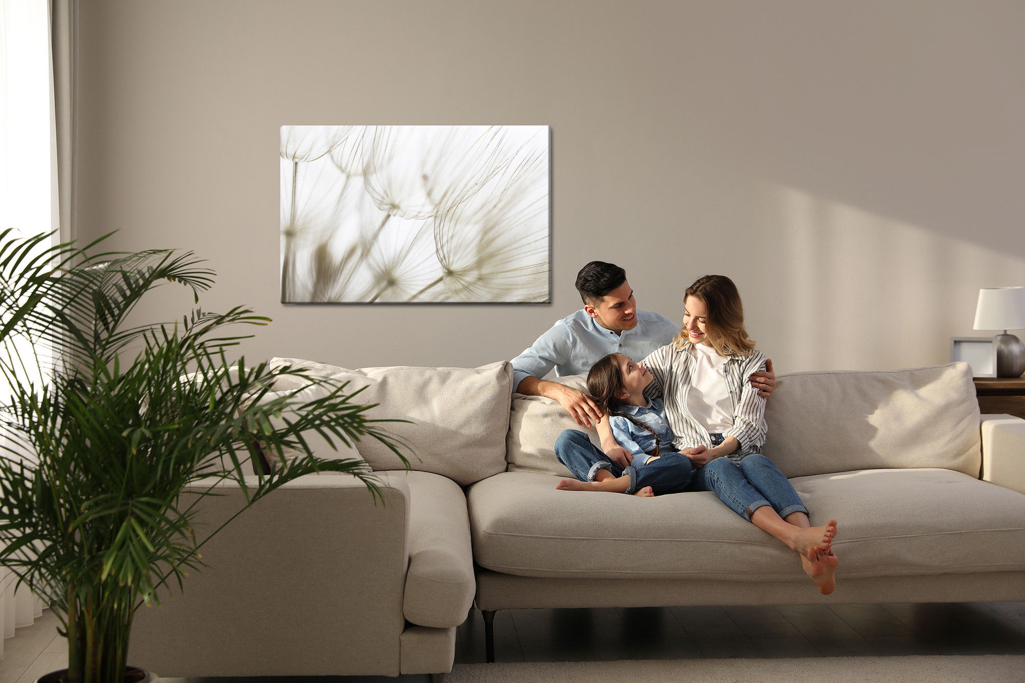 Motivet Dandelion seeds återges med hög färgprecision och detaljrikedom tack vare HP Latex-teknologi. Trycket sker med vattenbaserade, luktfria och GREENGUARD Gold-certifierade bläck som ger en upplösning på upp till 300 DPI. Färgerna är UV-beständiga och behåller sin styrka även i ljusa rum, vilket gör tavlan lämplig för både hem- och offentliga miljöer.