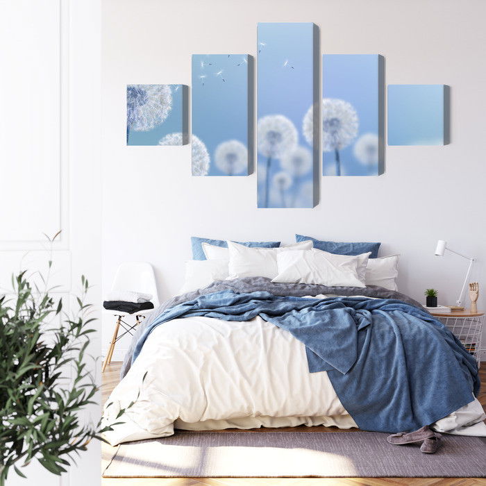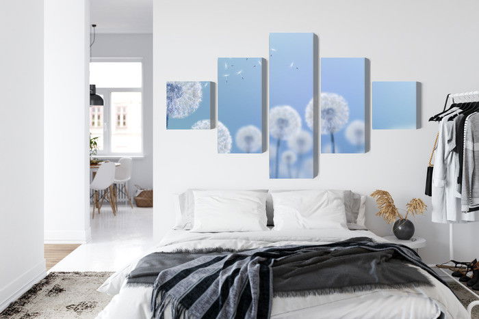 Ljuddämpande tavla – Dandelions on a blue för lugnare rum och mjukare akustik