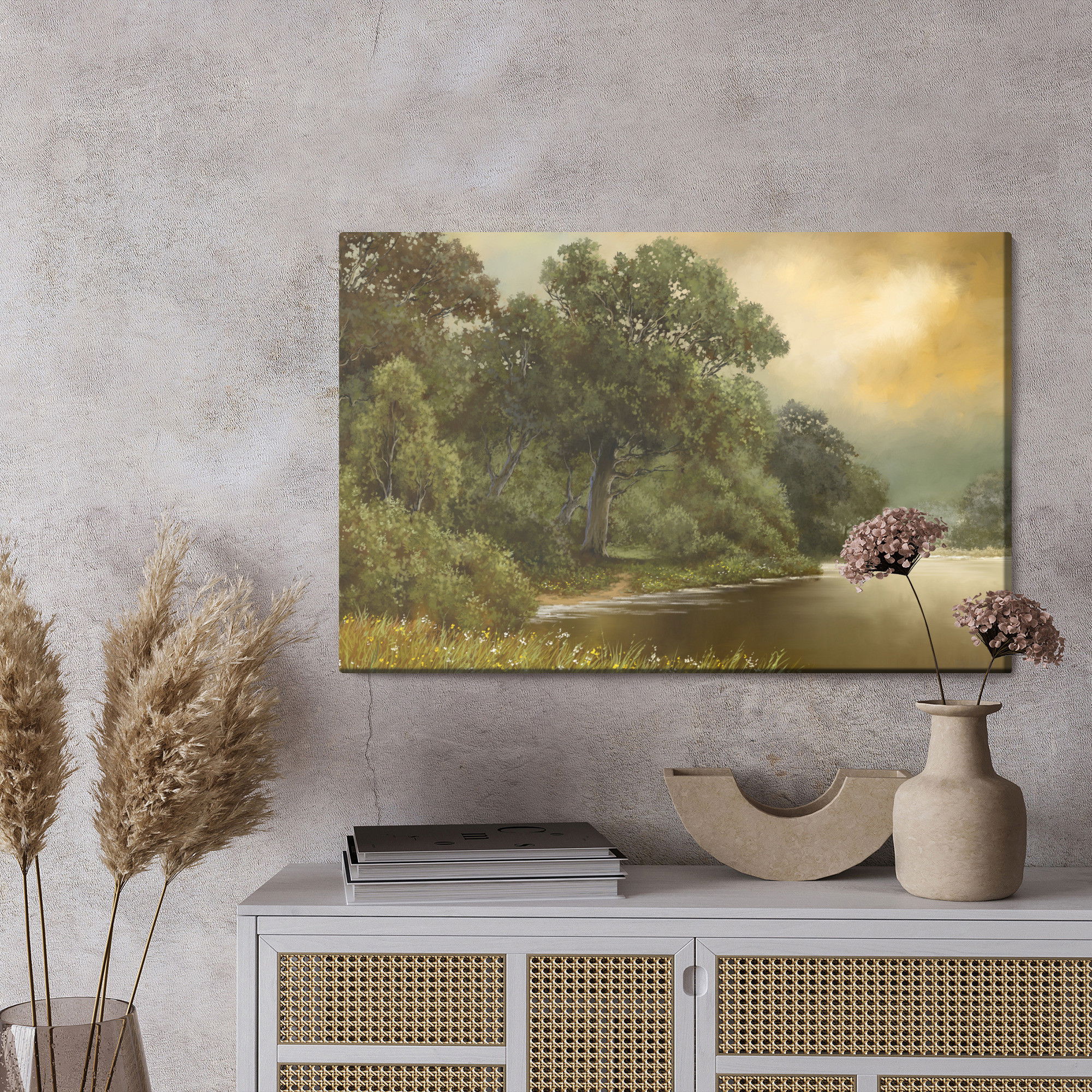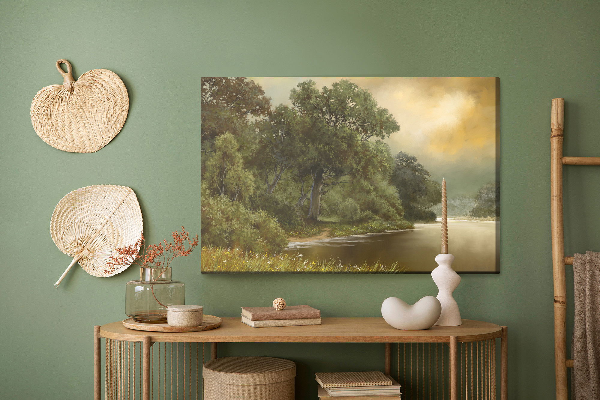 Varje tavla monteras på en massiv fururam. Format upp till 70×50 cm har en ram på 15 mm, medan format från 90×60 cm och uppåt har en ram på 20 mm. Den exakta dukspänningen gör att tavlan håller sin form över tid. Motivet Forest landscape with a river trycks runt hela ramen vilket ger ett stilrent galleriuttryck där tavlan är lika vacker från sidan som framifrån. Kombinationen av rak dukspänning, rena linjer och korrekt tryck ger en professionell finish.