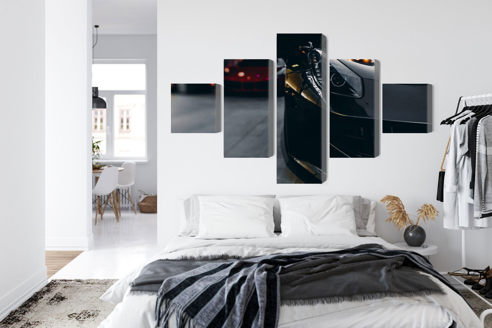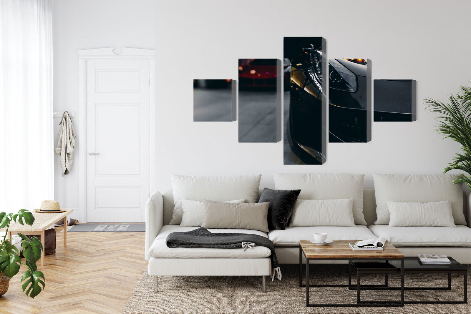 Varje tavla monteras på en massiv fururam. Format upp till 70×50 cm har en ram på 15 mm, medan format från 90×60 cm och uppåt har en ram på 20 mm. Den exakta dukspänningen gör att tavlan håller sin form över tid. Motivet Front of a black sports car trycks runt hela ramen vilket ger ett stilrent galleriuttryck där tavlan är lika vacker från sidan som framifrån. Kombinationen av rak dukspänning, rena linjer och korrekt tryck ger en professionell finish.