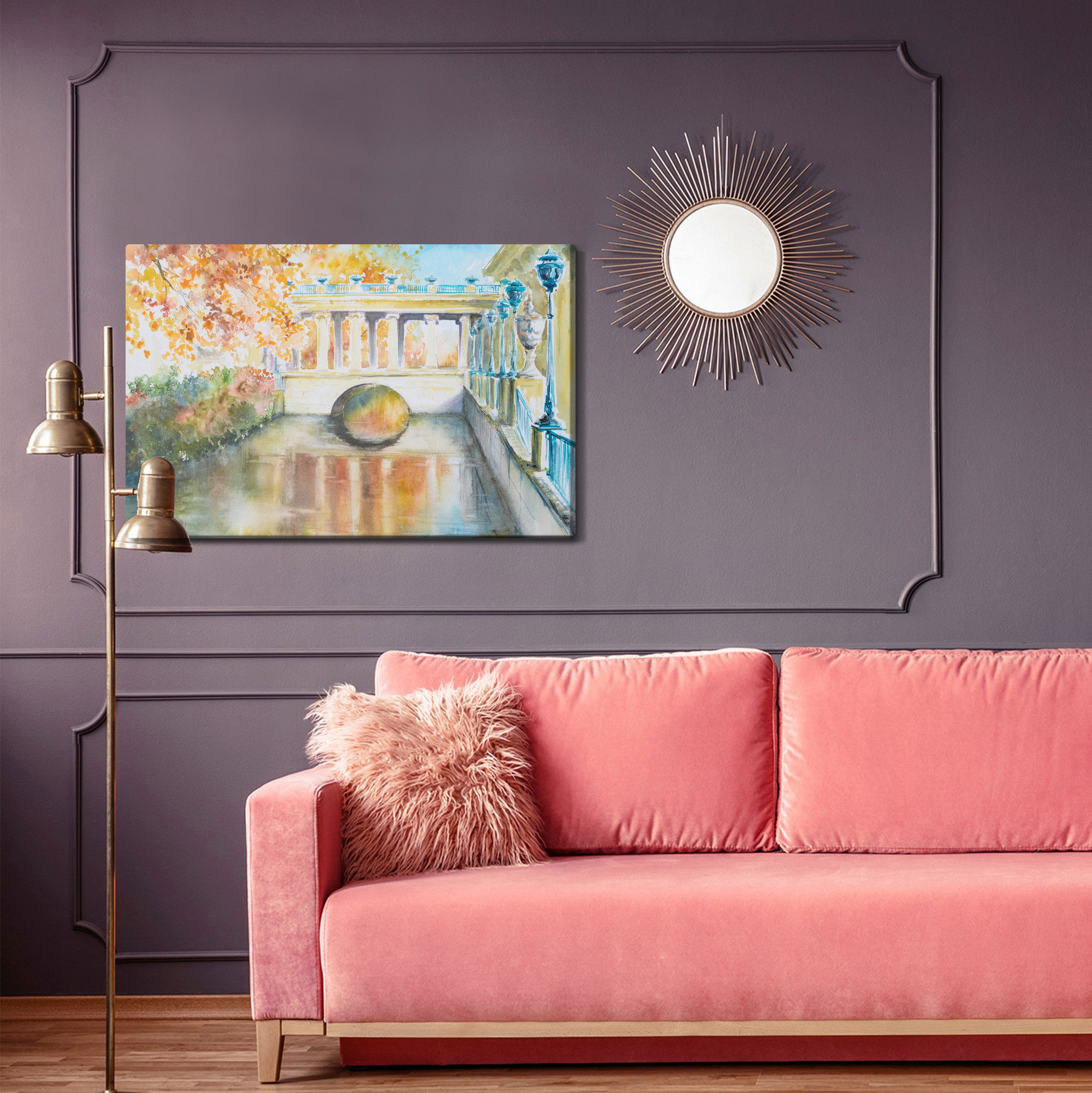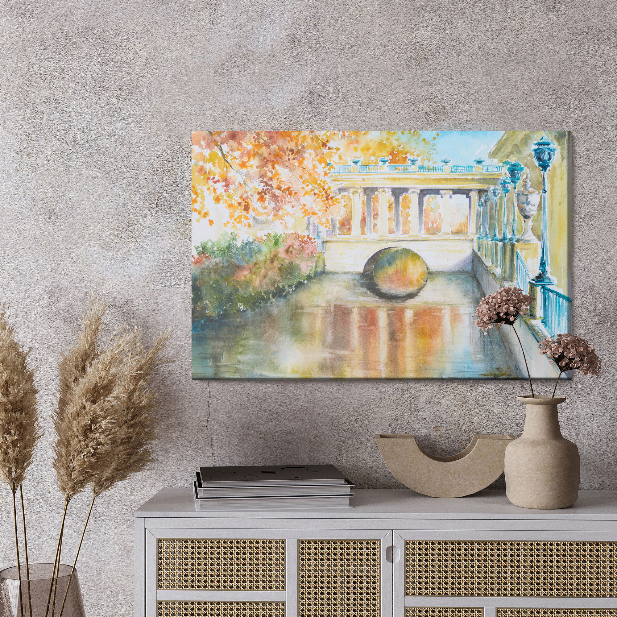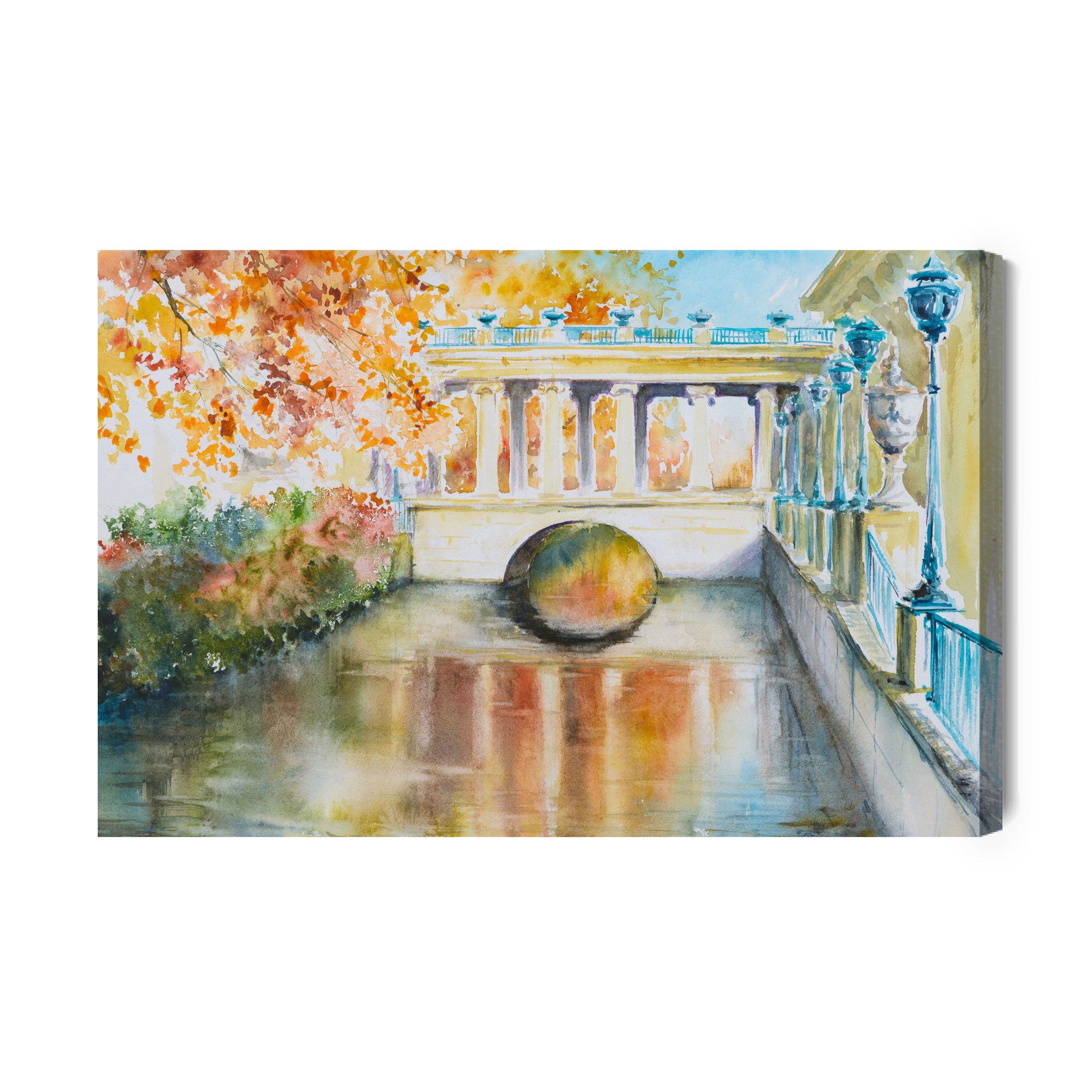 Varje tavla monteras på en massiv fururam. Format upp till 70×50 cm har en ram på 15 mm, medan format från 90×60 cm och uppåt har en ram på 20 mm. Den exakta dukspänningen gör att tavlan håller sin form över tid. Motivet Historic park in Warsaw trycks runt hela ramen vilket ger ett stilrent galleriuttryck där tavlan är lika vacker från sidan som framifrån. Kombinationen av rak dukspänning, rena linjer och korrekt tryck ger en professionell finish.