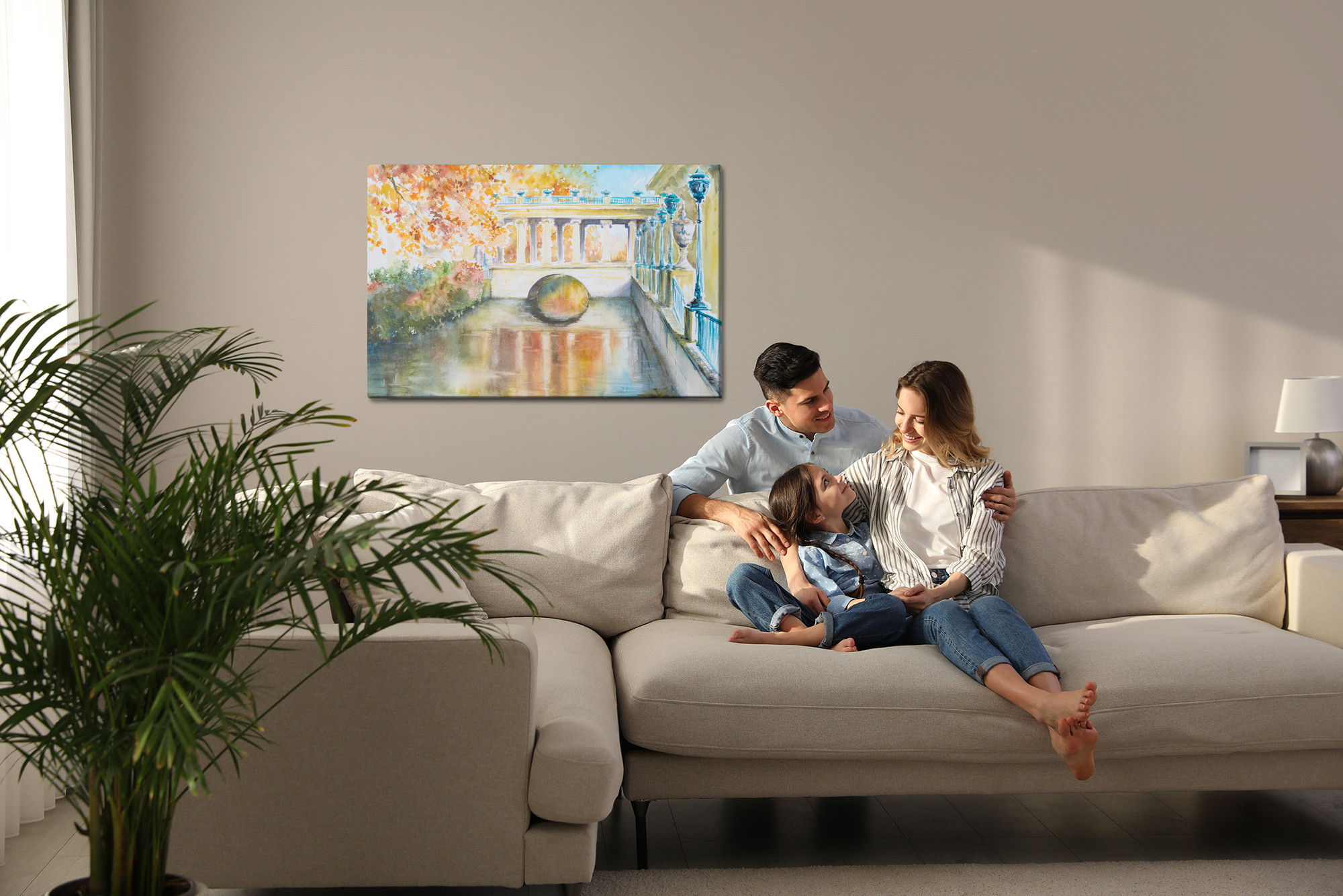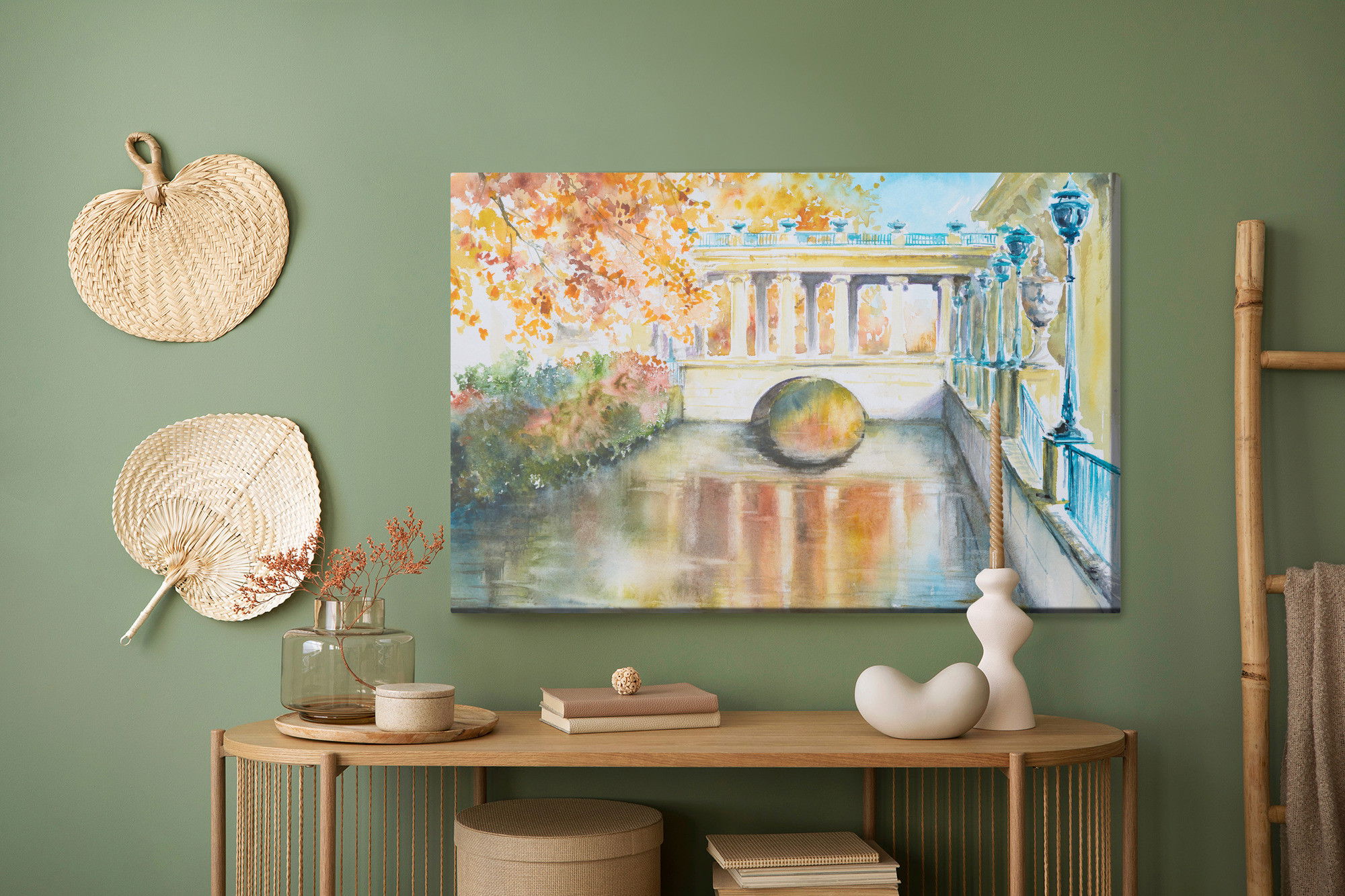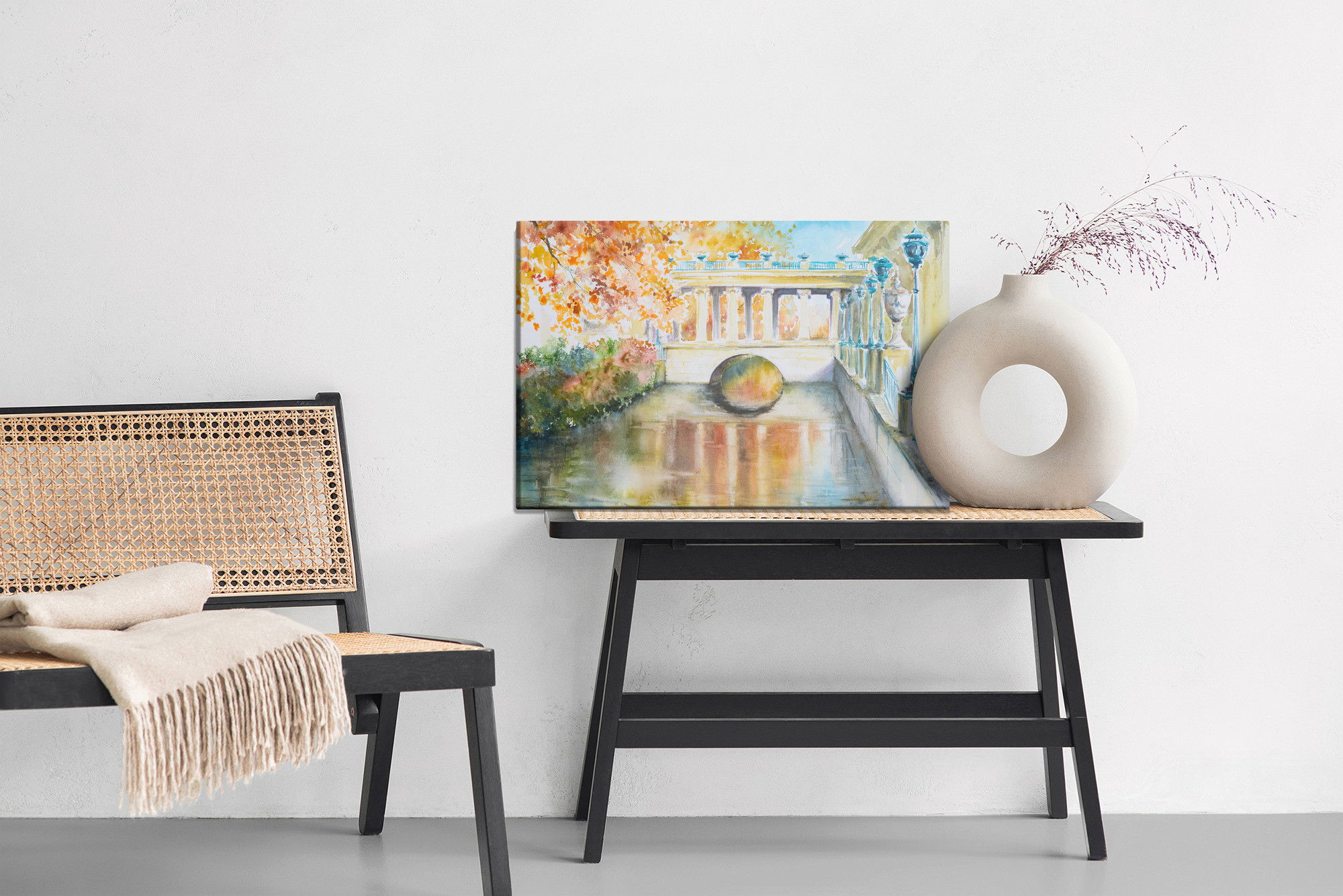 Varje tavla monteras på en massiv fururam. Format upp till 70×50 cm har en ram på 15 mm, medan format från 90×60 cm och uppåt har en ram på 20 mm. Den exakta dukspänningen gör att tavlan håller sin form över tid. Motivet Historic park in Warsaw trycks runt hela ramen vilket ger ett stilrent galleriuttryck där tavlan är lika vacker från sidan som framifrån. Kombinationen av rak dukspänning, rena linjer och korrekt tryck ger en professionell finish.