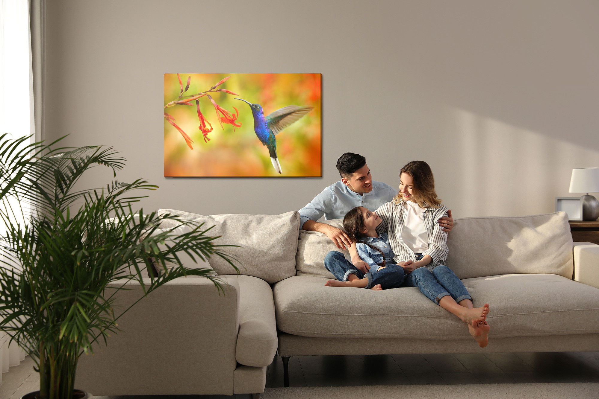 Varje tavla monteras på en massiv fururam. Format upp till 70×50 cm har en ram på 15 mm, medan format från 90×60 cm och uppåt har en ram på 20 mm. Den exakta dukspänningen gör att tavlan håller sin form över tid. Motivet Hummingbird bird and flowers trycks runt hela ramen vilket ger ett stilrent galleriuttryck där tavlan är lika vacker från sidan som framifrån. Kombinationen av rak dukspänning, rena linjer och korrekt tryck ger en professionell finish.