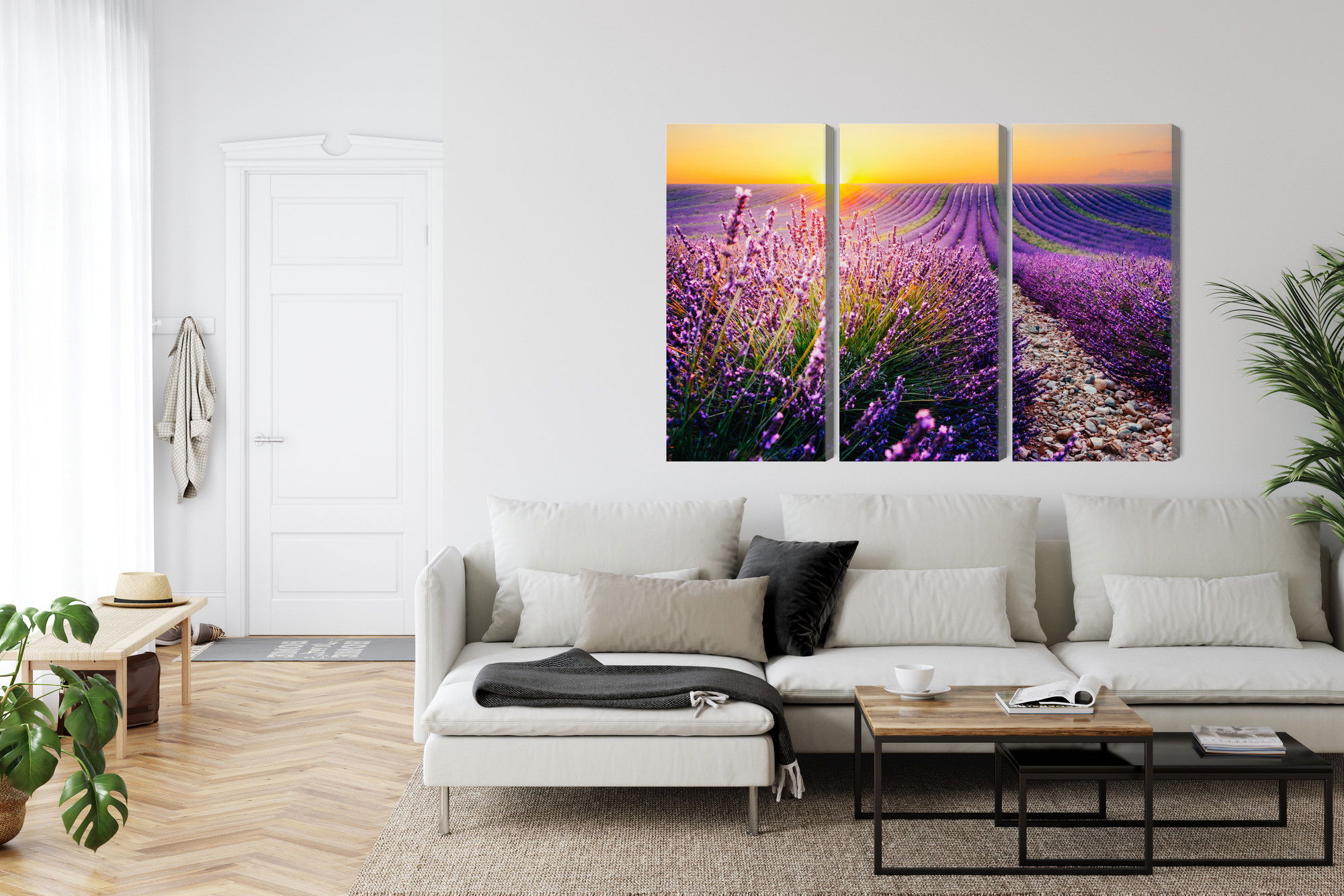 Varje tavla monteras på en massiv fururam. Format upp till 70×50 cm har en ram på 15 mm, medan format från 90×60 cm och uppåt har en ram på 20 mm. Den exakta dukspänningen gör att tavlan håller sin form över tid. Motivet Lavender field at sunset 3d trycks runt hela ramen vilket ger ett stilrent galleriuttryck där tavlan är lika vacker från sidan som framifrån. Kombinationen av rak dukspänning, rena linjer och korrekt tryck ger en professionell finish.