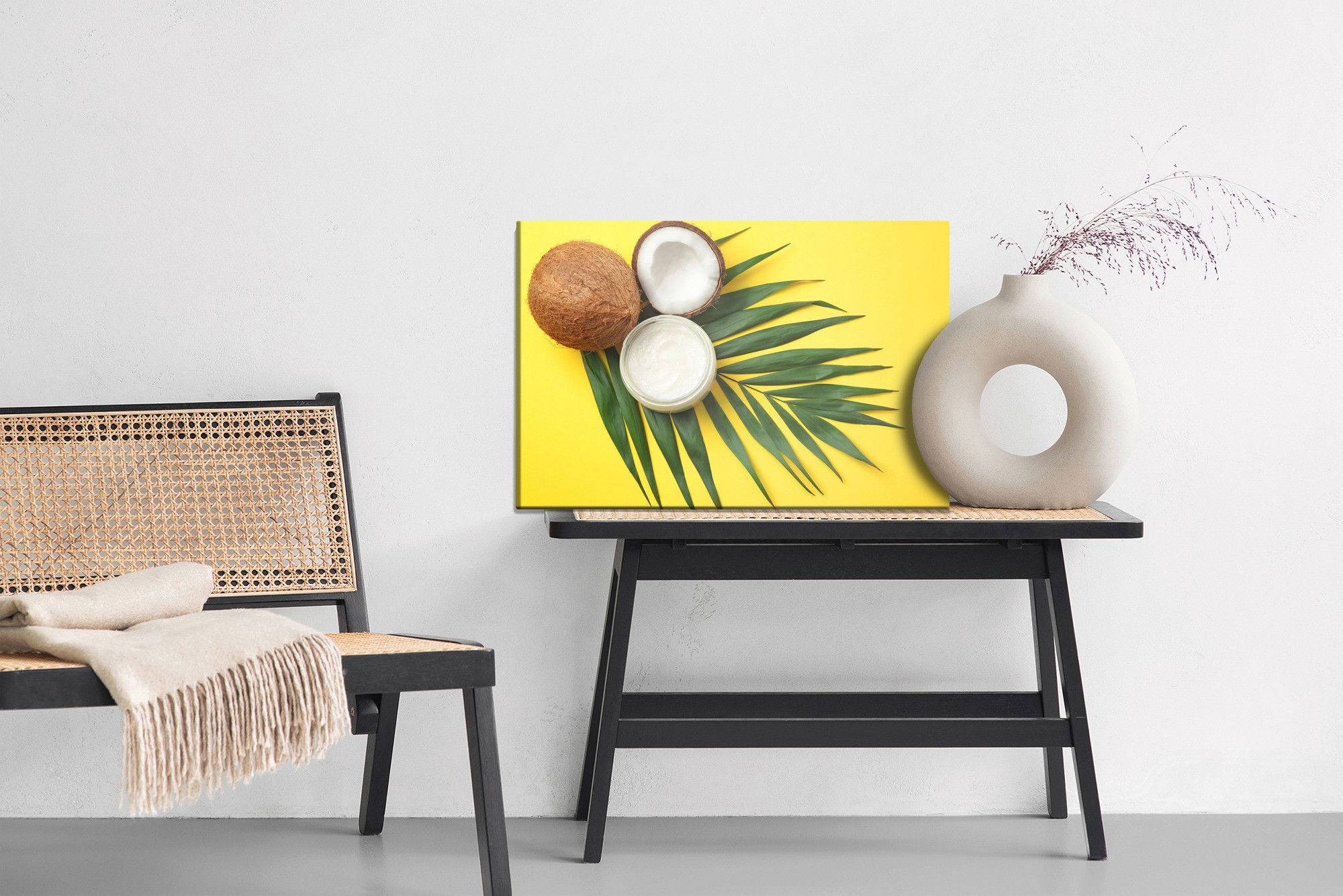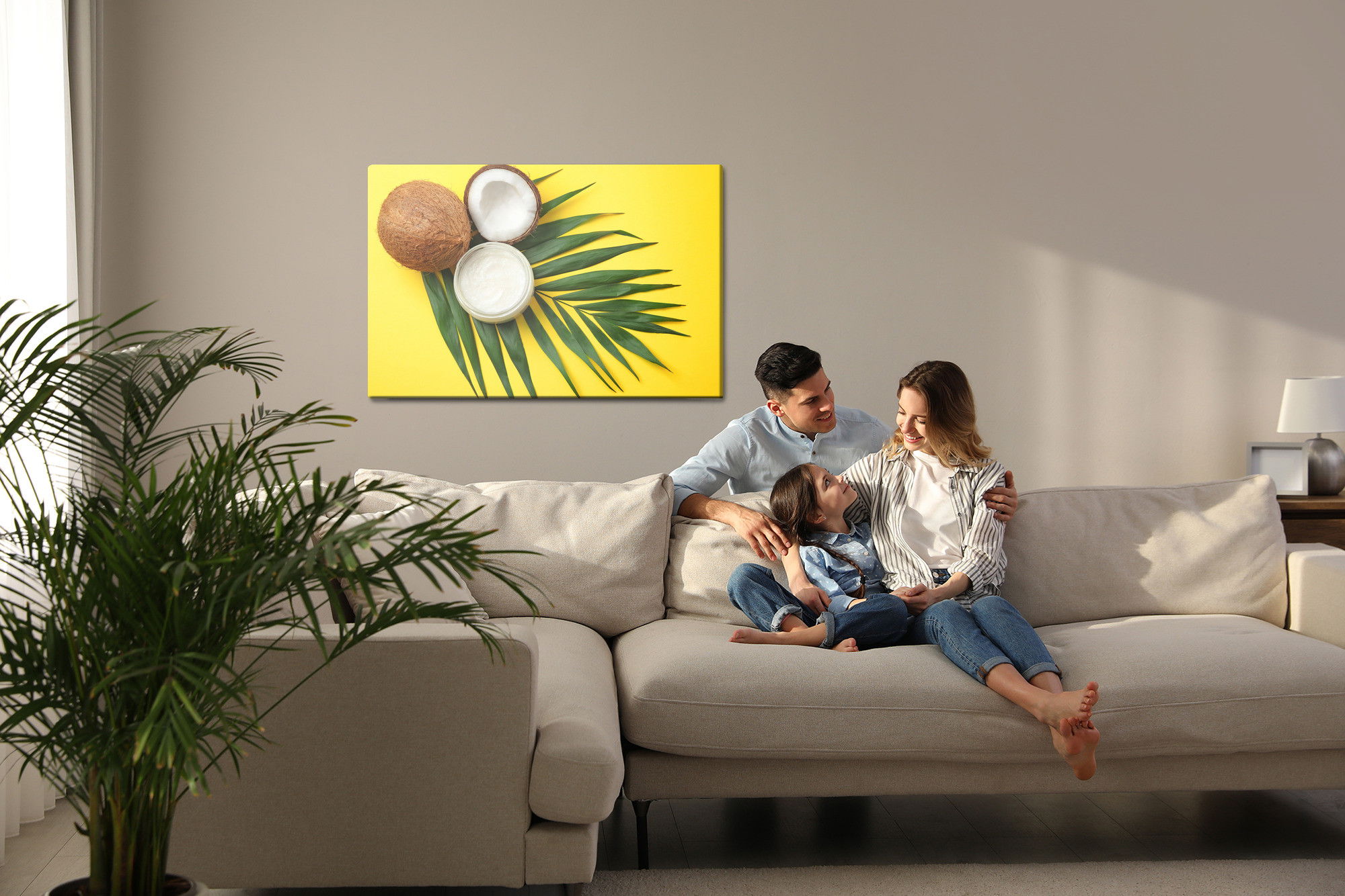 Motivet Leaf and coconut fruit återges med hög färgprecision och detaljrikedom tack vare HP Latex-teknologi. Trycket sker med vattenbaserade, luktfria och GREENGUARD Gold-certifierade bläck som ger en upplösning på upp till 300 DPI. Färgerna är UV-beständiga och behåller sin styrka även i ljusa rum, vilket gör tavlan lämplig för både hem- och offentliga miljöer.