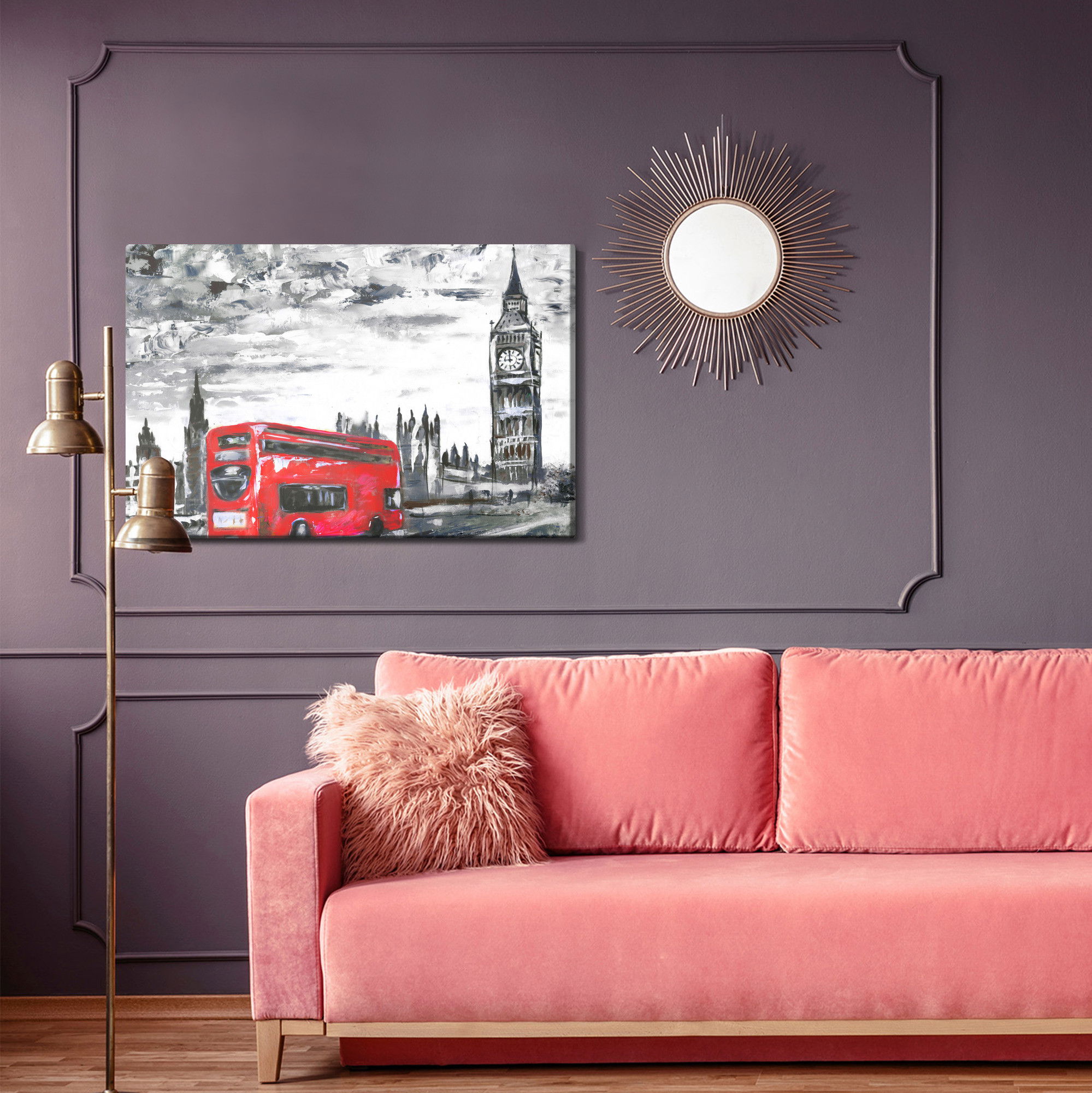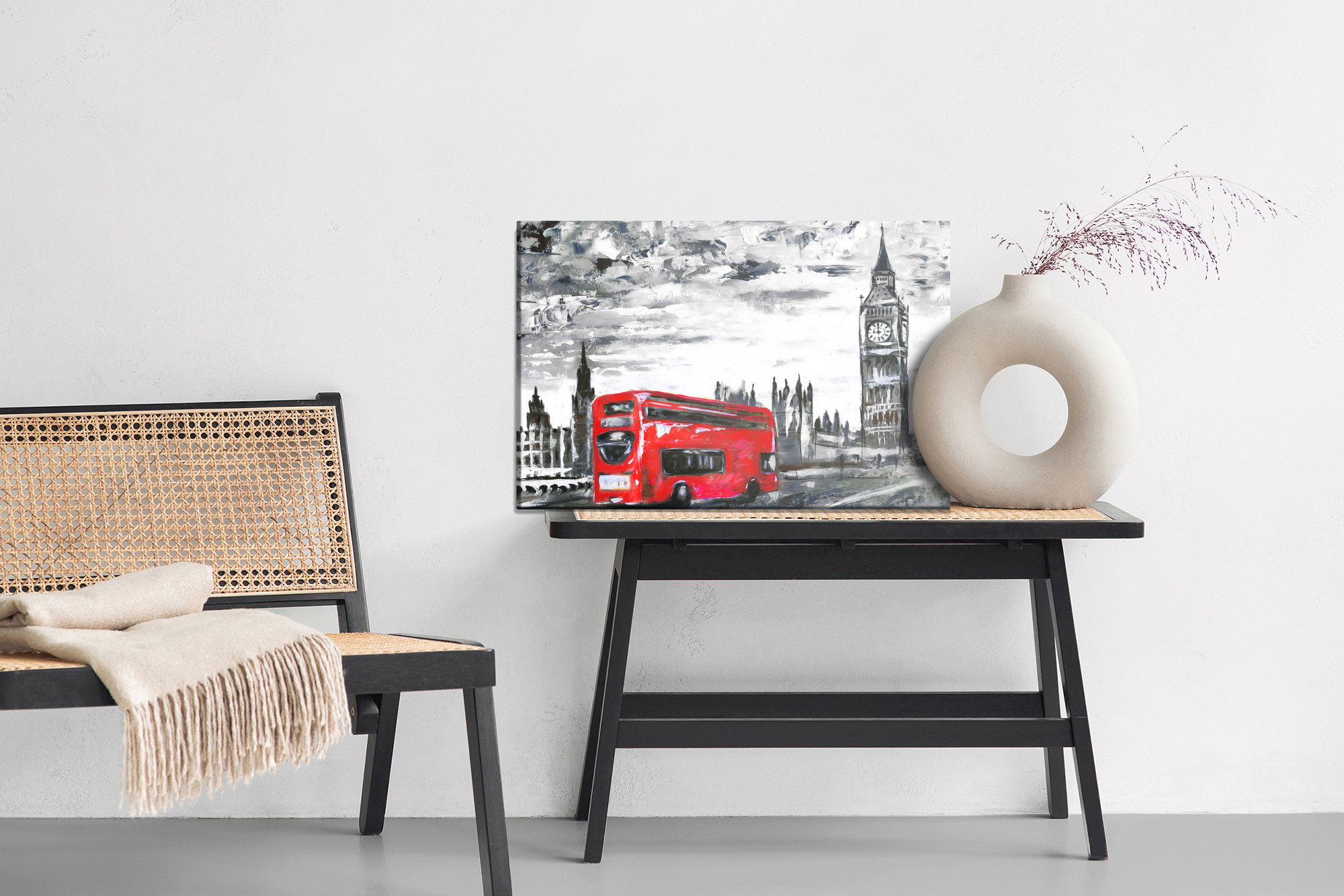 Varje tavla monteras på en massiv fururam. Format upp till 70×50 cm har en ram på 15 mm, medan format från 90×60 cm och uppåt har en ram på 20 mm. Den exakta dukspänningen gör att tavlan håller sin form över tid. Motivet London bus on the way trycks runt hela ramen vilket ger ett stilrent galleriuttryck där tavlan är lika vacker från sidan som framifrån. Kombinationen av rak dukspänning, rena linjer och korrekt tryck ger en professionell finish.