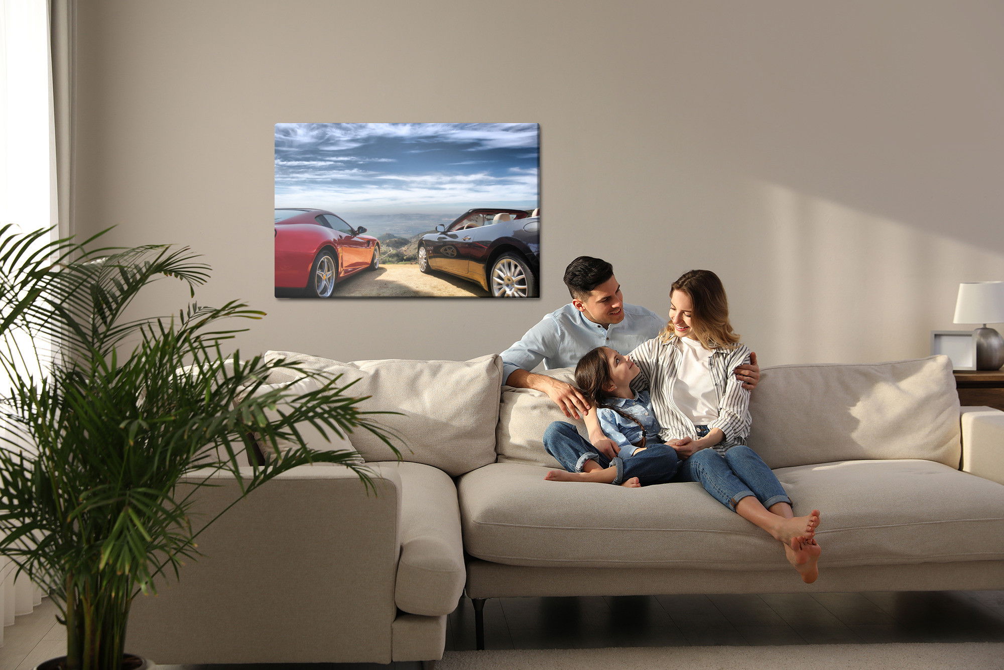 Motivet Luxurious cars in front återges med hög färgprecision och detaljrikedom tack vare HP Latex-teknologi. Trycket sker med vattenbaserade, luktfria och GREENGUARD Gold-certifierade bläck som ger en upplösning på upp till 300 DPI. Färgerna är UV-beständiga och behåller sin styrka även i ljusa rum, vilket gör tavlan lämplig för både hem- och offentliga miljöer.