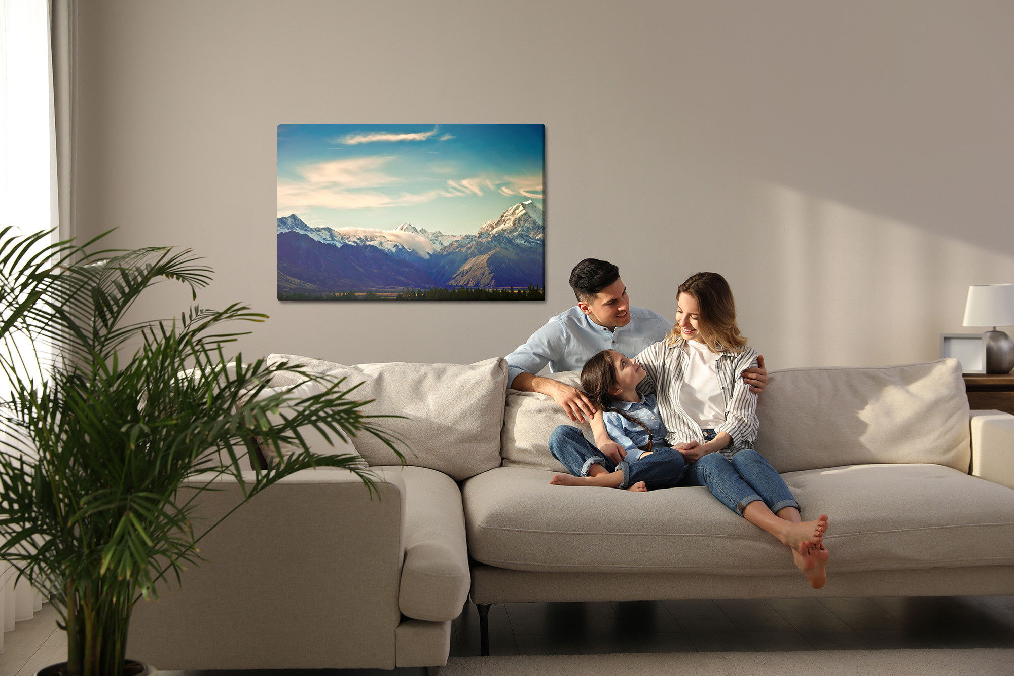 Varje tavla monteras på en massiv fururam. Format upp till 70×50 cm har en ram på 15 mm, medan format från 90×60 cm och uppåt har en ram på 20 mm. Den exakta dukspänningen gör att tavlan håller sin form över tid. Motivet Mount cook national park trycks runt hela ramen vilket ger ett stilrent galleriuttryck där tavlan är lika vacker från sidan som framifrån. Kombinationen av rak dukspänning, rena linjer och korrekt tryck ger en professionell finish.