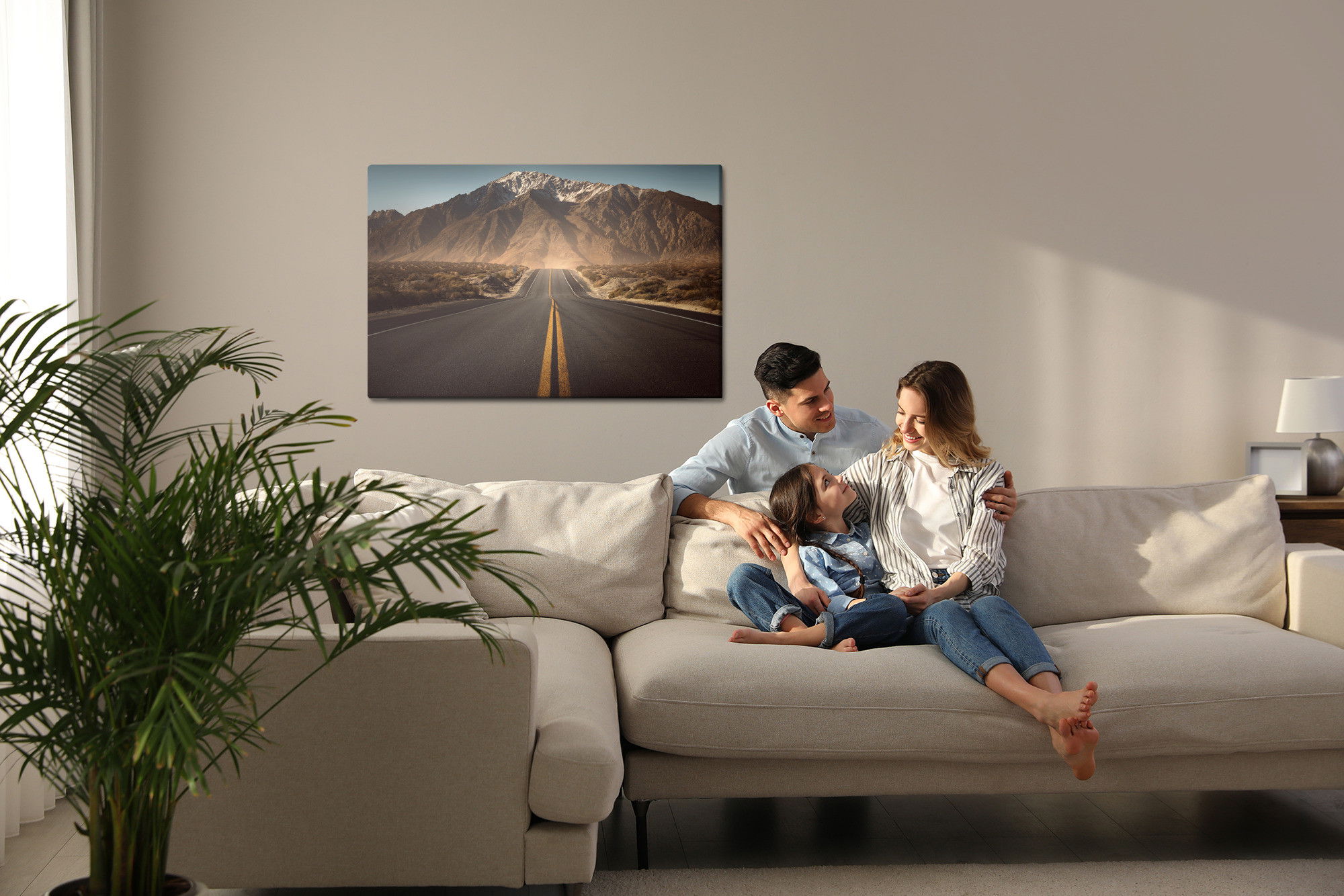 Motivet Mountain road återges med hög färgprecision och detaljrikedom tack vare HP Latex-teknologi. Trycket sker med vattenbaserade, luktfria och GREENGUARD Gold-certifierade bläck som ger en upplösning på upp till 300 DPI. Färgerna är UV-beständiga och behåller sin styrka även i ljusa rum, vilket gör tavlan lämplig för både hem- och offentliga miljöer.