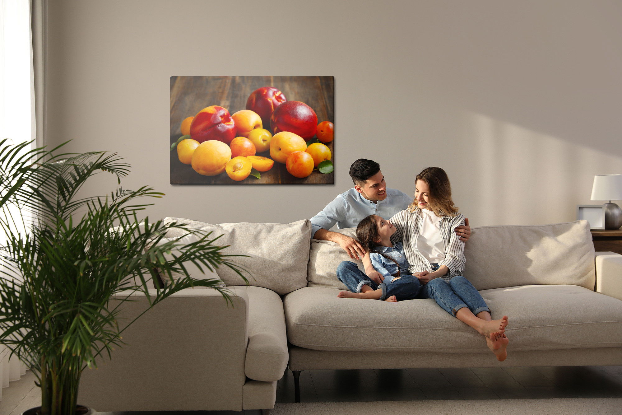 Motivet Nectarines with apricots återges med hög färgprecision och detaljrikedom tack vare HP Latex-teknologi. Trycket sker med vattenbaserade, luktfria och GREENGUARD Gold-certifierade bläck som ger en upplösning på upp till 300 DPI. Färgerna är UV-beständiga och behåller sin styrka även i ljusa rum, vilket gör tavlan lämplig för både hem- och offentliga miljöer.