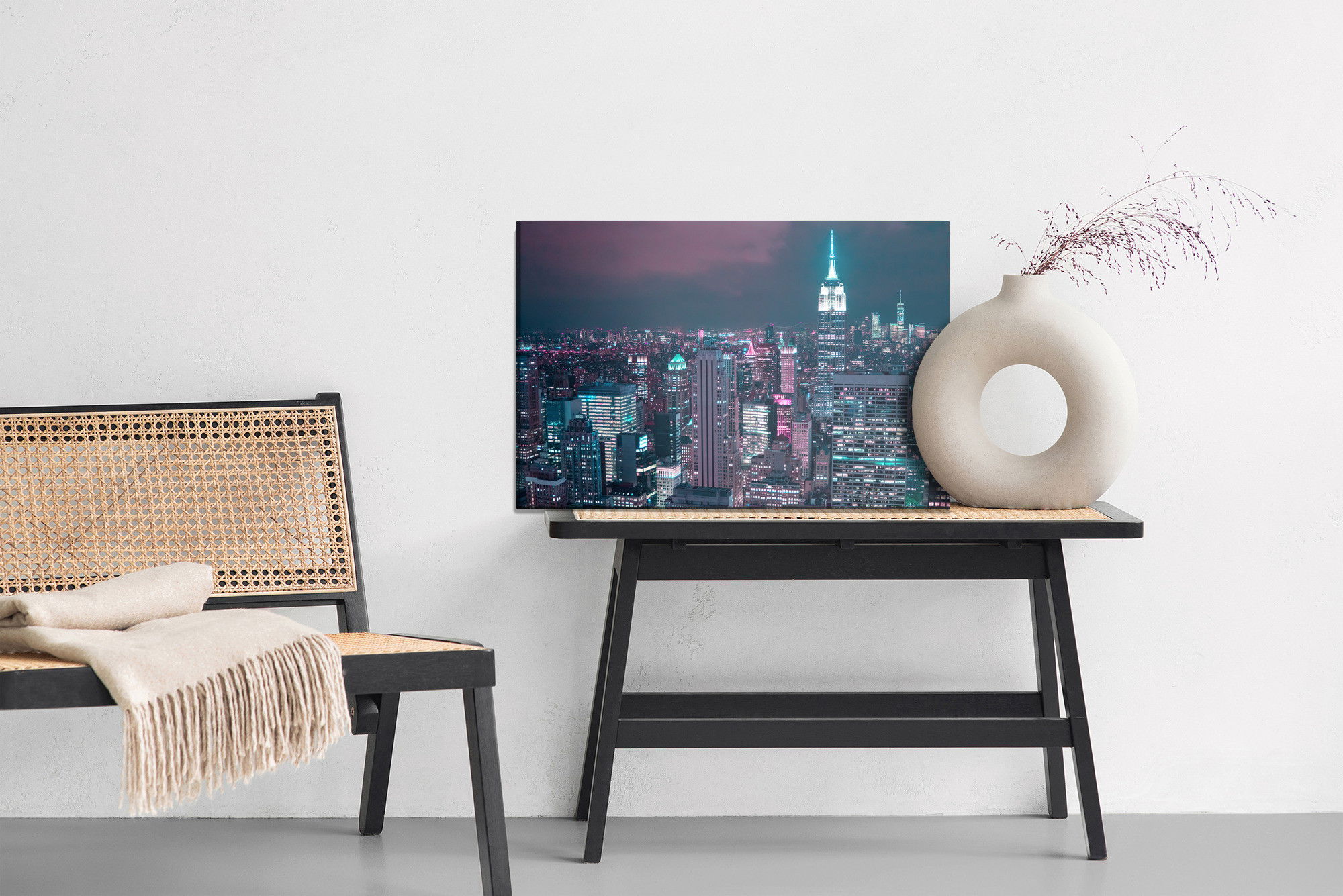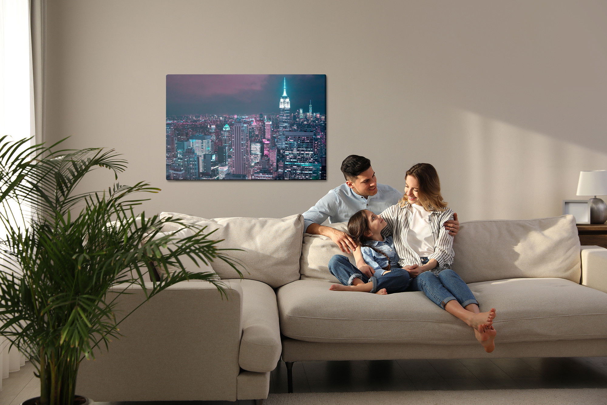 Varje tavla monteras på en massiv fururam. Format upp till 70×50 cm har en ram på 15 mm, medan format från 90×60 cm och uppåt har en ram på 20 mm. Den exakta dukspänningen gör att tavlan håller sin form över tid. Motivet New York by night trycks runt hela ramen vilket ger ett stilrent galleriuttryck där tavlan är lika vacker från sidan som framifrån. Kombinationen av rak dukspänning, rena linjer och korrekt tryck ger en professionell finish.