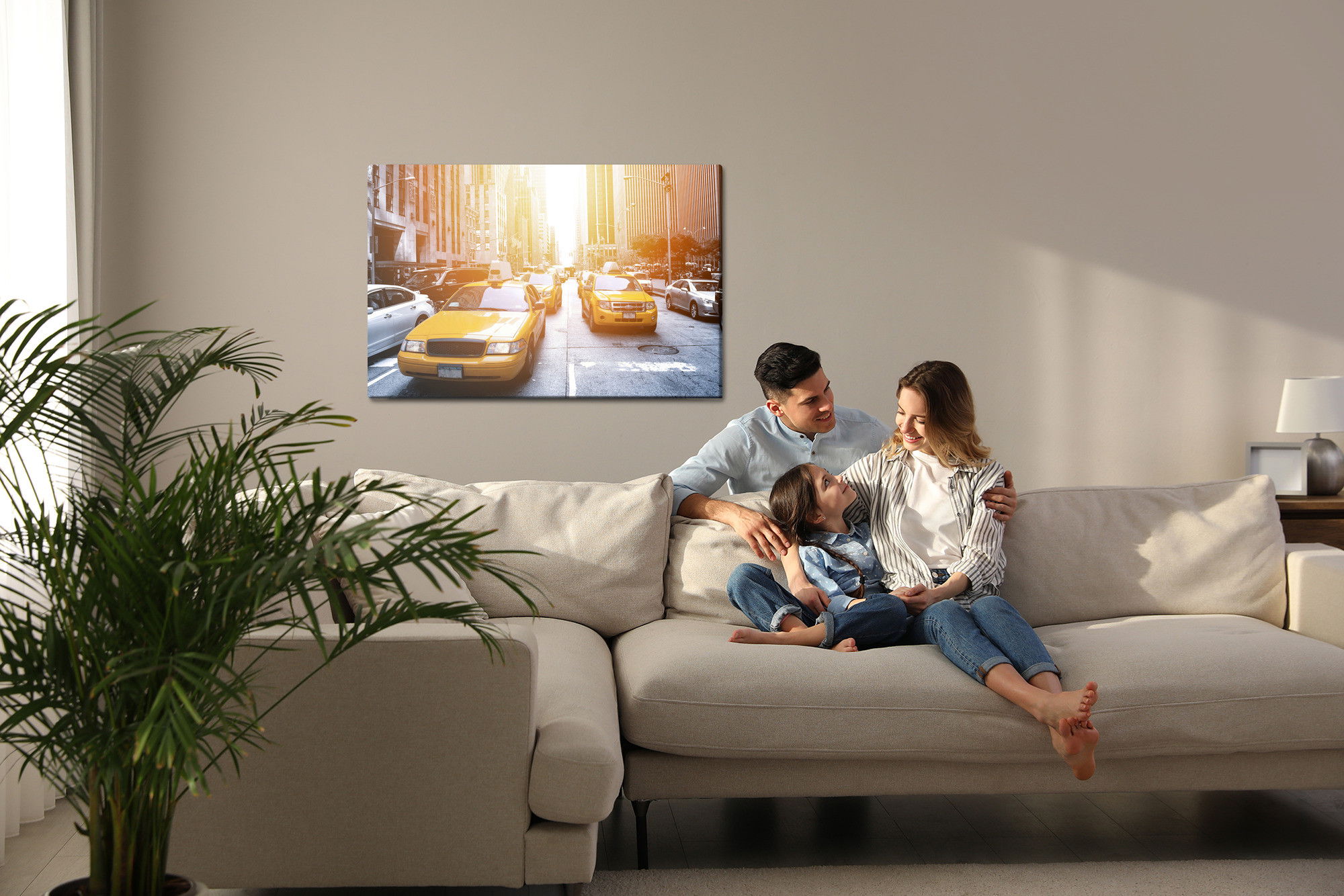 Varje tavla monteras på en massiv fururam. Format upp till 70×50 cm har en ram på 15 mm, medan format från 90×60 cm och uppåt har en ram på 20 mm. Den exakta dukspänningen gör att tavlan håller sin form över tid. Motivet New York city taxis 3d trycks runt hela ramen vilket ger ett stilrent galleriuttryck där tavlan är lika vacker från sidan som framifrån. Kombinationen av rak dukspänning, rena linjer och korrekt tryck ger en professionell finish.