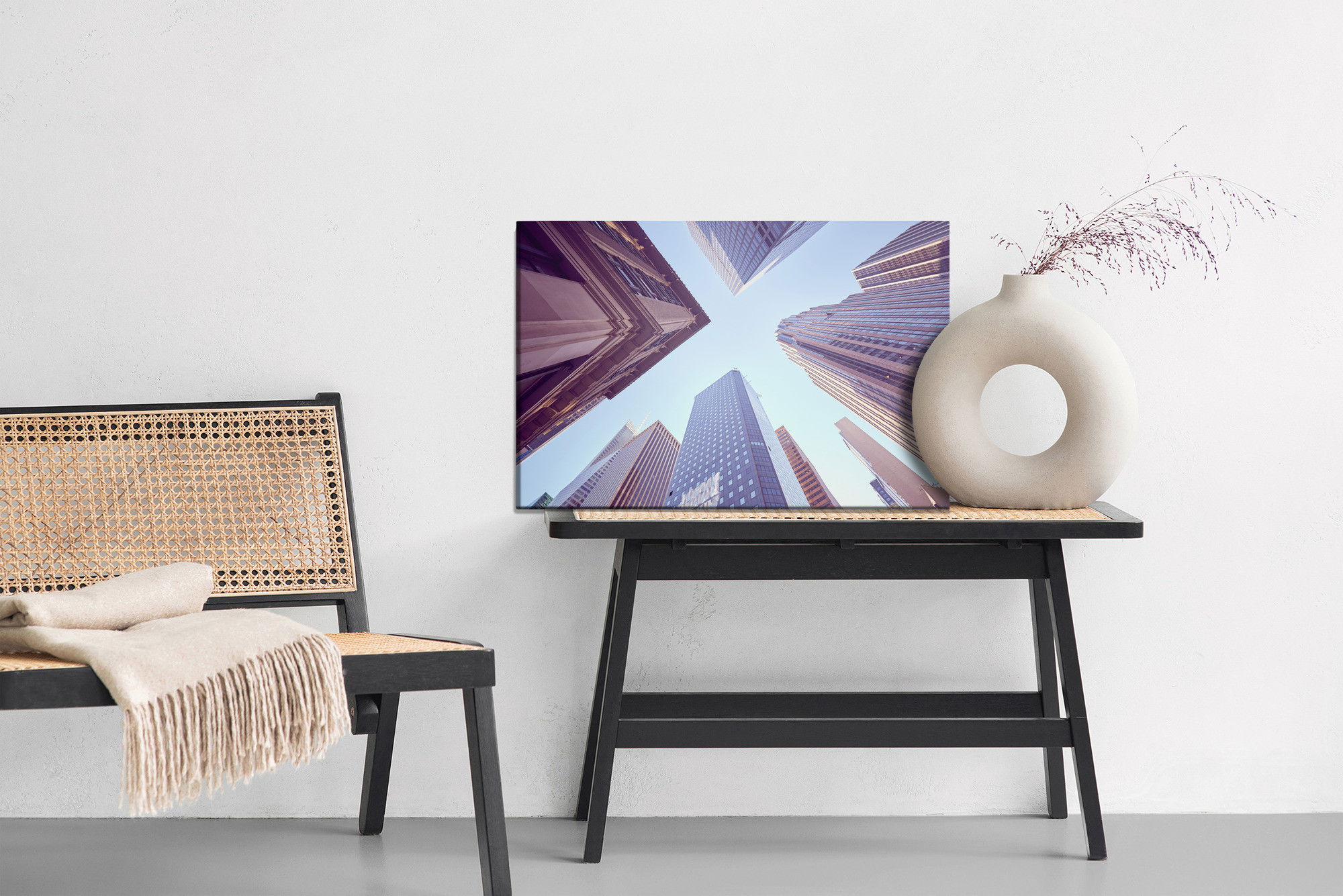 Varje tavla monteras på en massiv fururam. Format upp till 70×50 cm har en ram på 15 mm, medan format från 90×60 cm och uppåt har en ram på 20 mm. Den exakta dukspänningen gör att tavlan håller sin form över tid. Motivet New York skyscrapers trycks runt hela ramen vilket ger ett stilrent galleriuttryck där tavlan är lika vacker från sidan som framifrån. Kombinationen av rak dukspänning, rena linjer och korrekt tryck ger en professionell finish.