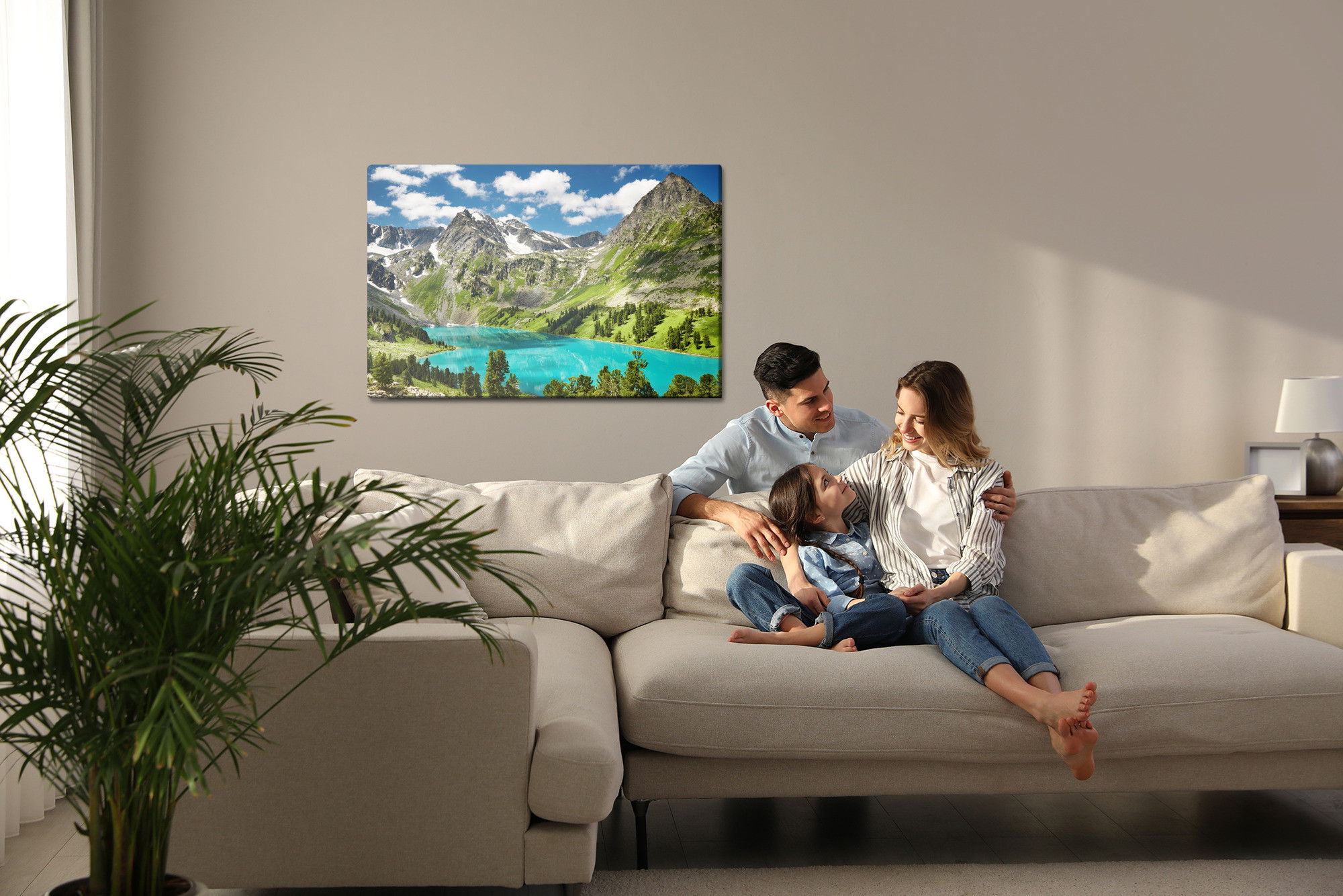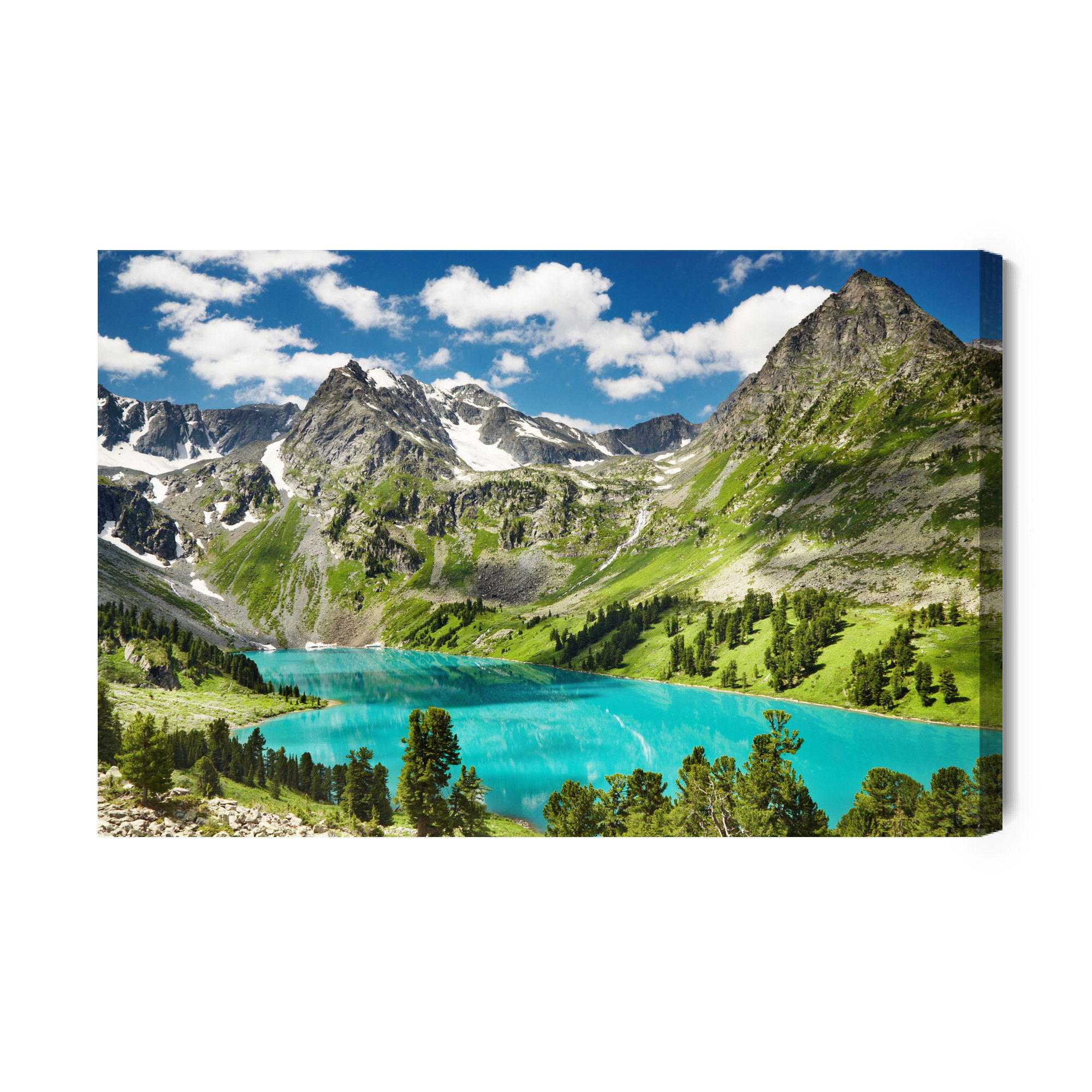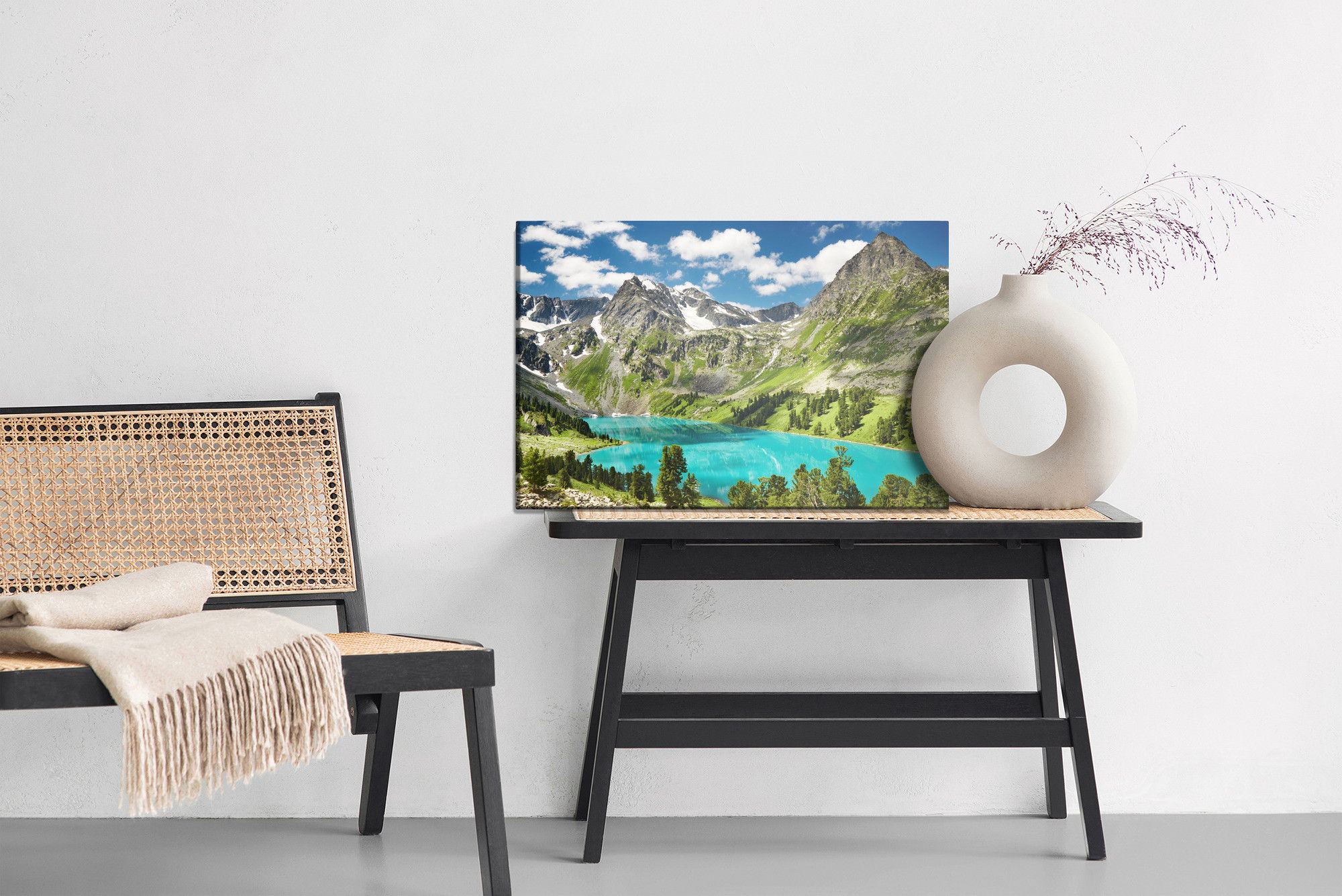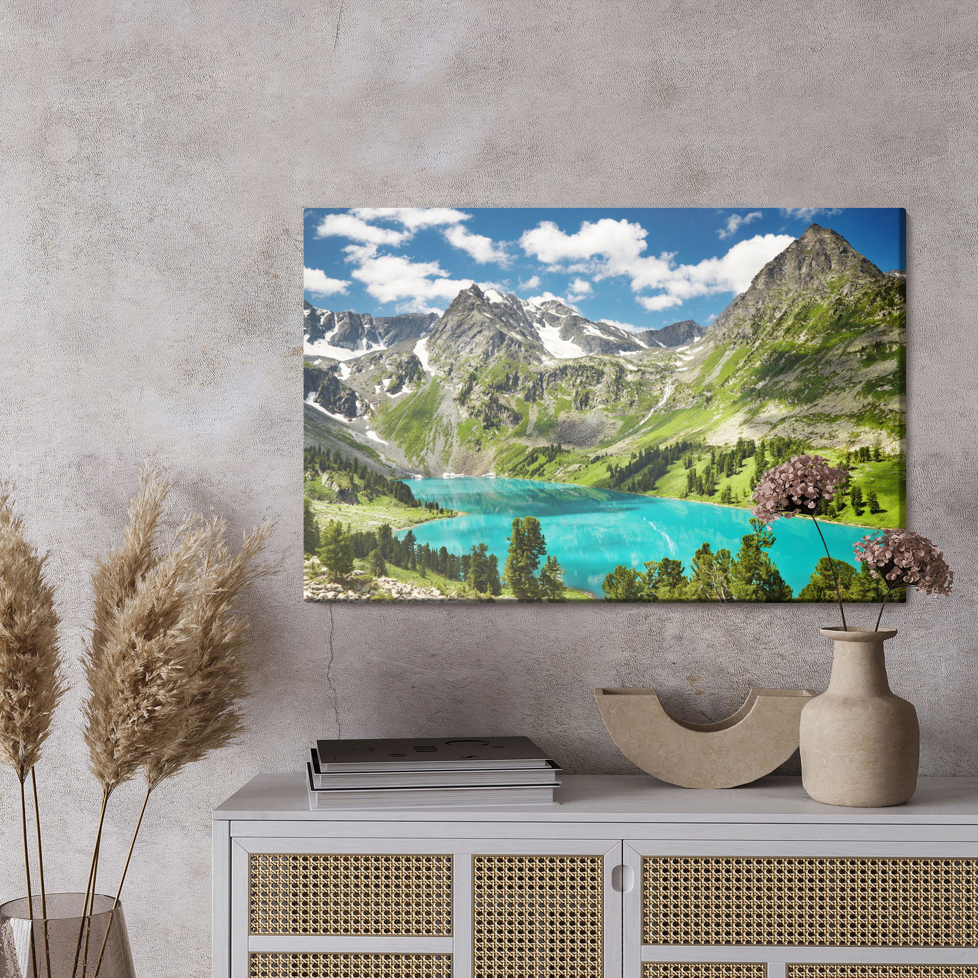 Varje tavla monteras på en massiv fururam. Format upp till 70×50 cm har en ram på 15 mm, medan format från 90×60 cm och uppåt har en ram på 20 mm. Den exakta dukspänningen gör att tavlan håller sin form över tid. Motivet Of the lake in the mountains trycks runt hela ramen vilket ger ett stilrent galleriuttryck där tavlan är lika vacker från sidan som framifrån. Kombinationen av rak dukspänning, rena linjer och korrekt tryck ger en professionell finish.