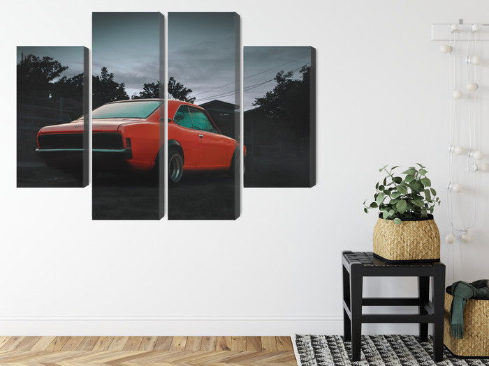 Varje tavla monteras på en massiv fururam. Format upp till 70×50 cm har en ram på 15 mm, medan format från 90×60 cm och uppåt har en ram på 20 mm. Den exakta dukspänningen gör att tavlan håller sin form över tid. Motivet Orange retro car trycks runt hela ramen vilket ger ett stilrent galleriuttryck där tavlan är lika vacker från sidan som framifrån. Kombinationen av rak dukspänning, rena linjer och korrekt tryck ger en professionell finish.