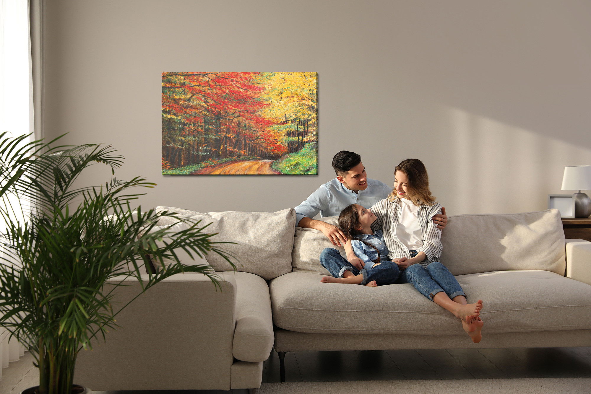 Motivet Path in the autumn forest återges med hög färgprecision och detaljrikedom tack vare HP Latex-teknologi. Trycket sker med vattenbaserade, luktfria och GREENGUARD Gold-certifierade bläck som ger en upplösning på upp till 300 DPI. Färgerna är UV-beständiga och behåller sin styrka även i ljusa rum, vilket gör tavlan lämplig för både hem- och offentliga miljöer.