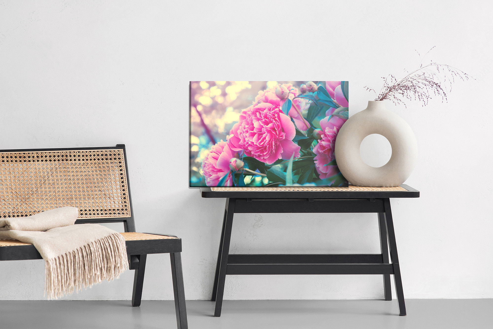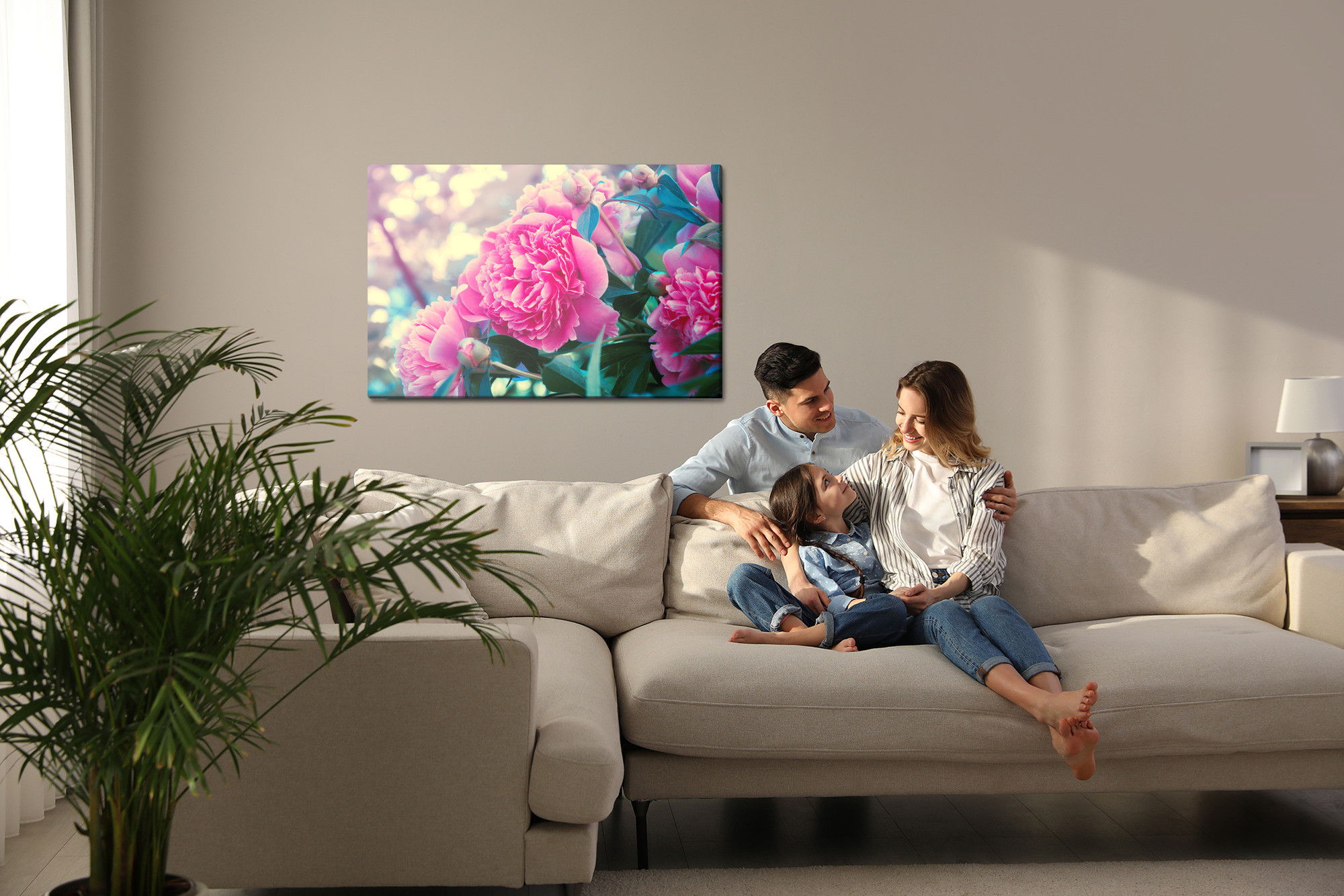 Motivet Peony bush återges med hög färgprecision och detaljrikedom tack vare HP Latex-teknologi. Trycket sker med vattenbaserade, luktfria och GREENGUARD Gold-certifierade bläck som ger en upplösning på upp till 300 DPI. Färgerna är UV-beständiga och behåller sin styrka även i ljusa rum, vilket gör tavlan lämplig för både hem- och offentliga miljöer.