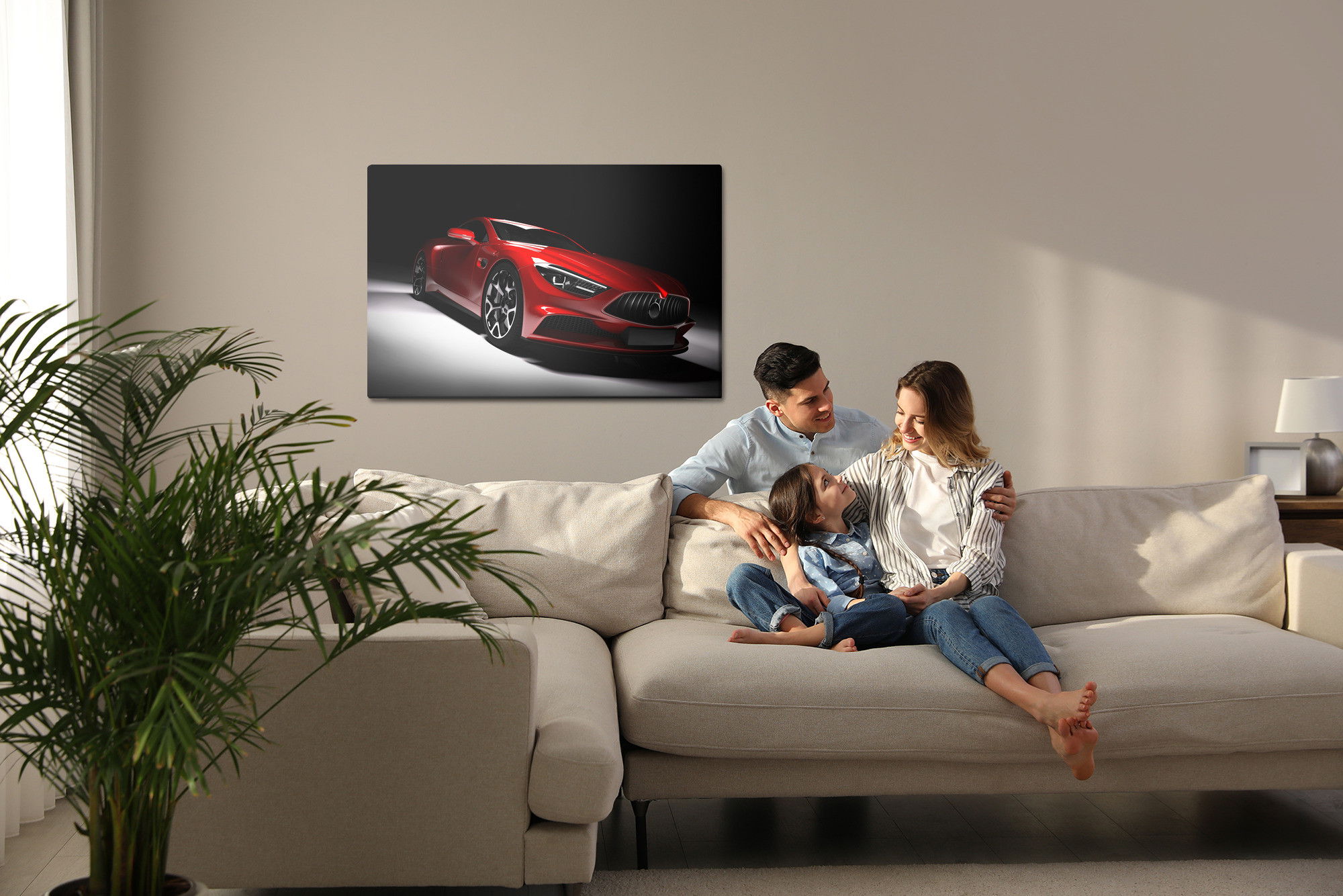 Motivet Red sports car återges med hög färgprecision och detaljrikedom tack vare HP Latex-teknologi. Trycket sker med vattenbaserade, luktfria och GREENGUARD Gold-certifierade bläck som ger en upplösning på upp till 300 DPI. Färgerna är UV-beständiga och behåller sin styrka även i ljusa rum, vilket gör tavlan lämplig för både hem- och offentliga miljöer.