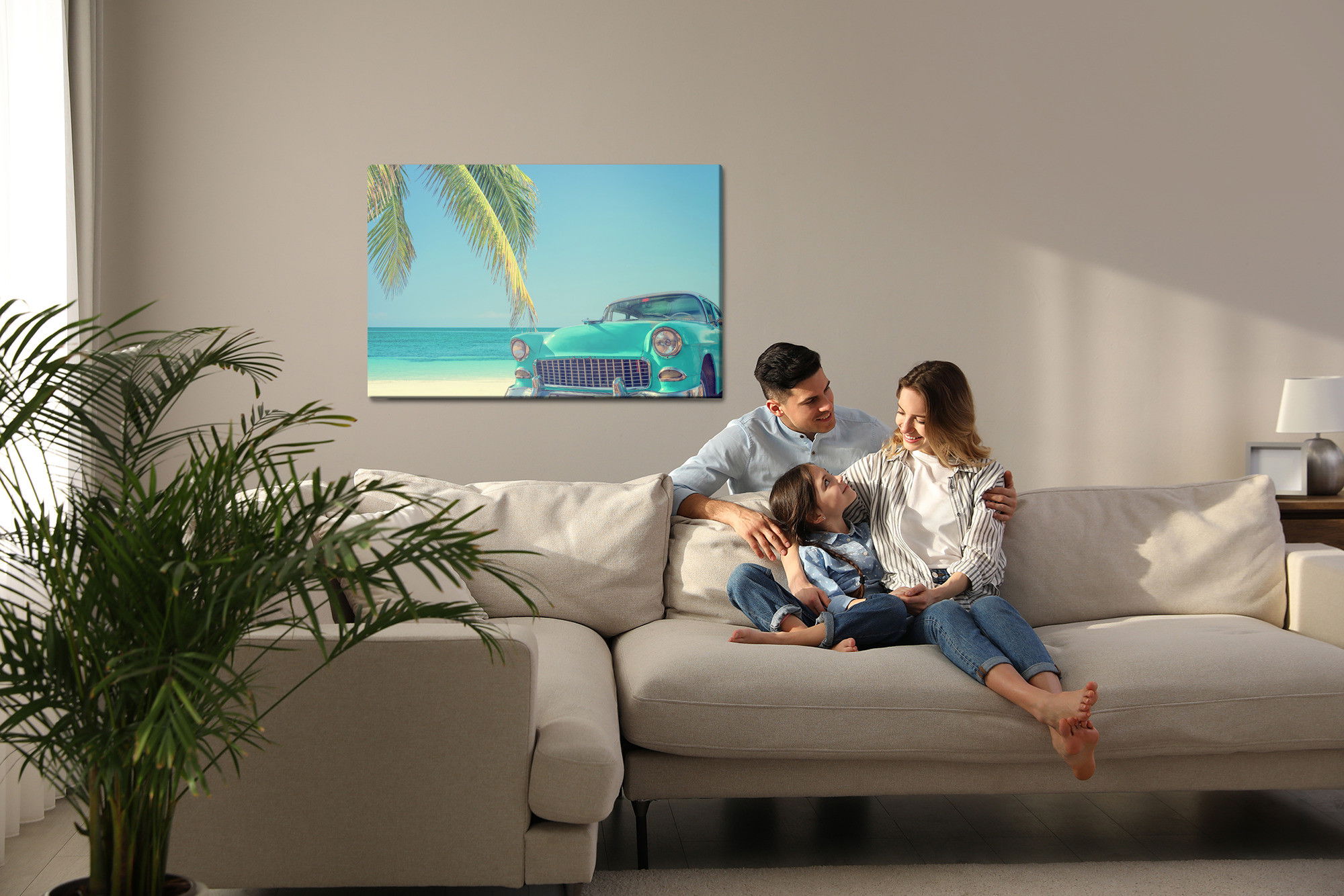 Motivet Retro car on a tropical beach återges med hög färgprecision och detaljrikedom tack vare HP Latex-teknologi. Trycket sker med vattenbaserade, luktfria och GREENGUARD Gold-certifierade bläck som ger en upplösning på upp till 300 DPI. Färgerna är UV-beständiga och behåller sin styrka även i ljusa rum, vilket gör tavlan lämplig för både hem- och offentliga miljöer.