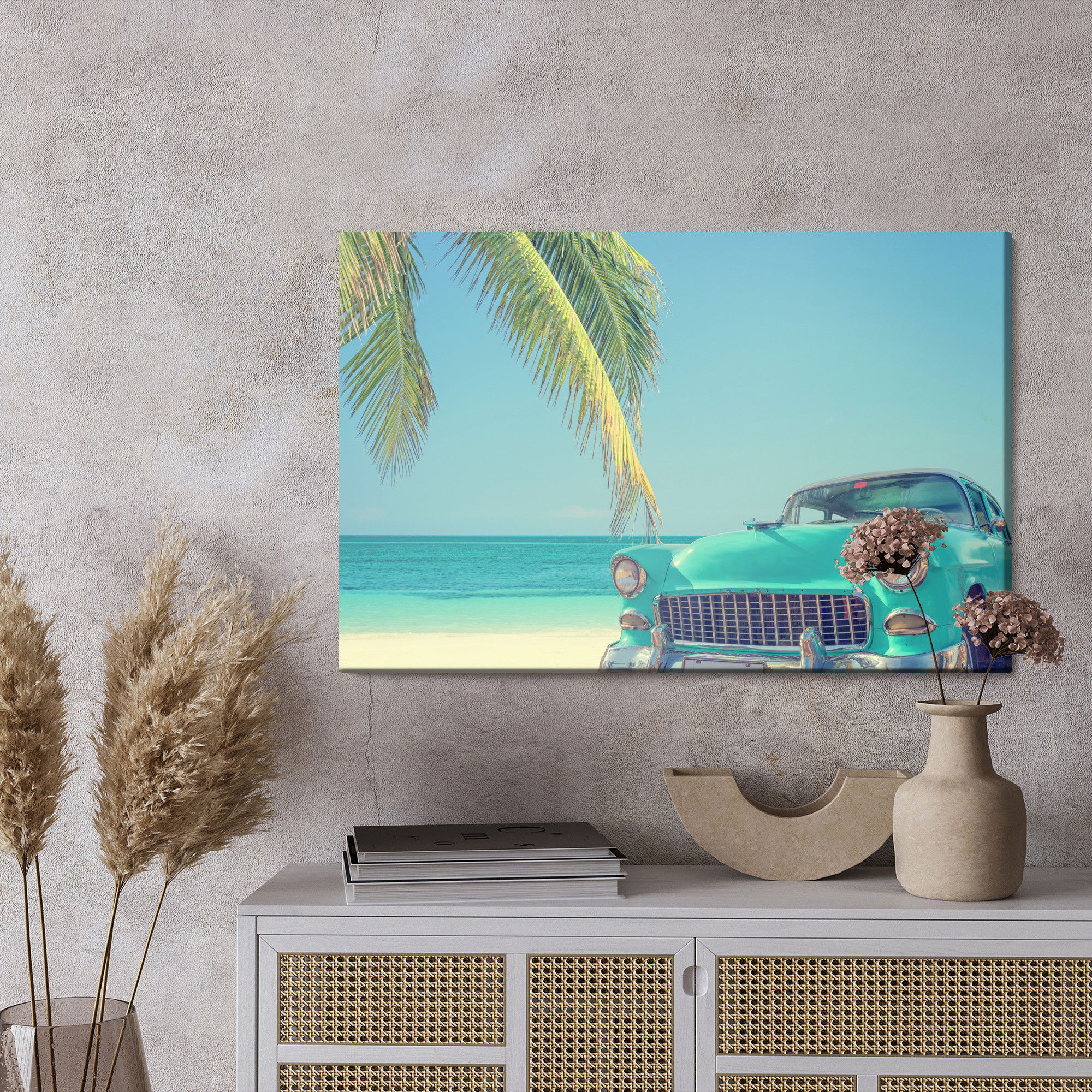 Ljuddämpande tavla – Retro car on a tropical beach för lugnare rum och mjukare akustik
