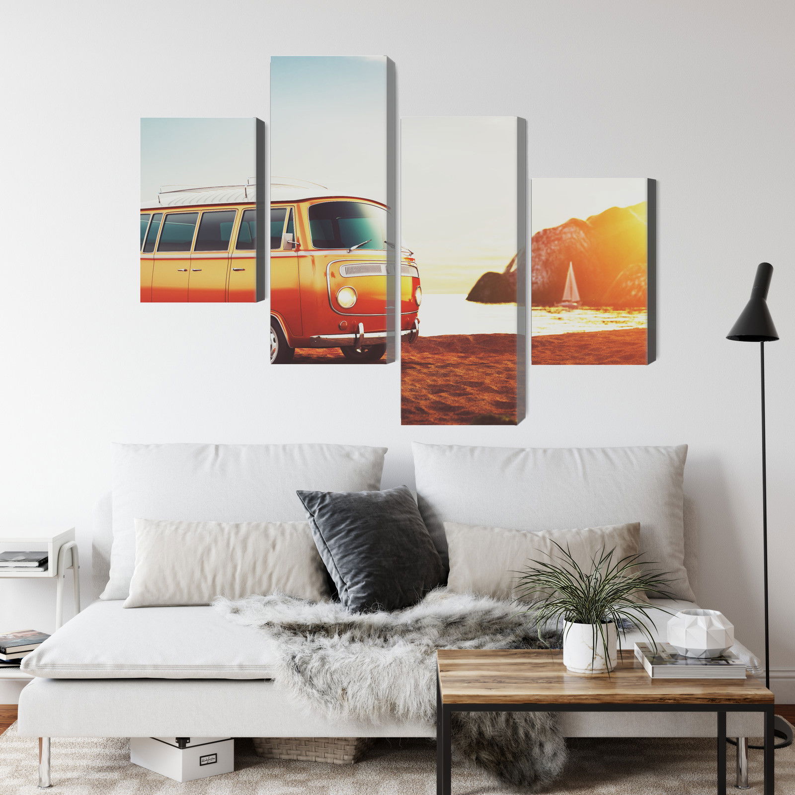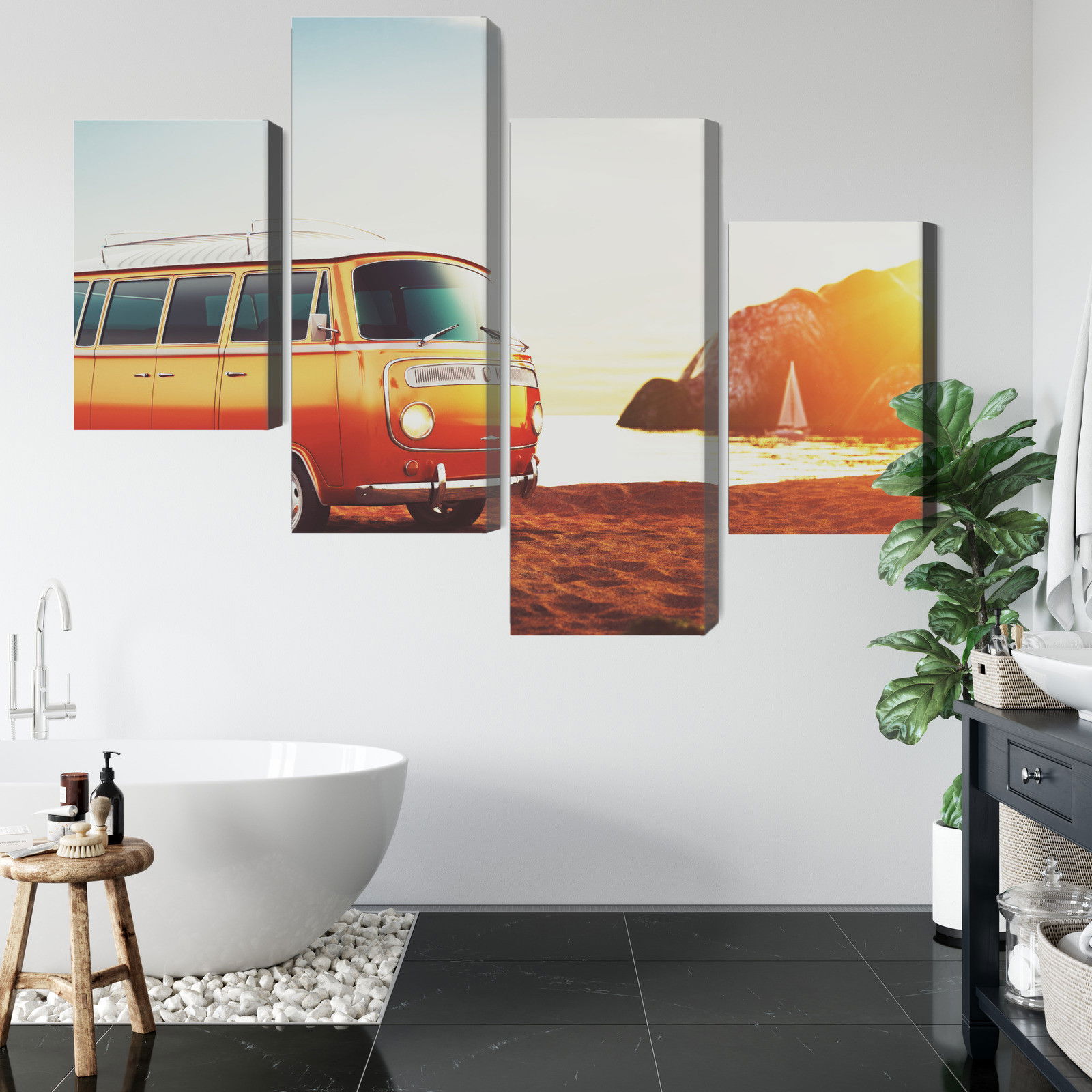 Varje tavla monteras på en massiv fururam. Format upp till 70×50 cm har en ram på 15 mm, medan format från 90×60 cm och uppåt har en ram på 20 mm. Den exakta dukspänningen gör att tavlan håller sin form över tid. Motivet Retro car on the beach trycks runt hela ramen vilket ger ett stilrent galleriuttryck där tavlan är lika vacker från sidan som framifrån. Kombinationen av rak dukspänning, rena linjer och korrekt tryck ger en professionell finish.